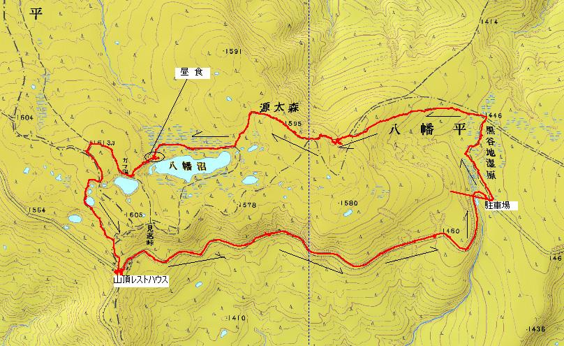 黒谷地湿原駐車場 AM 8:50 〜 源太森 AM 10:15 〜 八幡沼 AM 10:45 〜頂上 八幡沼の辺にて昼食 ガマ沼 〜 めがね沼 〜 山頂レストハウス 〜 八幡平アスピーテライン 〜 黒谷地湿原駐車場 PM PM 2:00