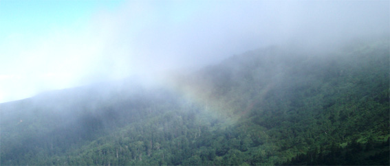 霧雨に降り注ぐ太陽の光が七色に変わり空を染める 全てが之から始まる山旅の序章にすぎないのである。