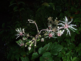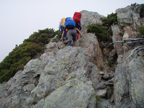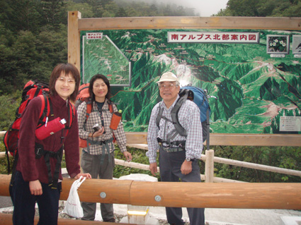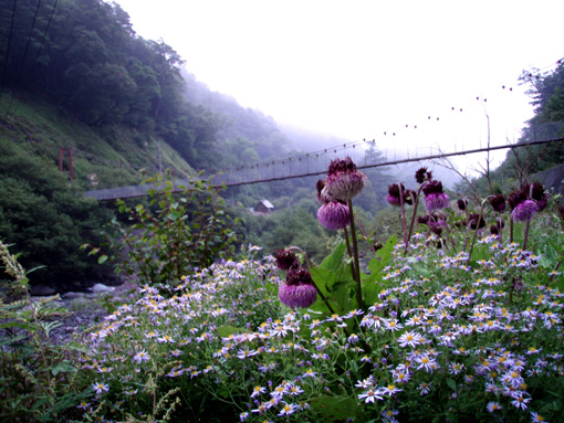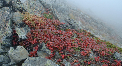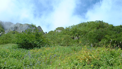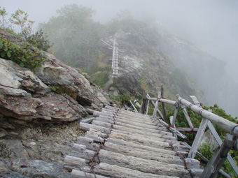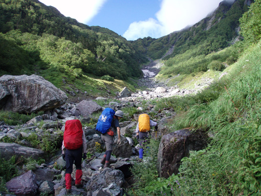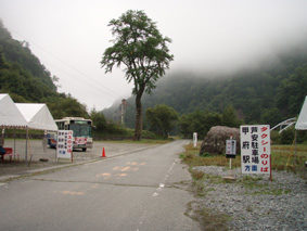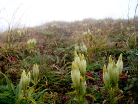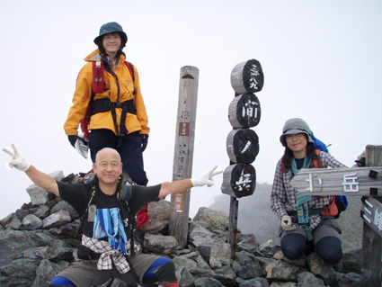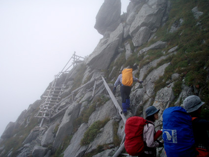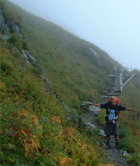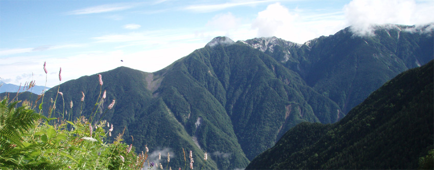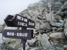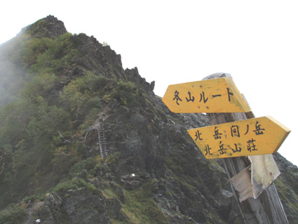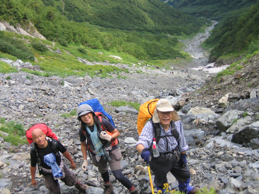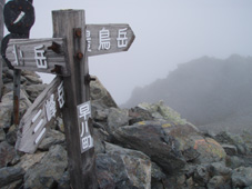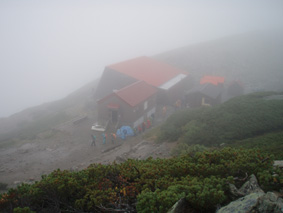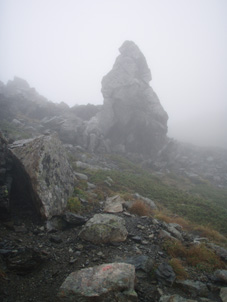 平成18年9月17日3189.3m 南アルプス 天候(曇り) ![]() 北岳中腹から(鳳凰三山) ![]() 16日PM 広河原の駐車場 登山口にて(sakuraちゃん ごんちゃん ARIさん) 広河原山荘 広河原山荘前より吊り橋と花 16日の豪華な夕食にご機嫌な(sakuraちゃんとARIさん) ![]() 17日AM5:10 ヘッデンの灯りで登山道を登る お花さん 最初の休憩場所(左の大岩は家の大きさ位) 朝の内は晴れていたが・・・(>_<) 遠望の八ヶ岳 大樺沢に沿って登る(中央は八本歯のコル) コルより八本歯の頭 ![]() 間もなく梯子場です(SEI〜ごんちゃん〜ARIさん) コルより登って来た梯子 北岳のガレ場を登るメンバー 分岐 ![]() 岩稜に架かる梯子 紅葉のお花畑 戯けるSEI ![]() 間ノ岳山頂(SAKURAちゃん〜SEI〜ごんちゃん) ![]() 山頂を後にして道標 ライチョウさんがお出迎 大岩のオベリスク 北岳山荘 ![]() ![]() ![]() ![]() ![]() ![]() ![]() ![]() ![]() ![]() ![]() ![]() ![]() 16日の早朝に郡山を出発 夜叉神峠の駐車場にPM2:30分に到着した 駐車場に在る宿で前祝いと日本酒で乾杯する 夜叉神峠発PM3:30分のバスに乗り広河原に移動いたしました 広河原の駐車場から林道のゲートを通り野呂川に架かる大吊り橋を渡り登山道の分岐を右に下ると広河原山荘に着く 宿に入り予約をした者ですと主人に話すと ようこそお出で下さいましたと笑顔のお迎えを頂く 台風の影響で殆どキャンセルの電話ばかりで お泊まりはお客さんを含めて5名様ですと何故か寂しそうな顔にも見えた 今日の予定は山荘までの為に時間に余裕が在る 霧雨の降る外ベンチに座り吊り橋越しの絶景を眺めて又も宴会に・・・(>_<) 雨に濡れたアザミ似の大きな赤い花と小さな白い花の彩りが 酔い心に拍車をかけお酒が進む! 絶景も夕闇に隠れて夕食の時間になりテーブルには豪華な食事が並べられた・・・おやすみなさい・・・(*^_^*) 17日は4時起床 朝食を済ませた私たちはAM5:10ヘッデンの灯りを頼りに登山道を登る 暗い夜道に一輪の花を見つけカメラに納める 御池小屋の分岐を過ぎた頃 ごんぞうさんの体調が?様子を見ながらスローペースで進む!二俣の分岐に差し掛かる頃に回復した 此処から先はお花畑が続き広がる空間に刻々とガスが動き消える様が手に取るように解る展望だ 大樺沢に沿って開けた登山道を進み前方を見ると数名の登山者がガレバを登る姿を確認出来た 青空が広がる稜線には間もなく着くだろう 私たちが着くまで神様ガスのカーテンで閉めないで下さいの願いも虚しく・・・・でした。 開けた大岩の沢沿いから離れダケカンバの林に入ると八本歯の梯子が待っていた 下山してきた登山者と挨拶を交わし話す これからが胸突き八丁・・・九丁・・・十丁と続きますよ・・・ん〜 登って行き登山者の言葉を理解した ようやく八本歯のコルに出る 願いも虚しく展望はガスの中 微かに見える八本歯の頭を遠目に見て岩稜を進む 山頂と間ノ岳の分岐を過ぎると急斜面に架かる梯子が現れる 岩場には遅咲きのお花と草もみじの競演が見事だ! 進むことを忘れたかの様に道草の鑑賞にふける・・・山並みの視界を閉ざす神様の贈り物か。 尾根通しの岩稜帯を下ると北岳山荘に到着した 泊まりの手続きを済ませて間ノ岳へ向かう 既に時間はPM12:30分小休憩の後に食事を取らずに出かけた 流れる雲の層に行く手を邪魔され小ピークが繰り返し現れる登山道 数十メートルの視界では山容も確認できない 疲れもピークに達してるためか足取りも重くなる 中白峰を過ぎて高度を上げ下げ数回すると間ノ岳に着いた 広い山頂は踏み跡が入り込み付いている 視界のないピークには真新しい道標が横たわって居た ![]() 冷たい風に追われるように山頂を後にする 展望のない登山道では自然と早足に成りペースが上がる 中白峰を過ぎた辺りからシャリバテ気味の体調に気づくが雨が降る稜線で食事は気が進まない そのまま小屋まで戻ることにした 時折強く降る雨の中に動く物を見つける よく見ると白い毛がまばらに出てる 数羽の雷鳥がハイマツの実をついばむ姿 風格のある1羽が警戒してるのか岩の上で私たちを監視してるようだ PM3:30分小屋に戻る シャリバテの体は重く気持ちが悪い これで二回目のシャリバテに自己管理の甘さを痛感! sakuraちゃんとGonちゃんの元気な姿を見て反省でした 小屋の食事を済ませた私たちは宴会もそこそこに切り上げ部屋に戻る 消灯前に眠りにつくのは初めてか・・・? オールドパーをARIさんから頂き小さく宴会 (^O^) を楽しんだ PM7時頃から雨音が激しくなり台風の影響が強くなる 強風と共に部屋の屋根裏から雨漏れが始まりポタンポタンと滴が 小屋のスタッフにバケツを3個借りて応急処置 昔の我が家を思い出す一こまに笑いが!出た 台風の影響により明日の下山は無理かもと相談し眠りについた・・・暴風雨が山小屋を叩きつける・・一晩中・・(>_<) 明日の北岳に続く・・・SEI・・・ 戻 る |
