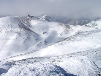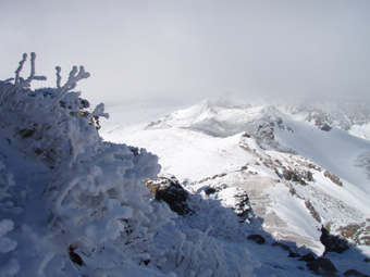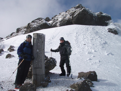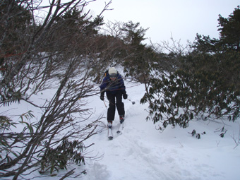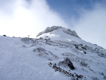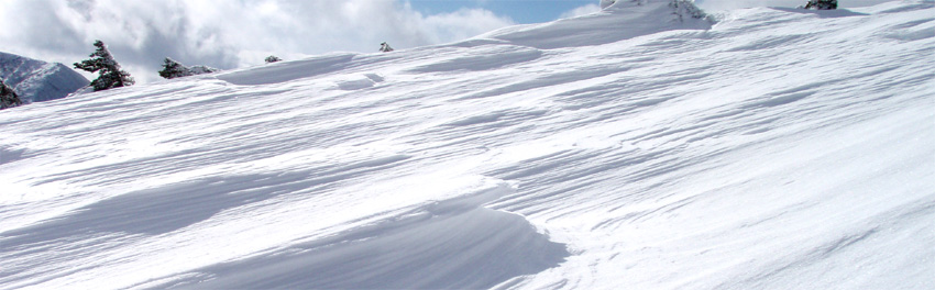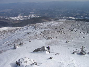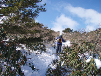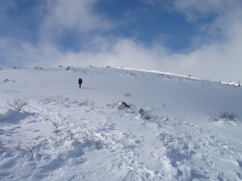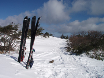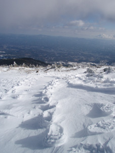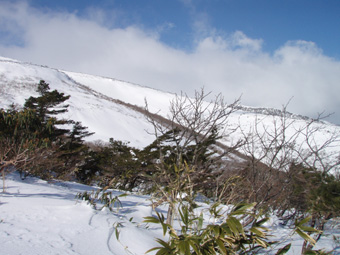 ![]() 左から 安達太良山山頂〜矢筈森〜馬の背〜鉄山 ![]() 薬師岳登山口 雪面には小動物の足跡 ![]() 影絵で遊ぶGONちゃん 通年は雪の下に(シャクナゲ)なってる ![]() 殆ど藪のため登山道に沿って上る 勢至平方面を望む ![]() 奥に見えるピーク(前ヶ岳) 山肌が出てる山頂方面の風景 ![]() 仙女平分岐にて 道標(通年は殆ど雪の中) ![]() 籠山方面の斜面は白く輝いていた まもなく山頂 ![]() まだら色の和尚山 鉄山への稜線 ![]() 船明神山方面の雪景色 山頂の碑 ![]() 山頂にて(GONちゃん〜SEI) ![]() 山頂直下は岩が露出 振り返り山頂を望む 強い日差しを受ける雪面と暴れる雲 ![]() 山頂の道標より峰の辻に下る様 ガリガリの雪面に戯れるSEI ![]() 藪を縫うように下るGONちゃん ![]() 風紋のあれこれ ![]() ![]() 今年初めてと言うかシーズン初の山スキーに安達太良山に来た 予想通りの雪不足 シールを付けて登山道に沿って上る しだれる枝に行く手を邪魔され歩きにくい シャクナゲが雪の上に顔を出してるために傷ついてる木々が目立つ 避けようにも避けきれず枝の上にスキー板が上がる 心で呟く!ごめんなさいと 人と自然の繋がりの中で生かされてる事に感謝しながら溶け込む白い山肌に! 降り注ぐ強い日差し わき出る汗 無風の木立の中で 風を求め彷徨う影絵 なぜか素直に影を追う視線 単純な動きに喜ぶ不思議な心 たわい無いことに爽やかさを感じる 厚手の衣に身を包む季節 Tシャツの中に!今 木立に積もる雪は1m位 3mはあろう木々が埋まるにはまだまだ先のようだ この分では過ぎゆく季節に追いつく事は出来ないだろうと半ば諦めの気持ちに成る 仙女平まで来るとようやく木々が雪の下に隠れる ここからは斜度が増し雪面はカリカリだ スキー板をデポして坪足で登る 堅い表面に沈むこともなく歩きやすい ここで初めて一人の登山者と会う 山頂に辿り着くまでに3名の登山者と挨拶を交わす事が出来た 山頂からの遠望は利かず白い峰を見ることは出来ない 暴れる雲が勢いをつけて押し寄せる 稜線を隠し安達太良山のシンボル(乳首)も視界から消える そして現れる、暴れる雲間から繰り返される神秘の景色が 山頂直下はゴロゴロと岩が出てる 峰の辻方面の斜面はうっすらと被る程度の雪景色 くろがね小屋まで滑降できるのはいつの事やらと恨めしそうに眺め佇む 目に留まる籠山の斜面を追うと其処だけは銀世界の異空間でした 休憩もそこそこに下山 燦々と落ちてくる日差しに雪面に描かれた風紋が浮かぶ、綺麗だ 色々な形の風紋がキラキラと反射する 広い雪面に深い層を成す造形 吹き荒れる暴風も過ぎ去れば素晴らしい置き土産を残す 自然の力は限りなく そして全てを浄化し優しさと厳しさを諭す 浮かれた心で鼻歌交じりに下ると板をデポした位置に到着した ここからはスキーモード と 言いたい所だが木立を縫うように滑るには技量が無い 登りも下りも変わらぬスピードで薬師岳登山口に着く 休憩を40分ほど取りゲレンデを下る ゲレンデは草やごろ石が至るところで邪魔をする 雪面はカリカリでエッジが利かず転倒数回のSEI これほどまでにスキーが下手だったと気がつくのが遅かったと反省しきり ゲレンデを数回滑り返し一日を終えました たっぷりと積雪の山を空想して帰途につく 今日山で在った人は合計6名でした ありがとう穏やかな一日に ありがとうまた来ます 安達太良山へ ・・・・SEI・・・ 戻る |