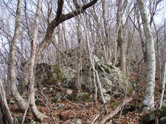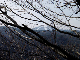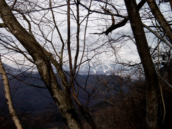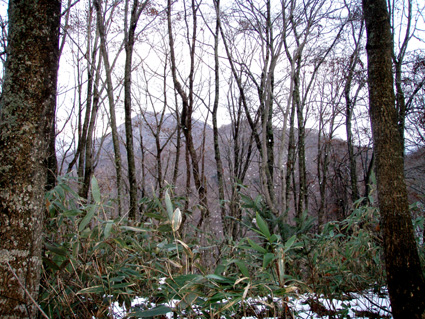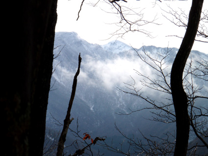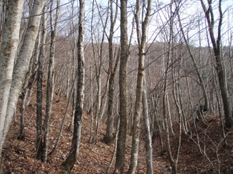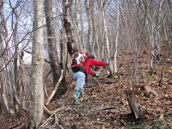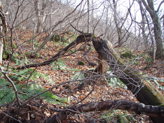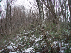 ![]() 今回登った稜線(山頂はピークの陰です) 2日はデコにスキーの予定でしたが屋根を叩く雨音に腰が引けて中止する 山小屋でくつろぎ微睡んでるとお昼近くに雨が上がった このまま行動を起こさない手はないな〜と スキーにするか山にするか迷うが何れ時間が中途半端だ! そこで以前から興味を持ってた白布山の稜線まで登ることにした ![]() 登り口の渓流 ブドウが散乱してた中腹 登り口の渓流を渡り急斜面を登る 登り初めて一時間ぐらいの斜面にブドウが散乱してる 上を見上げるとブドウのツルに未だに実を付けてるのを確認できた。 ![]() ブドウのツル(まだブドウが在ります・・?) 倒木が多い 木々には太いツルが絡まりブドウ棚が入り組んでる 美味しそうに熟したブドウ・・・しかし手の届く所にあるブドウは殆ど落ちてました ![]() 見た目より急な斜面です グランデコスキー場が見える 急斜面をひたすら登る 木々の空間からはグランデコスキー場のコースが見える 一休みをして下界を見下ろすと川上温泉の湯の宿が見えた ![]() 熊棚 熊の落とし物(集中して5カ所に!) ![]() 熊の爪痕(木の上部まで剥がされてた) 中間に少し平らな場所がある 其処は熊のたまり場らしく熊棚や熊の落とし物そして極めつけは爪痕だ ブドウが豊富で稜線には笹藪があり熊の住居には最適と思われる ん〜〜春先の稜線越えは相当の覚悟が欲しい・・か・・? (残雪の稜線は歩きやすい) ![]() 稜線より(猫のゲレンデ) 裏磐梯の風景 稜線に出ると猫魔のコースも飛び込んできた 左に視線を移すと裏磐梯の勇壮が雲間に浮かぶ! ![]() ブナの木立 斜面の大岩 白布山に巨木は見られない山頂まで辿れば景観は変わるのか今後が楽しみだ 楢とブナの入り交じる山肌が続く ![]() 稜線は笹(背丈ほど在ります)で覆われてる 稜線より白布山(まだまだ先です) 最初のピークまでもう少しだが笹が邪魔して歩きづらい 時間も登り初めて一時間半を過ぎる 下山して仲間の待つ小屋に遅くても三時までは戻りたい・・・ 今日はここまでと折り返した。 ![]() 折り返し地点の風景 眼下には檜原湖が見える 稜線も木立で覆われ風景は林間からのみの眺望です 展望は無いと思われるが登山道のない気になる山のピークにたどり着きたい ![]() キノコを発見(左のキノコはムキタケ〜右は・・?です) 今の時期か冬期にしか藪で登れない山(藪こぎが得意の人は別です) 稜線まで一時間半で山頂までの推定時間はプラス2時間半とすると下山を入れて 約七時間と予想される(SEIの個人的な体力で判断) 次回の挑戦は何時になるか楽しみだ。 戻る |