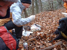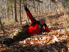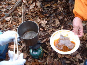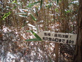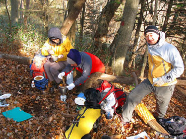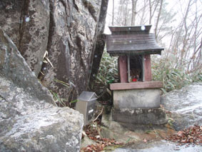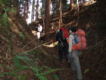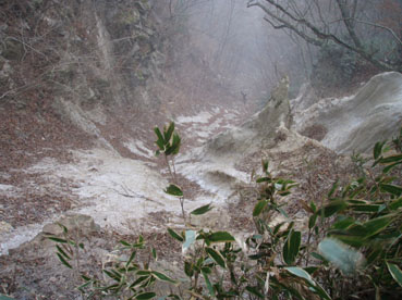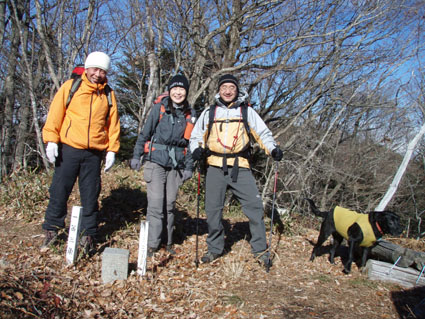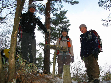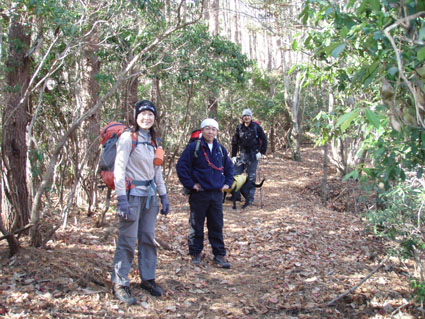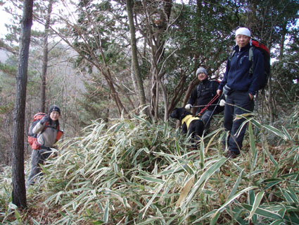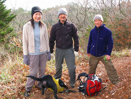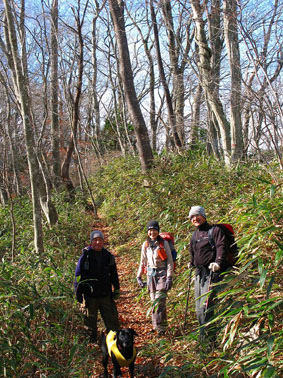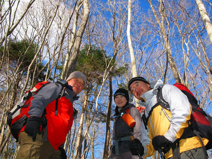 ![]() 大穴登山口にて(タッシー・SONE・GON) なぜか山開きの幟 小高町に在る懸の森山に久しぶりの里山登山である 寒気団が東北を包み込み天気予報は雪マークが多い そんな中、日差しを求め太平洋側の低山に訪れた。 大穴登山口より周回コースを歩くことにした 登山口には山開きの幟があり鳥居を進み登山道へ辿る ![]() 登山口の案内板 杉林を登る 登山口の案内板で現在地を確認した(地図には懸の森山は載ってない) 杉林が続く登山道をしばらく進むと雑木林へと山肌を変える ![]() 分岐 鉄塔の見晴台 分岐の道標を通過すると鉄塔のある見晴台に着いた 見晴台は眺望が良く、原町火力発電所から上がる白煙を始め町並みや太平洋の海原を眼下に見ることが出来る ![]() アセビの小径を行く 懸の森山 アセビが並ぶ登山道には日差しが零れ汗ばむくらいの陽気になる 汗を拭い落ち葉の敷き詰められた登山道を気持ち良く進み 稜線から少し外れ懸の森山の見える場所へ道草だ 鉄塔のある開けた位置からは懸の森山のピークを確認する事が出来た ![]() 休憩(Sakuraがじゃれる) 楢林の日だまり 灌木の根元が笹で覆われた登山道の日だまりで休憩をする 汗ばむ体に必要なのは水分と・・ビールを取り出し回し飲み うめ^^い 缶ビールは直ぐに空になりました ![]() 分岐 座頭ころがし ↑ です(急斜面の谷) 次に現れた分岐を過ぎ 小径を進むと座頭ころがしと言う不気味な案内板を発見! ロープが張られた谷を覗くと深く切れたV字の斜面が不気味に誘い込む気配がする 長居は無用と現場を後にした・・・・(笑) ![]() 山の神の祠が奉られる 胎内くぐり(ほんとにくぐれるのかな) 山頂は直ぐ其処と言う小さな案内板を通り越し 山の神の奉られてる祠に到着・・祠は大きな岩に守られてる その姿に安らぎを頂くことが出来た 山頂に向かうと直ぐに胎内くぐりの場所に出る SONEさんが挑戦するがくぐるのは無理と断念 穴の反対側に回り込み顔を出すが写真でその姿を見ることは出来ない(岩の向こうにSONEさん) ![]() 山頂にて(タッシー・Gon・SEI) 木株が凍る寒さ 山頂に着く頃になると天候が一変して吹雪いてきた 気温が低いために粉雪のようなサラサラの雪だ! 西の空は雪雲で覆われ荒れてるのが解る 風も強くなり山頂を短時間で後にした ![]() 立石展望台手前にて(Gon・タッシー・SONE) 少し下り立石展望台に着くが先客が居たため 昼食の場所を少し先にした 一等三角点のピーク手前の窪地でBBQ宴会の準備に係る ![]() ![]() ![]() ![]() BBQ宴会が始まる(焼き肉・モツ味焼き・焼きそば・ホットワイン・ビール・他) 稜線上で吹き荒れてた風も此処までは追ってこない 風の当たらない位置にコンロを置く場所を作り 食材を出すとSakuraがキラキラと眼を輝かせ訴える どうやら食料に惑わされ落ち着かない様子だ くるくると回り落ち葉のジュウタンにsakuraが戯れ料理の邪魔をする 食材はタッシーとSONEさんが準備してくれ SEIはフライパンとガスを頼まれた いざ料理に係ると な なんと・・・SEIが持ってきたガスは直ぐに使い果たしてしまったではないか 急遽タッシーのガスでBBQ & モツ味焼き & ホットワイン & 太麺焼きそばを作る・・・が・・・そのガスも使い果たした しかし全ての料理を危機一髪 完食することが出来ました ![]() SEIは完全防寒でした 昆沙目木にて(SONE・Gon・タッシー)〜Sakura 満腹の私達は一等三角点の在る昆沙目木に立ち寄り 一等三角点を標識に記念写真を撮る ピークの落葉した林間からは格子越しに見る絵のように展望を楽しむことが出来た ![]() 日だまりに転がる忘れ物・・・(>_<) ![]() 開けた場所から日山方面 下山する頃になると先ほどまでの吹雪も静まりかえり青空も広がる 遠望には阿武隈の山々が連なり気になる尖りが目に付く この地域は雪の少ない山歩きに最適と改めて感じた ![]() カメラ小僧SONEさんのアングル(青空と・・・・) SONEさんが急に寝ころんだ ん〜〜〜何すんの ・・・ このアングルが最高と菊地晴夫バリの姿勢でシャッターを切る姿がなぜか滑稽に見えた ![]() 林道にある道標 渓流のたまりに落葉の遊び場を見つけた 林道を下り登山口に向かってると数台の車が林道を上ってきた 運転してる人を見ると狩猟に来た人の様である 次から次と車が上がってくる皆さんお揃いのハンターチョッキを着込み集結してるところを見ると 獲物が現れて号令が係ったのか・・・・32歳まで狩猟をしてたSEIは懐かしく姿を追った 日だまりを求めて来た暖か地! 懸の森山の四時間三十分の山旅もPM2:00に終了 下山口に程近い温泉で汗を流し帰路につく タッシー SONEさん Gonちゃん お疲れ様でした 次回はスキーで会いましょう 戻る |