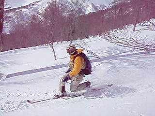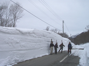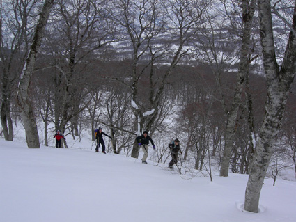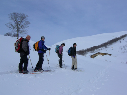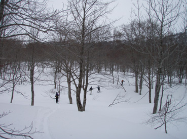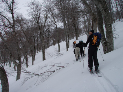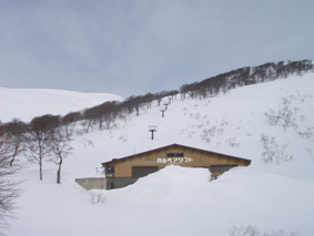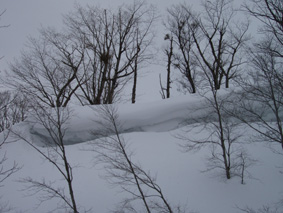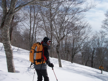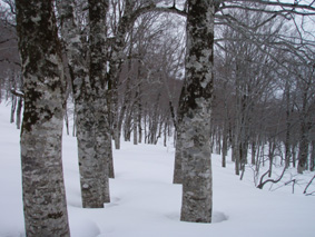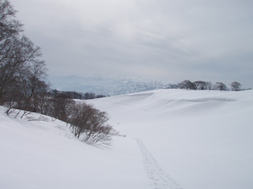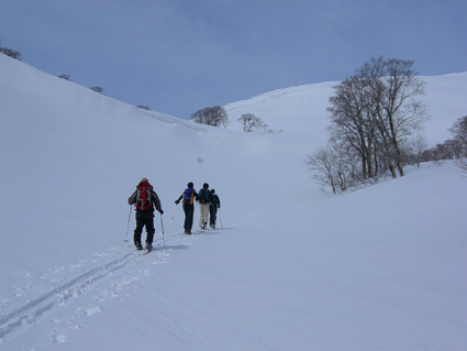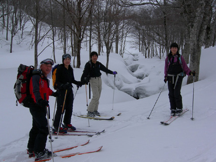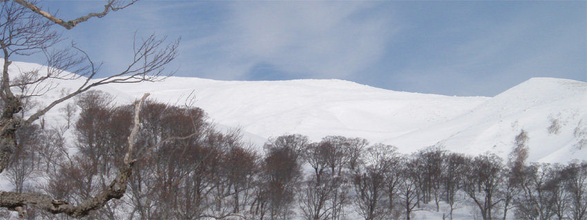 ![]() 雪の回路を進む 遠望の湯殿山 しず温泉の終点に作られた臨時の駐車場に車を止めてネーチャーセンターに向かう 無風に近い穏やかな日曜日 月山を目ざし登り始めた ![]() 道標に手の届く位置まで積雪がある 雪庇が張り出した尾根 藪が埋まるブナ林 滑降が楽しみだ 湯殿山と月山の分岐にある道標はあと2m位で埋まる まだ青空こそ見えないが汗ばむ陽気に言葉も弾むメンバー 仙台の仲間 SONEさん HIROちゃん TAKEちゃん 福島のごんぞうさん SEIの5人組 動物の足跡を見てはウサギかイタチか鹿か・・・ん〜〜熊 と思い思いの感想に当てはまる動物は居るのか みなさんもっともらしい珍回答に笑いが (*^_^*) ブナ林にこだまする ![]() 沢に型どられた造形をみてSONEさんが記念写真を撮る 美味しそうなブナの斜面に並ぶ SONEさん最近カメラアングルが上手いね!SEIが教えたからかな?と自慢げに語る (本当はSONEさんにカメラアングルを習ったSEI) 林の中は少し最中気味の雪に不安な所もあるがブナ・ブナ・ブナの景色に心はうきうき目はキョロキョロと彷徨う姿 本当に厳冬期の2月なのか 荒れ狂う月山に二年前に来たときにはホワイトアウトで行く手を拒まれたことを思い出す ![]() ウサギが食事をした跡が残りお土産も置いて在りました 綺麗な肌のブナ 遠望の湯殿山 動物の足跡を追ってると低木の皮がはがされて居ました 食べるものが無い厳冬期には木々の皮を食べてる動物 吹雪いてるときや夜は何処にいるのかな ? 寒くないのかな ? とGONちゃんが独り言 ブナ林が続く斜面の間から湯殿山の真っ白い稜線が覗く ![]() 間もなく姥沢に到着する位置まで来た 4月からの連休からは賑わう姥沢(今は4〜5mの積雪がある) 姥沢手前の急斜面を登る此処まで来れば時間が読めると余裕が出てきた 姥沢に着けば二階作りの建物も一階は雪の下 屋根の上にも多いところは2m位の積雪がある 建物の持ち主らしい方が屋根の雪下ろしをする姿が見られた。 ![]() ![]() ![]() ![]() 姥沢にて食事の面々 ![]() 姥沢小屋 月山リフトが埋まって居ました(運行は4月末 ? ) 011姥沢を行く 食事の後に姥ヶ岳を目ざし登る 姥沢小屋は余り雪が被らないのか一階部分も見える 月山リフトは二階の部分まで隠れ営業はまだまだ先と休業時期を楽しんでるかのように落ち着きをみせてる 沢を登るほどにクラストしてる斜面 最中と交互して現れる斜面に滑降の姿が過ぎる(大回転・・(*_*)) ![]() 穏やかな真冬の日差しが眩しい(SEIの頭も眩しい) 姥沢を振り返る 背景に姥ヶ岳の白い斜面を捕らえて並ぶ ここからは心地よい風が頬をなでる谷筋を登ることになる 登るほどにカリカリの雪面 風の影響を受けやすい地形なのだろう斜度を増す斜面にシールが悲鳴を上げて滑る 何の影響も無いよと躍動的に登り続けるSONEさんとGONちゃんの姿が遠ざかるのでした。 ![]() 015姥沢上部より朝日連峰を望む 018真っ白い姥ケ岳 姥ヶ岳の休憩所で撤退することにした 遠望には以東岳や朝日岳の勇壮が峰を並べる 5月になるとお花畑や夏スキーを楽しむ登山者でごった返す茶屋も固く閉ざされ建物は張り付いた氷の衣を纏っている ここは風が強く長居は無用とシールをはがし下る 遠望の蔵王は雲の上に雪化粧の姿が浮かぶ 月山のピークは白い雲に覆われて輪郭が解らない 写真を撮るが白い画面に姿が見えずUPすることが出来ない 姥沢の下りは案の定コントロール不能 踏ん張りが利かず頭から大回転のSEI リフトの下に逃げ込み下る 沢よりはましと滑降するがとても魅せられる滑りでは無い 無惨な滑りに体力が激減し腹が減ったと大休憩を致しました・・・(笑) 姥沢からの下りはブナ林の大滑降 今までの滑りは何だったのかと思うくらいに板が走る HIROさんが華麗に林間を縫うように滑りまくる TAKEちゃんがテレターンを楽しむ SONEさんが豪快に下る GONちゃんが戯けて魅せる大回転と 笑い声が止まない ブナ林は5人の道化な姿を楽しむかのように調和し時と共に流れ時間が消える 安らぎとは全てを忘れ自然と共に戯れることか ? 爽やかに心を動かす午後の一時でした。 ※ SONEさん提供写真あり (^O^) 戻る |
