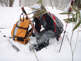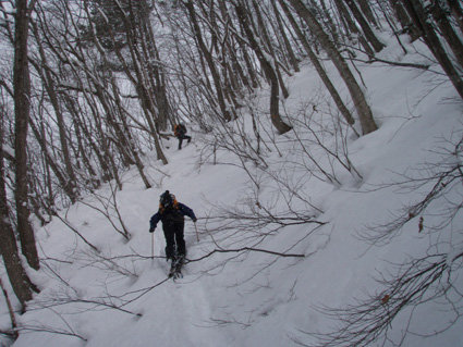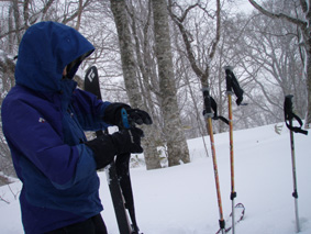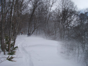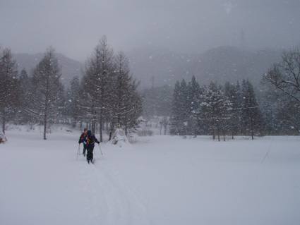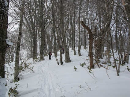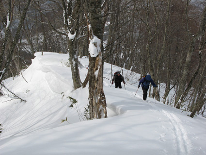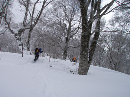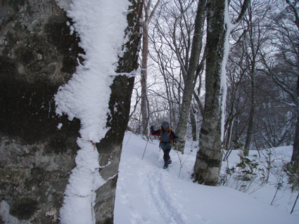 ![]() POWを巻き上げる強風(雪庇の稜線にて) ![]() 大内宿より雪原を出発 小野岳道へ取り付く(Gonちゃん SONEさん) ![]() 神籠ヶ岳方面 新雪が20〜30cm ![]() 登山口へ辿り着く 杉林の中を進む ![]() 杉林を過ぎると急登の連続 Gonちゃん 絶不調のSEI ![]() 稜線より(大内ダム) ブナ&ミズナラの林間(小さな雪庇の付いた尾根を登る) ![]() 1000mを超えて〜1200m稜線になると樹氷の林に変わり強風を叩きつけられた ![]() 樹氷の木々は白に肌を変え厳冬期に戻った様である ![]() ブナと巨木のミヅナラが目立つ稜線に! ![]() シールを無くし坪足のSONEさん ![]() 1223m ピークより滑降 準備をするSONEさん&Gonちゃん 東北の山沿いは殆ど雪の予報 標高差もさほど無く雪崩の危険も比較的安心できる山と言うことで ギックリ腰から一週間目のSEIを気遣い SONEさんが小野岳をPickupしてくれた 郡山を出るころは天気も良く道路も乾いてる 鳳坂峠まで来ると道路は一変し圧雪となり雪が吹き付ける 天栄村から先は時々吹雪きつるつるの道路に変わり 小野岳の麓へ到着するころは ぼそぼそと大きな雪が落ちてきた 山並みも微かに見えるが山は荒れてるだろうと言いつつ登る準備・・・をする 除雪された空き地に車をデポし 畑らしい緩斜面から登り道路を二回横切り夏道の登山道へ取り付く 杉林の中は風もなく汗が出る 上着を脱ぎ新雪の積もる斜面を進む 30分くらいで急斜面になり手強い登り POWの新雪はサラサラと崩れステップが利かず 油断をすると足下が崩れ踏ん張りが利かない 1000mピークに在る鉄塔へ着くころは早々と息が上がる 稜線を進み北手に見える大内ダムを見下ろし1223mピークまで来ると体感温度が一気に下がり寒い いつもなら寒さも感じないSEI ギックリ腰の為動きが鈍くエネルギーが消費されないのか変だ 1333mの撤退位置でホッカイロを体に貼るが寒い 先行するSONEさんへ連絡山頂を踏まず下ることにした 下山ルートへ取り付くにはトラバースをするしかない 斜面を西に方向を変え進む しかし新雪の積もる 無木立ちの斜面は今にも雪崩が起きそうで怖い 此処は安全にと往路を戻ることにした 1183mのコルで休憩をとる いつも足りなくなるビールがまだ二本も残ってる 寒くて飲む気になれない SONEさんもGonちゃんもビールは結構ですと不思議な返事が返って来る! それほどに体感温度が下がって居ました シールを外し滑降開始 狭い林間は思うように滑れない SONEさんは流石に上手い滑りでスイスイと縫うように下る 絶不調のSEIは直立不動の変な滑降で転びまくる Gonちゃんも急斜面で狭い林間は不得意の様で転ける事が多いのでありました・・(笑) 9時にスタートして下山が3時と低山に苦労を余儀なくされた楽しい山でした 林間が狭く山スキーには不向きな地形だと思います(私感大) SONEさん Gonちゃんご苦労様でした 湯野上温泉に浸かり帰途に着く ・・・・SEI・・・・ 戻る |