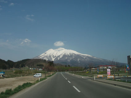 東北道より岩手山 遠望の岩木山(桜は弘前公園)