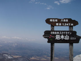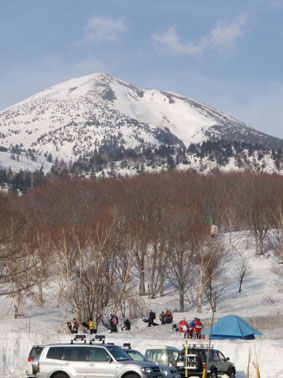 バスに揺られ25分 岩木山八合目に到着 山頂駅のハウスには登山者やスキーヤーが休む姿がある