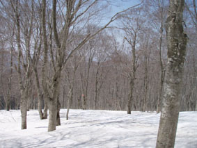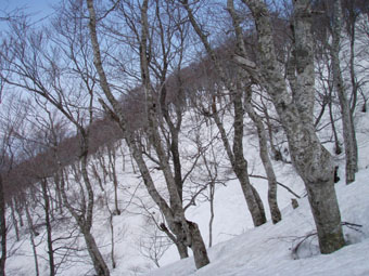 何処lまでも広がるブナブナブナの林 緩斜面のコースを大きく取り林の中を滑降した