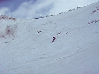 強風の為にリフトが運休してた 山頂に向かう山家さんは点々と白い山肌に張り付く 八合目より上はクラストしてる所があり