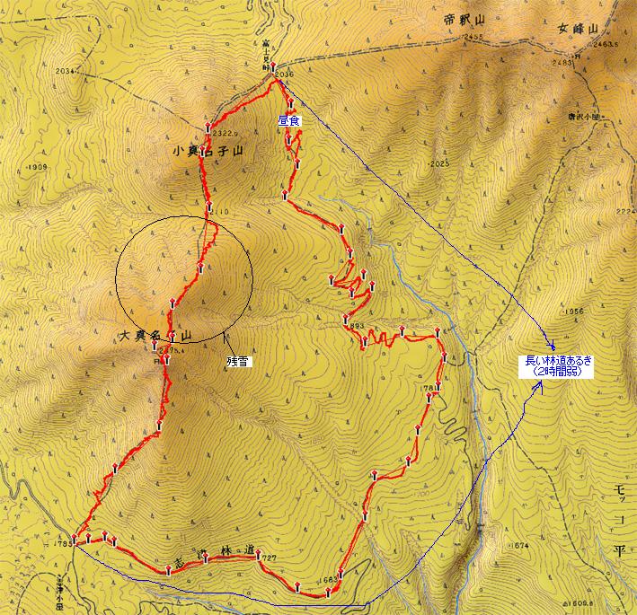 志津登山口 AM 7:00 〜 大真名子山 AM 9:20分 〜 休憩40分 〜 小真名子山 PM12:10 〜 富士見峠 PM1:30 〜 昼食30分 〜 林道歩き 〜 女峰山登山口 〜 林道分岐 〜 志津登山口 PM3:45