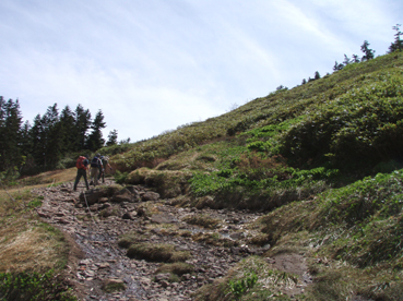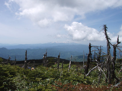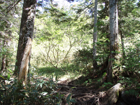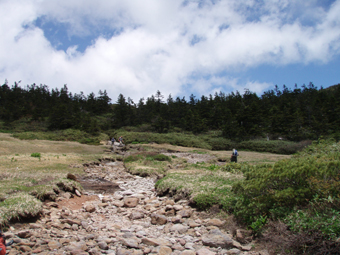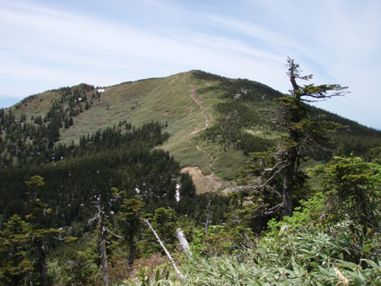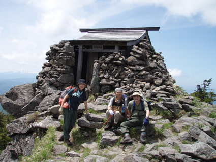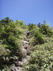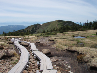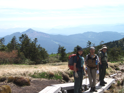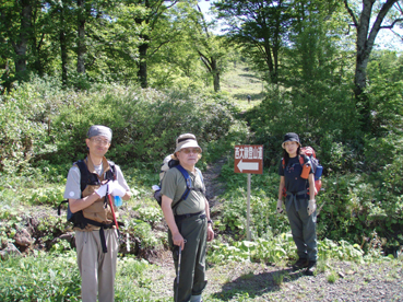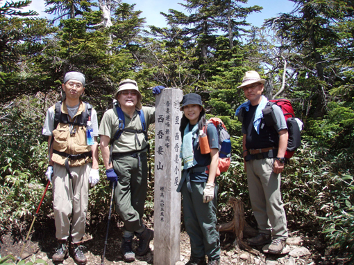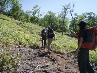 ![]() 磐梯山 入梅時期にこれほどまでの天候は思い出せない 爽やかな風が吹くゲレンデを登り始める ![]() ゴンドラ終点より登山口へ ブナの巨木 ゴンドラの始発はAM8:30 20分前にゲレンデハウスに着き一休み ゲレンデの上を試運転のゴンドラが動き始めた 上空は薄い雲が懸かるも朝から強い日差しが落ちる好天に 登山日よりだねと足取りも軽い・・・出だしだが・・・・? ゲレンデのブナの巨木の脇を進みフキの葉が生い茂る登山道を登る ![]() ゲレンデを登る 根の張りだした登山道 西大巓の急登 冬のゲレンデはシーズン中に数回訪れる見慣れた風景 しかし夏道を上るのは初めて 木々の位置を確認し! 滑降を思いだす 此処で止まり此処からは急勾配の下りだ等と話しながら進む ゲレンデを離れると展望のない灌木林になる 足下にはユキザサが蕾を付けショウジョウバカマが並んで咲いてる 登山道は所々泥濘に足を取られ木の根に行く手を邪魔され 倒木に道をふさがれるなど結構楽しみながら登ることが出来た 偽ピークの急登で一踏ん張りすると間もなく山頂に着く。 ![]() 猪苗代湖を望む 西吾妻山山頂 山頂は360度の展望だ 磐梯山越しに見る猪苗代湖や遠望の山々 所々白い峰が見える燧ヶ岳方面の山容が輝いていた 西吾妻山は冬の景色と一変 緑の衣に模様を替えて佇む(冬の吾妻山)へリンク ![]() チョットお疲れかな西大巓山頂で! 飯豊山 西大巓山頂には数十人の登山者が休んでいました 山頂のパノラマを楽しみ小休憩で西吾妻山に向かう 稜線の下りは浮き石の多い登山道だ しかし開けた登山道の展望は道草歩行には最適と花や景色を写真に収める 途中にある水場は雪の下で雪解けが進むまでもう少し時間が欲しいとでも言うように谷を埋める ![]() 朝日岳方面 遠望には南会津の山々が 朝日連峰や月山方面の白い尾根が青空に浮かぶ! 背にしてる景色を振り返ると秋元湖や檜原湖が満々と水を貯めて青空と重なり合う 新緑から濃い緑へと変化する山肌は四季を表現するカラー写真の様に美しい ![]() 振り返り西大巓を望む 湿 原 コルを一登りすると湿原が現れ 白い花が咲き一部に群生する様は純白の絨毯の様だ 純白の絨毯 ん〜〜俺は見たこと無い 在るのかな ? 変だな考え込むSEI・・・(笑) ![]() 湿原の木道 西吾妻小屋 天狗岩を望む 荒れ気味の湿原に渡された木道 削られた跡が痛々しい窪みに再生のためと思われる網が掛けられて居ました 西吾妻山避難小屋へは用事をするために寄るが中では休まず木道の端を間借りして食事を取る 30分ほどの休憩で山頂へ 山頂の展望は無いため直ぐ天狗岩へ下りた ![]() 山頂にて(Sadaさん Ariさん GONちゃん SEI) 山頂からの下りで年配の単独登山者と会う しかし先ほど小屋の脇でお会いした方だ 変に思い、失礼ですがどちらへ下られるのですかと聞くとリフトの方へ行くと話された為に 天元台へ行くのですかと再度聞きますと そうですと返事が! 私は此方に行かれると西吾妻山の山頂ですよ天元台には行かれませんよと話すと なんだか道が違うような気がしたと方向を見失って居たようです 天元台に行く分岐までご一緒しましょうと分岐まで同行しました 大変失礼だと思うがご年配の方の単独登山は謹んで欲しいと思います 中には極めた経験者が居ると思いますが 出来れば複数のグループで山を楽しんで欲しいです 天候が急変してガスでも懸かれば事故に繋がりかねないと思うのは私だけでしょうか! 無事に帰ったことと思いますが十分に注意を払い登山を楽しんでください。 ![]() 枯れ木が目立つ山頂付近 吾妻神社 枯れ木越しに目をやれば朝日岳の輝く白い峰が飛び込む 間もなくして大岩の点在する天狗岩へ到着 梵天岩へは行かず此処で休憩をすることにした。 平坦な大岩の大地は展望も素晴らしく残りのビールを喉ちんこへ流し込む 染み渡る清涼感は言葉に表せない ごくりと鳴る喉の通過音が澄み渡る山間に響くのでした。 ![]() 磐梯山を後方にカシャ 最後の登り返し そろそろゴンドラ最終までの時間が気になる 往路を戻り西大巓の登り返しに汗するメンバー 稜線のそよ風が気持ちよく入梅時期の登山にこれほどまでの爽やかさは無いと幸せ登山の最終章を満喫しました。 |
