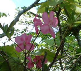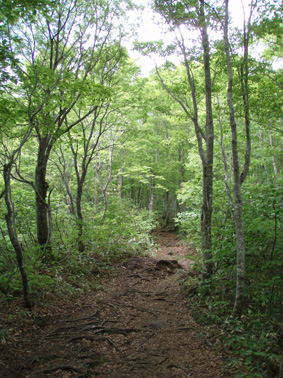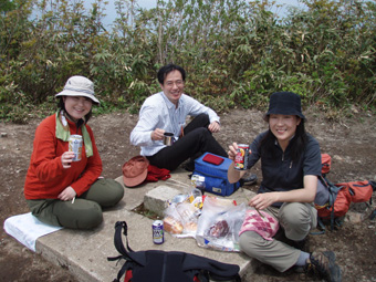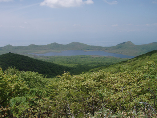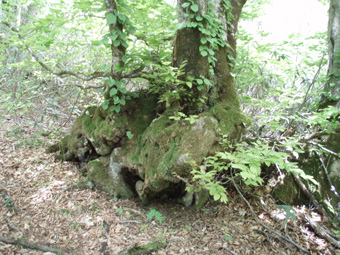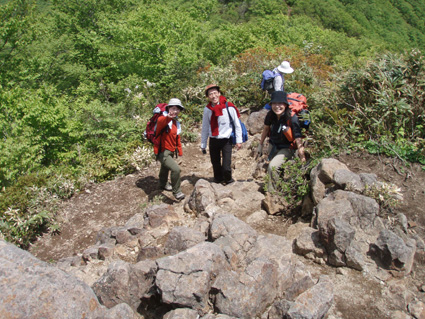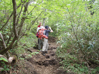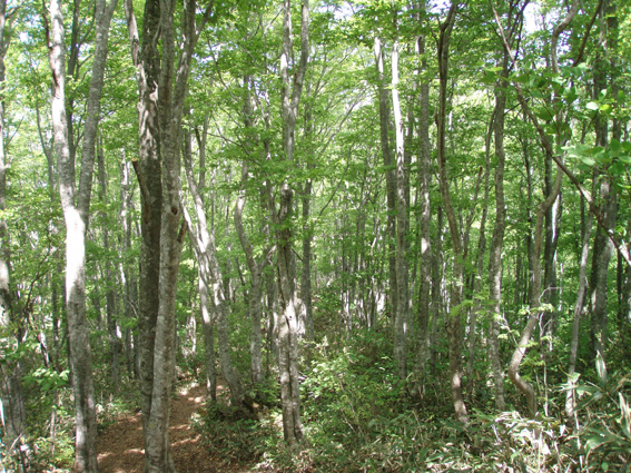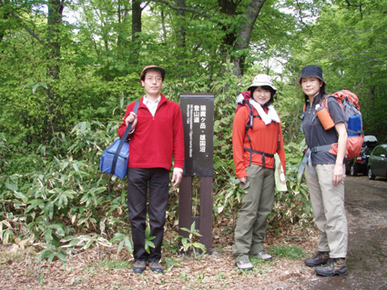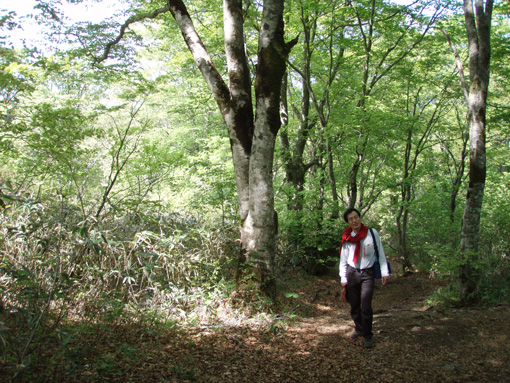 1404m 天候(晴れ) ![]() ブナ林の新緑 山菜オフを兼ねた登山を計画したため山小屋に近いコースを取る 八方台まで車で30分で登山口へ 駐車場は既に満車で空きスペースが無い少し待つと運良く一台が出て行った ![]() 展望台(記念写真はYukariさん) 登山口で(一匹さん・Yukariちゃん・Gonちゃん) 途中の展望駐車場で裏磐梯の景色を眺め登山口へ 一匹さんはクーラー一杯に入ったビールを肩に掛けて出発する 往復2時間30分のコース 道中を楽しみましょうとブナ林の登山道を進む! ![]() 静かなブナ林が続く 奇妙な根 道標(登山口から山頂まで2km弱) 淡い緑のブナ林 深呼吸をすると山の妖精が口の中に飛び込み爽やかにしてくれる 奇妙な根のブナが登山道に現れる まるで胡座をかいてる様に見える不思議な形だ 間もなく現れた道標には残り1kmの表示が刻まれてた ![]() コシアブラの芽 緩やかな登りが続く 猪苗代湖(ん〜〜見えないか) 天高くコシアブラが聳える 美味しそうな新芽が青空に輝き”おいでおいで”と手招きを受けて歓迎されてると勘違いした私達は 少しの罪悪感は在る物のコシアブラの誘惑に負けて新芽を頂きました。 木々の根が登山道に張りだし階段状になり歩きの補助をしてくれた 稜線の展望は眼下に猪苗代湖や檜原湖など遠望には 飯豊山の白い峰が青空にクッキリと浮かび輝いてる(写真では残念ながら霞んでしまう) ![]() 真ん中のピークが山頂です 磐梯山 猫魔ヶ岳のピークは峰続きの為 登山道からは存在感を伺うことが出来ない 磐梯山は悠然と構える姿を披露 どこから見ても独特の風貌に飽きることが無い山である ![]() 山頂へ到着です 檜原湖を見下ろす 山頂到着です(Yuukariちゃん・一匹さん・Gonちゃん) 360度の全展望は短時間で登ることの出来る山ではお勧めの山です ![]() 山頂にて(SEI・一匹さん・Yukariちゃん・Gonちゃん) 青空と夏雲と穏やかな空間 昨日のお酒も去りゆき爽快な気持ちになれた 山頂には数名の登山者が居たが思ったより少ない 駐車場の車の皆さんは磐梯山へ登られた様だ ![]() 山頂より(雄国沼と周辺のの山々) 大休憩です 山頂より雄国沼の佇まい!左の影が落ちてるピークには猫石を確認できる 贅沢な展望を思いのままに抱き寄せ 頂く食べ物は食感と舌触りを増幅させ絶妙の味を醸し出してくれました。 ![]() 絵になる一匹さん 新緑の林に溶け込む一人の旅人 自然の大地にすくすくと伸びる木々と会話を交わしてるのか軟らかく 思う心が叶ったような優しい表情をうかべる ![]() 間もなく登山口 お疲れ様でした 裏磐梯の魅力溢れるコースも間もなく終点 私達は疲れることもなく淡い緑に囲まれてた登山道を往復いたしました 「道中の花も彩りを魅せる」 ![]() エゾムラサキ ウワズミザクラ ラショウモンカズラ ルイヨウボタン ![]() サワオグルマ ヒロハコンロンソウ チゴユリ ○○ツツジ ![]() ツバメオモト オオカメノキ タムシバ 戻る |