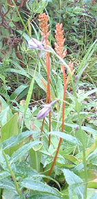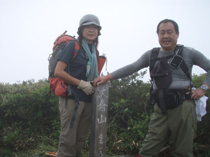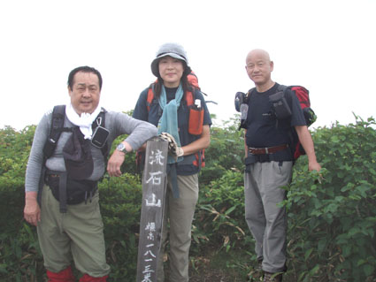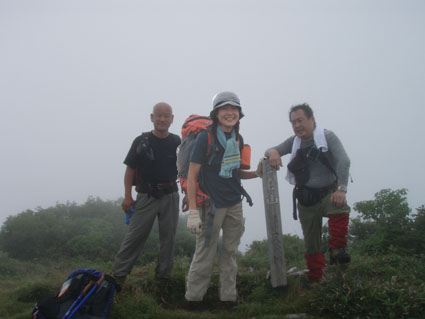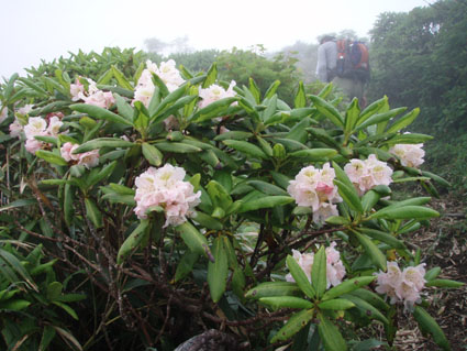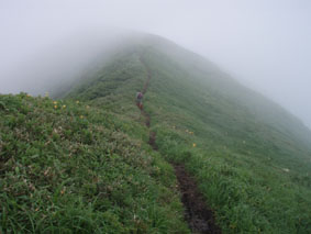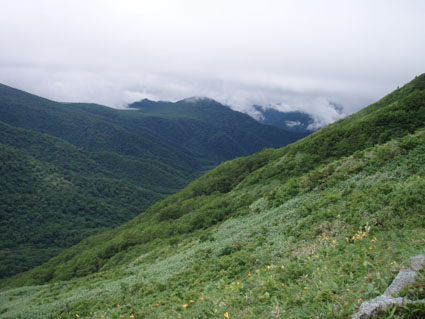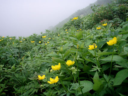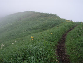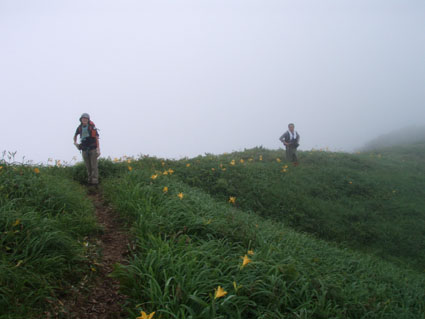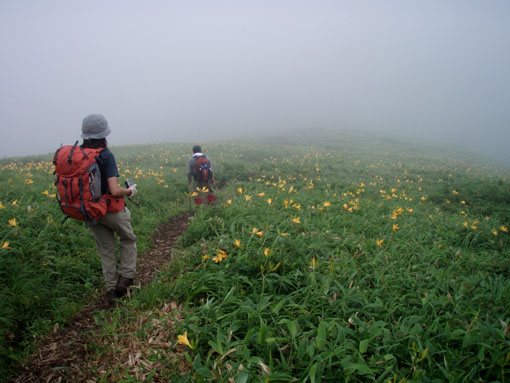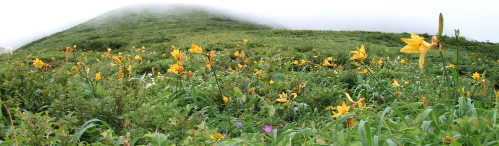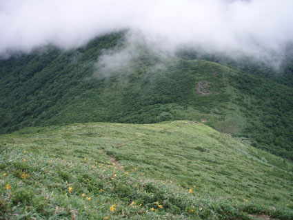 ![]() 大峠山のニッコウキスゲ ![]() 登山口に現れた猿(中央?) 山開が15日でしたが台風で中止の様でした 台風一過を期待して花の山に来ました 雨は上がりましたが山々は雲の中で頭を隠してます 花が目当ての山旅なので足下を楽しみましょうと元気に登山口を出発する 私達を歓迎するかのように数匹のサルが唐松の枝を揺すってた 登山口の駐車場は満車状態です 台風一過を期待してる人たちが大勢居るようだ! ![]() 鏡沼分岐の道標 大峠の道標 歩いて間もない所に鏡沼の分岐が在る そこから25分位で新道と旧道の分岐に着いた 旧道はアップダウンが在るので 新道を行くことにした しかし新道は泥や笹で滑りやすいコースだ 時折開ける空間からは大峠山の輪郭を見ることが出来た 大峠に着くとニッコウキスゲをはじめハクサンフウロや咲き始めのヒメシャジンを見ることが出来る 山の斜面は黄色に染まり 花の中でカメラを構える登山者の姿が数人確認できた ![]() 南月山方面 大峠のコル 大峠山は一面お花の畑である 途中から南月山方面や雲間の大峠を見下ろす 重く垂れこめた雲に山々の峰は隠れ裾野だけが広がる 風が無いためか雲は動きを止めて立ち止まり 流れるような稜線は現れない 「三倉山の稜線は絵になる山容だ 茶臼岳や旭岳からの眺めは格別の風貌を醸し出す山である」 ![]() 流石山の尾根 山頂にて(穂高さん〜Gonちゃん〜SEI) 最初から急坂の連続を登る お花に癒されて流石山に到着した 背丈の低い木々の山頂は全展望だ・・・が・・・ ガスのカーテンを開けようとしない台風一家(台風一過)そのうち諦めて立ち去るだろうと期待して稜線を進む ![]() 稜線上に咲くミヤマキンポウゲ ニッコウキスゲに彩られる登山道 稜線は期待道理のお花のパレードだ キスゲ街道やキンポウゲ斜面が次々と現れ歩きが鈍くなる 同じニッコウキスゲでも此処のお花は色が濃い様に見える 雨上がりの為に?それとも特別濃い色なのか鮮やかな花である ![]() 尾根にはシャクナゲが多く咲いてる 稜線のお花 次に現れたのはシャクナゲロードである シャクナゲは終盤なのか元気がない花が多いキスゲと交互に現れ楽しめました 足下を良く見ると小さな蕾を付けた山草を見つけることが出来る どんな花が咲くのか想像するとわくわくする 毎週来たらお花さんの姿は毎週変わるのだろうなと山の移りを思う ![]() 大倉山山頂 三倉山への稜線 大倉山山頂には十二時半に着いた 予定より30分遅れてる花に見とれて花に足止めをされて遅れたようである 全展望の山頂は此処でも白いカーテンを開けることを嫌う ![]() 三倉山山頂(SEI〜Gonちゃん〜穂高さん) 三倉山には大倉山で会った宇都宮から来た登山者が休んでた 既に午後の一時・・休んでは居られないと彼らは立ち去った 私達は大倉山で休憩したが此処でもビールを取り出し飲む呆れた飲んべいです・・・これで又も予定時間が遅れる 喉に流し込んだビールは特急で胃袋に到達 宮崎県の地鶏の燻製(Gonちゃんお気に入り)でコラボ 休憩を終えました ![]() 花の尾根を行く 少しガスが薄くなり稜線が現れた・・・が・・・・直ぐにガスが襲ってくる一日でした このニッコウキスゲが太陽の光を抱きしめたらどんな輝きに成るのだろう そんな山肌を心に秘めて下山した ![]() 大峠のお地蔵さん 林道に祀られる碑 山に咲く花 ![]() 1)ミヤマキンポウゲ 2)マルバシモツケ 3) ヤマグルマ 4)ヒメシャジン ![]() 5)山アジサイ 6)コメツツジ 7)ヤマブキショウマ 8)ウサギギク? 9) 10) ミヤマカラマツ ![]() 11)テンニンソウ 12)マルバシモツケ 13)オトギリソウ 14)ゴゼンタチバナ 15)ハクサンフウロ ![]() 16)ウラジロヨウラク 17)ニッコウキスゲ 18) ハクサンショクナゲ 19)ネバリノギラン 20)ミネウスユキソウ 戻る |