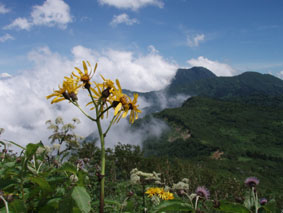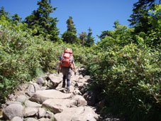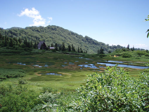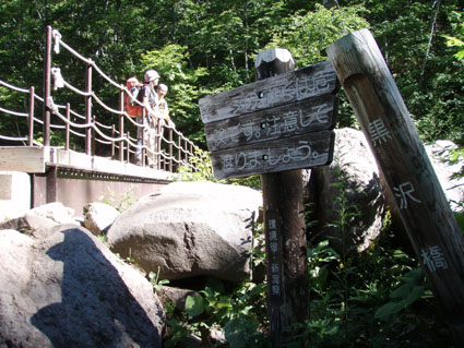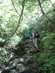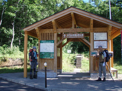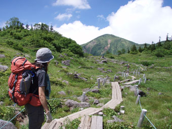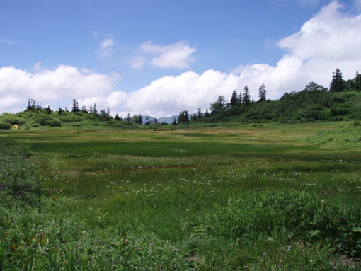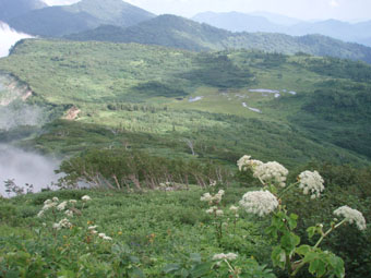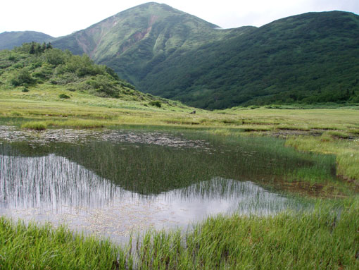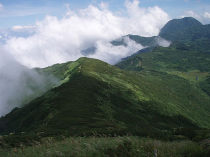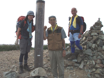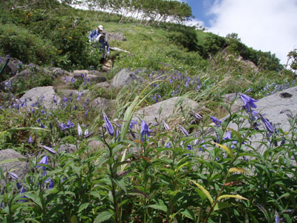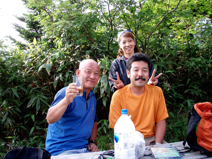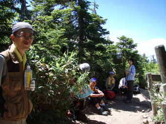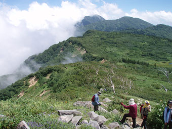 ![]() 高谷池ヒュッテ手前より火打山を望む ![]() 笹ヶ峰登山口(Gonちゃん・SADAさん) ブナ林の木漏れ日 お盆の休暇を利用して新潟県に在る火打山に訪れる 高速道から登山口への道に迷い一時間のロスタイムで登山開始が予定時間より遅れた 登山口は大きな駐車場が整備されてて百台以上は止めることが出来る(キャンプ場の駐車スペースと共用) 登山口はご覧の通りの素晴らしい通用門があり此処から登山道へと進んだ。 ![]() 黒沢橋を渡る 登山道より北アルプスを覗くことが出来た 最初は二次林と思われるブナ林が続き木道を進む だらだらとした登りが終わると黒沢橋が現れ渓流は水量が多く 勢いをつけて流れてる・・・渓相が素晴らしくイワナの住む場所としては最高の条件が整ってると見受けた。 くねくねと曲がり急坂を登る 登山道にはムラサキの小さな花が並んで咲いてる 時折開ける空間から残雪を抱いた北アルプスの姿が見えた 十二曲がりを登るSADAさん 十二曲がりの道標を通過すると 石の道や木々の根を使って登る登山道に変わり 展望が閉ざされた灌木林は蒸し暑い 流れるような汗が次々と絞り出され体からは塩が吹き出てベルトやザックが白く変色する ![]() 富士見平分岐を行くGonちゃん アサギマダラ 石畳をどんどん登ると富士見平の分岐に出た此処で行程の半分くらいかなと一休み 道中ではアサギマダラが多く飛んでいた(ヒラヒラと飛ぶ不思議な習性の蝶) ![]() 東京から来た若いグループの登山者と一休み 焼 山 若いメンバー(地元出身の登山者が居る)と休むSADAさんは笑顔がこぼれた 此処からは木々の背丈も低くなり太陽の日差しをまともに受ける為に猛暑の熱は手を緩めることなく襲いかかる 遠望の焼山も心なしか山頂が日焼けして赤く見える ![]() 高谷池の湿原 湿原は絵に描いたような景色を披露し反物でも織り込んだように鮮やかな色彩が見られる 草紅葉の始まりか茶色に湿原を衣替えした所もある ![]() 湿原と高谷池ヒュッテ(お泊まりの山小屋) 道中の高台から高谷池を眺めると静かに佇むヒュッテがバランス良く空間を埋め 池塘は鏡となり青い空を跳ね返し 木々の緑を吸い込むように映しだす景色は写真を超えた異空間の絵物語である ![]() 天狗の庭&杢道(後方は影火打と火打山) 湿原の杢道を小気味よく進むと天狗の庭にさしかかる 天狗の庭ではワタスゲの綿が風に舞い湿原を彷徨ったのか 至る所に散らばり庭を我が物顔に占領してる 湿原には小さな白い花・・背丈の高い草の根元に寄り添い咲いていました ![]() ヒメシャジンの群生地 雷鳥平に沸き上がる雲 火打山の山頂は直ぐ其処に見えるがなかなか到達できない 山頂直下の木の階段は疲れた体にはしんどい 気を紛らす為に展望を楽しむ 東の方面は視界があるが西の雨飾山の方角は雲に覆われてた 足下にはマルバダケブキやヒメシャジン・トリカブトの花が咲く! ![]() 青空とマルバダケブキ 雷鳥平 真夏の登山道は乾き歩くたびに砂ぼこりが上がる 運が良ければ雷鳥にと思ってたがハイマツが見あたらない場所で ライチョウが現れるのか それとも暑さで日陰に潜み昼寝でもしてるのか姿を見せることは無かった ![]() 稜線越しに妙高山 山頂より天狗の庭の湿原 間もなく山頂だ 振り返り今来た稜線を眺める 雲がどんどん沸き上がる様は山が動いてる様にも見える 雲の日陰がコントラストに強弱を付け山の形を変える 迫るように膨張したり消えたりする山の模様は神々しく神秘的でした 山頂にて(Gonちゃん・SADAさん・SEI) 無事に山頂到着 記念写真の後はお決まりのビールタイム ビールってこんなに旨かったっけ新発見と意味深な言葉 猛暑の山頂にビールは最高に合う飲み物と今更ながらの会話に酔いました ![]() 逆さ火打山 池塘に映る逆火打山 無風の湿原に醸し出された影絵は真夏の暑さを忘れさせる絶景でした ![]() 高谷池ヒュッテにて(SEI・スピッツちゃん・クマさん) 山頂を後にして目指したのはお泊まりの宿 高谷池ヒュッテ ヒュッテに着くなり外のテーブルでビールを煽る生ぬるいビールは苦く好まない それではとガラス瓶ごと持ってきたウイスキーを取り出し水割りを飲む 目線を移しふと目をやると小さなお顔の美人さんが目に留まる そこでSEIの悪い癖が出てしまう すみません一緒に飲みませんかと余計なお世話・・・・・m(_ _)m 最初はキッパリと断られたが愛嬌のある(独りよがり)SEI 話をする中でお近づきを頂き一緒に飲むことになる 大阪から来ましたクマさんとスピッツちゃん クマさんは最初は怖そうでしたが優しい方でスピッツちゃんにめろめろ Gonちゃんと同い年で性格まで似てると意気投合のスピッツちゃんとGonちゃん SADAさんも遅ればせながら参入して夜な夜な飲み明かす 外は黒い軍団が攻めてくるために小屋の中でテーブルを囲み飲み明かし話が弾む お二人さんはこれから三泊して帰るそうなので明日(18日)の夜には無事に帰宅するはずだ スピッツちゃんクマさんありがとうございました 私達は15日に妙高山に登り夜中の10時