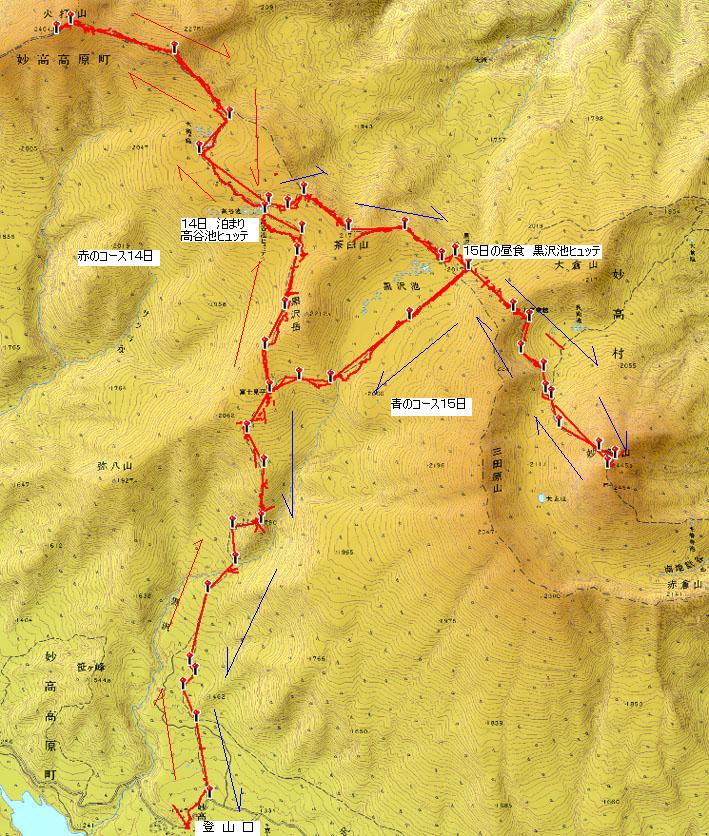 今回のコース 14日火打山・・・・・・火打山記録へ戻る 登山口 AM7:50〜富士見平AM10:50 高谷池ヒュッテPM12:00〜山頂PM1:30 休憩(40分) 下山PM2:10〜天狗の庭(休憩)〜 高谷池ヒュッテPM4:00〜泊まり 15日妙高山・・・・・妙高山記録へ戻る 高谷池ヒュッテAM6:00〜黒沢池ヒュッテAM6:50 (休憩) 大倉乗越AM7:30〜燕新道分岐AM8:20 山頂AM10:00〜休憩(一時間) 下山AM11:00〜黒沢池ヒュッテPM1:00 昼食休憩30分(美味しいラーメンを食べる) 富士見平PM2:15〜登山口PM4:00 |