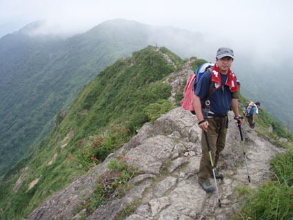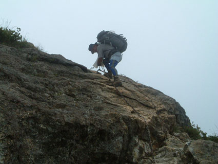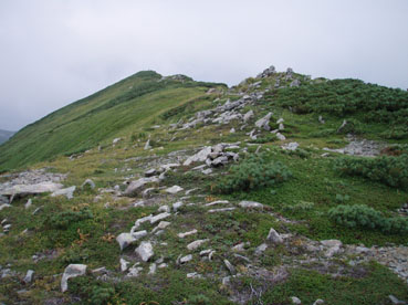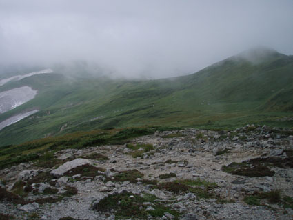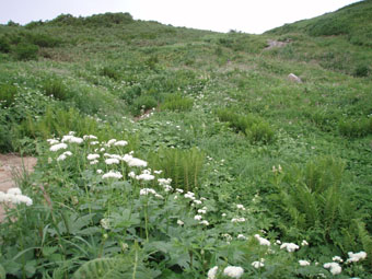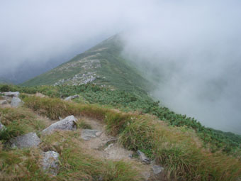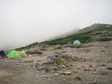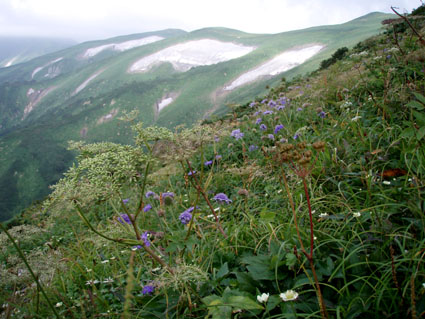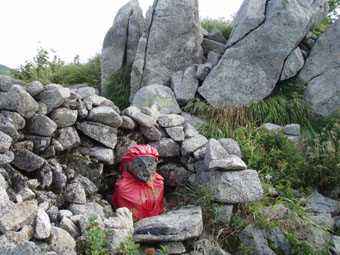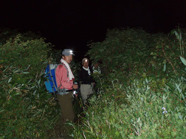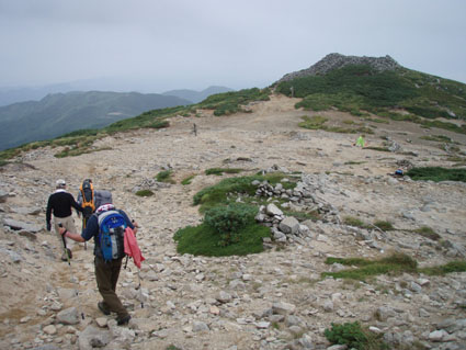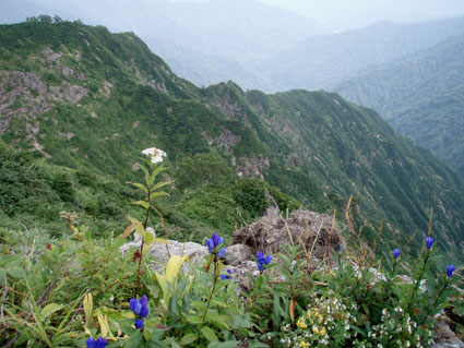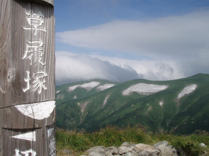 ![]() 飯豊山に落ちる太陽 ![]() ヘッデンの灯りで出発 夜明けを待たずして小屋を出た ヘッデンの灯りを道案内に登山道を進む 朝方は涼しくて歩きやすい 早出の登山者も多く小屋は3時頃からザワザワと人の動く姿が見受けられる ![]() 東の空に太陽が昇る 一王子のキャンプ場 5時前に東の空に太陽が出る 雲が垂れ込めた隙間から覗く太陽の顔は小さな美人顔でした 5時を回れば明るくなり一王子に着く頃はご覧の様にテン場も人影が見られる 広いテン場は数張りのテントしか無く小屋泊まりが主の様である ![]() 本山小屋より山頂へ 山頂にて(SEI〜haruさん〜Suzukiさん〜ARIさん) 本山小屋の脇を通り山頂に向かう 先ほどまで雲に覆われていた山頂のガスが流れフワーッと現れた 山頂に着くが展望は閉ざされ八方に流れるような山並みを見ることは出来ない 飯豊山初登山の二人に話しかける山頂の祠 「山は何時も平等に優しさも厳しさも与えてくれる次の機会に大展望を約束するね・・と」 また来ますと言ったか言わぬか本人のみ知ることでした ![]() 宝珠山の峰が雲間から現れた 沸き上がる雲 山頂に居ること数十分 宝珠山(ダイクラ尾根)の肩が彷徨うガス間から現れる 目を移すと御西岳の背中もボンヤリと浮かぶ 優しい山の神が少しだけ見ることを許してくれたのだろう ![]() テン場を下る 山肌のお花畑 山頂を後にして下山 小屋の脇で朝飯にする ガスで湯を沸かし味噌汁を作りお目当てのビールを買うために小屋に入る そこでとんでもない事件発生(事件でも無いか・・・ゴメン・・) 小屋の管理人がお泊まりの人以外ビールは売らない 通過の人がビルを飲んで酔うことは危険だと言うのだ 車を運転する人に酒を飲ませないのと同じで在る・・そうかなSEIの独り言 本山小屋にはビールが在るよと聞き馳せ参じたため何時も楽しみにしてるビールで乾杯は出来ない こんな事なら残りのビールを持って来れば良かった 後悔先に立たずだよな・・(-_-;) あまりの悲しさに泣き顔になるSEI それほどまでに山頂で飲むビールは私に取って最高の贈り物なのだ 小屋の管理人さん言ってることは解らないでも無いが何処の山小屋に行ってもお泊まり以外は ビールを売らないなんて初経験ですよ・・・でも恨んでないよ (*^_^*) ワッハッハ ![]() トリカブトに飾られた登山道 姥観現 珍事ありの小屋を後にする トリカブトに彩られた登山道は綺麗だ 地蔵さんの見送りを頂き足早に下る 草履塚〜山頂の間はブヨの大群が攻撃をしてくる両耳とデナを食いちぎられ血が出てるSEI ほっかぶりで防御するも隙間から入ってくる 仕方なく網の帽子を被る 蒸し暑さを我慢するかブヨの攻撃を受けるかの選択でした ![]() 草履塚より残雪の御西岳 草履塚のお花さん 御秘所から切合の間はお花が咲き誇り目を楽しませてくれた 振り向き山頂方面を眺めるも本山のピークは雲の中 大日岳も姿を現さない 御西岳の山肌に抱かれた残雪が垂れ込めるガスの中で際だち 耳をすませば雪解けの水が風の流れるような音色で山に震撼してた ![]() 七森より鋭い岩峰が切れ落ちる 剣ヶ峰を下るSEI 三国岳の小屋に戻ると此から登る人と下山する人が休んでる 私達も剣ヶ峰を下る前に体力温存と休む そこに仙台のご夫婦が到着した 昨日と違いご主人の顔色が良い 話を聞くと今日は体調が良い様だ少し遅れて奥様が到着 今日は私が迷惑を掛けてるのですよと持ちつ持たれつの阿吽の呼吸のご夫婦でした 鋭い山容とも間もなくお別れだ 焼き付けるように眺め感激にしたる 辛い登りもこの時をして辛さ忘れる お花越しに映る空間に明日のイネルギーを吸収することを許可されたのでした 三国小屋の脇を進み剣ヶ峰の岩壁を下る 鎖場は足場を固めて一歩一歩慎重に下る 変化の激しい飯豊山登山も間もなく終着です ![]() 剣ヶ峰のHaruさん 霞む朝日連峰方面 来年の年賀状の写真は此だと腕を絞りHARUさんをカシャッ なかなかの出来上がりに満足のSEIでした ![]() ![]() 登山口の御沢杉 地蔵清水で四度の再会は仙台のご夫婦そして五度の再会は汗を流すために寄った飯豊温泉でした 小田原の山人さん 仙台の山人さん 本山小屋の管理人さんありがとうございました そして下山時に足を痛めた学生さん大丈夫でしたか 楽しい二日間でした ・・・ARIさん Suzukiさん Haruさんお世話になりました・・・ SEI 戻る |