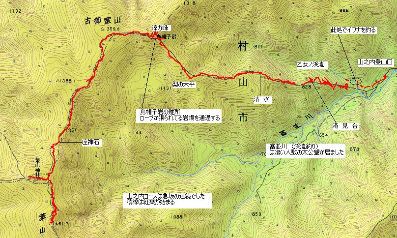 梨の木平ら 〜 清水 〜 滝見 〜 乙女ノ渓流にて(イワナ釣り) 〜 登山口 PM3:45