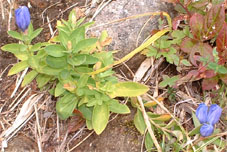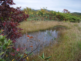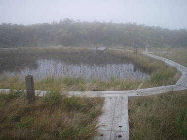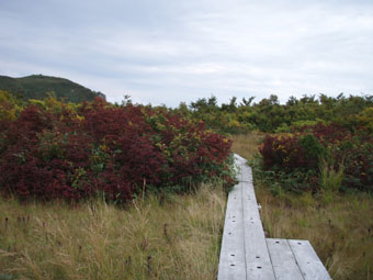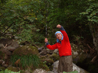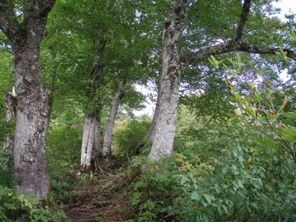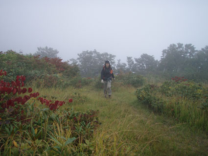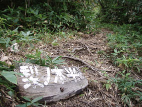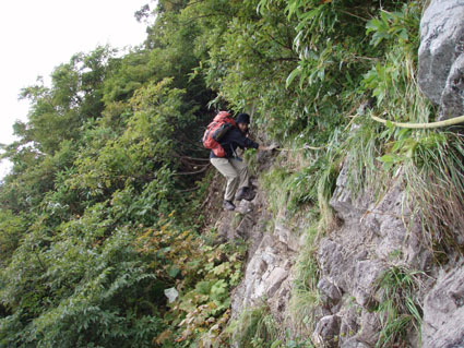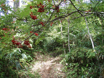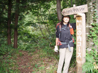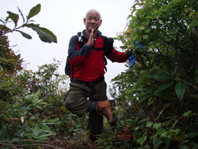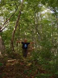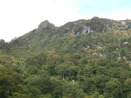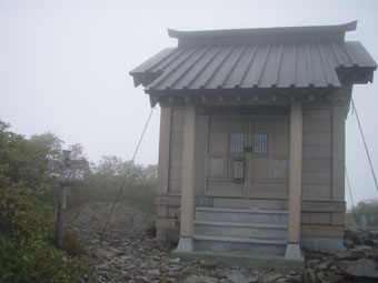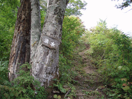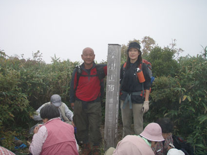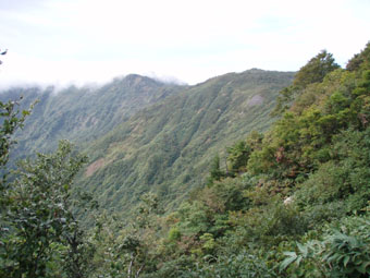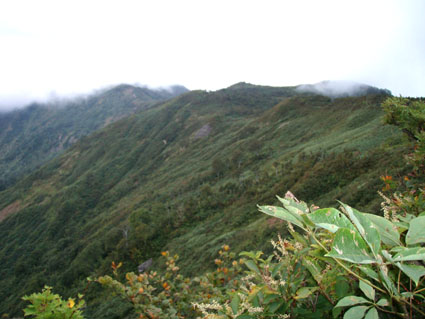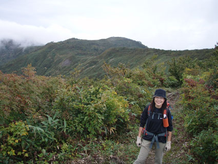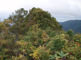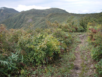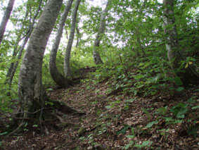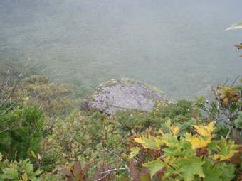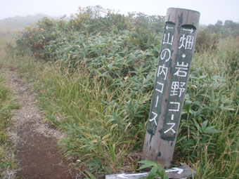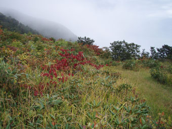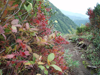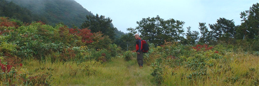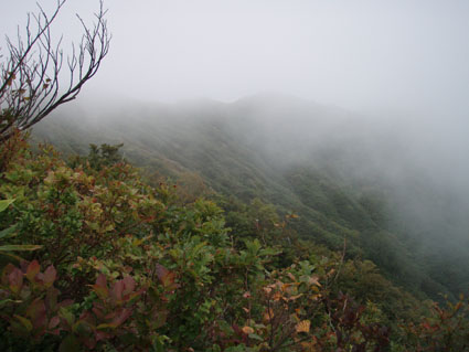 ![]() 山之内林道に取り付く登山口 乙女渓流の手前の道標 登り始めて直ぐにブナ林になる 今回はSONEさんから提案があり縦走コースを予定したが SONEさんが所用で車をデポ出来なくなり山之内コースを往復することにした 葉山登山コースの中で距離が長いが変化に富んだ登山道とガイドブックに紹介されてた為このコースを選ぶ! 山之内林道を5.5km位登ると登山口の案内がある 駐車スペースは5〜8台位です 杉林の下刈りを済ませたばかりの山肌を右に見ながら進む 直ぐに山之内コースの道標が現れ少し沢越しに下ると乙女沢に出た 乙女沢は飛び石を足場に渡る すぐに急坂に成り山肌はブナ林と変わる ![]() 滝見台の展望 楢の木と遊ぶGonちゃん 大東岳の鼻こすりを思わせる急登に足取りは重い 45分程で滝見台に着く 滝はカラカラで水の落ちる姿を見ることは出来なかった 登山道は所々ひらけ展望を楽しみながらの登りは疲れを麻痺させてくれる 楢の巨木を見つけてマイタケは居ないかと Gonちゃんが木に寄り添い遊ぶ・・・・・のでした ![]() 滝見台を過ぎると開ける登山道 ブナの登山道が続く 登山道では標高1000mを超えた辺りから少しずつ木々の色つきを見ることが出来るが ブナの葉はまだまだ濃い緑色をしてる 登山道にはブナの巨木やミズナラの巨木が多く枯れ木も目立つためキノコ捜査に明け暮れるSEI ![]() 烏帽子岩 清水の道標 烏帽子岩の姿も大きくなり稜線間近か ? 清水の案内が在るが水は十分に持ってきてる為よらずに進む 四つん這いになり登るような急坂の滑る道が時折明るくなり 雲間から日がこぼれ落ち 眺める遠望に葉山のピークが映し出されてた。 ![]() ナナカマド 烏帽子越しの景色 ナナカマドのトンネルをくぐり烏帽子岩の岩場にさしかかり振り向くと眼下には村山市の町並みを見ることが出来る ![]() ブナハリタケ 山頂方面の山並み 涼ガ峰から延びる稜線 登山道に見つけたブナハリタケの位置を確認(下山時に採る為)して進む 涼ガ峰の稜線にヒョコッと出るとあとは稜線歩きだ 登山道に在る岩が適当な休み場をを提供してくれた 今日初めてのビールタイムに元気が出る しかし先ほどまで見えてた山並みがどんどん雲に隠れて姿が消えてゆく 雲行きが怪しいぞ〜 ![]() 重なって奥に見えるのは月山 湿原の道標 木道が在りました 月山も見る見るうちに姿が消え葉山や奥の院の神社もガスに消されてしまった 遠望の景色は諦め足下の紅葉を見つめて進む 草紅葉の色が濃くなり木々は赤く染まってる 稜線は紅葉が始まってるのだ ![]() 池 塘 草紅葉 池に残る高山植物にどんな花が咲いていたのかなと目を閉じて光景を浮かべた 草原は真新しい黄金色に染まり ガスの薄日にさえ映るのでした ![]() 座禅石の道標 なんだか・・? 座禅石 座禅石の道標に案内されて寄り道をした 眺めるが石が無い 足下に目をやれば切り立った崖に座禅石が鎮座してる あの石の上で座禅を組むわけには行かないかと思案するが石に辿り着く前に滑落するだろうと諦め 立ったまま変な姿になるSEIでした。 分岐 稜線の紅葉 分岐に着き 奥の院に進む 少し登ると神社が現れた ![]() 奥の院の鳥居 神社 神社の人形さん 登山道に在る鳥居をくぐり右手に神社が現れる 神社には可愛い人形さんが四体あり意味深な姿にん〜と感心して 神社の裏手に回るがガスに閉ざされた空間は何も見ることが出来ない ただただ白い空間が広がるだけでした ![]() 奥の院の奥に在るトンボ池 山頂にて 奥の院の先に行くとトンボ池が現れ木道が丸く囲む 木道の先に登山道が分かれて続き 大勢の登山者が登ってきた 先頭の登山者にどこから登ってきたのと聞かれ山之内コースですと話すと 何時間係りましたかと尋ねられ3時間半くらいかなと言うと・・・・へえ〜〜〜・・・と言われたが(どんな意味か解らない) 葉山の山頂には30名くらいの登山者が休んでて山頂の道標まで近づけない すみません写真を撮らせてくださいと頼みようやく記念写真をカシャリ・・・ 大変おじゃまいたしましたと挨拶をして退散する ![]() 稜線の紅葉が綺麗でした 下山は早足で下る 稜線の紅葉に見送られ気持ちが良い 漂うガスに揺れる風景が哀愁の秋を語りかける でも少しも寂しくないSEIは秋は楽しいのだと今日も変な歌を歌い天真爛漫のボケキャラを出してた ![]() 下山時にはガスが下りてくる 下山路を振り返る 午後は時間と共にガスが横から下からと沸いてくる 雨が降らなければ良いがと祈り下るテンポが速くなる このコースで雨でも降ったのなら大変危険と登るときに感じたからだ ![]() 元気なGonちゃん 涼ガ峰 そんな心配をよそに元気に登山道を歩くGonちゃん 腹へったよ・・!と飯の時を催促する 飯は危険な烏帽子岩を下ってからにしようと(飯に付きもののビールを飲むため)話すSEIでした 今回のコースで一番の難所 今日のコースで一番の危険箇所を下るGonちゃん 足場を一つずつ確認する 滑り落ちたら崖を転がり落ちるしかない どの位の高さがあるのか崖下は見えないのです ![]() 梨の