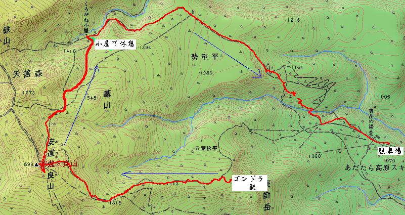 ゴンドラ終点駅 AM 9:12 〜 山頂 AM 11:15 (小休憩)〜 くろがね小屋へ下山 AM 11:30 (ホワイトアウト状態で斜面が見えない ターンを繰り返し下る 雪面が崩れ気持ちが悪い) 峰ノ辻分岐で視界20m〜30m 〜 沢筋を滑降 〜 くろがね小屋 PM 12:15 〜 休憩(一時間二十五分) くろがね小屋 PM 1:40 〜 勢至平分岐 〜 林間滑降 〜 駐車場 PM 3:00