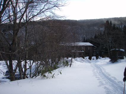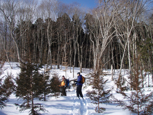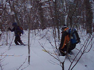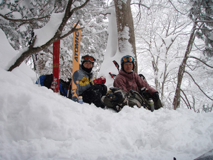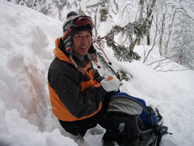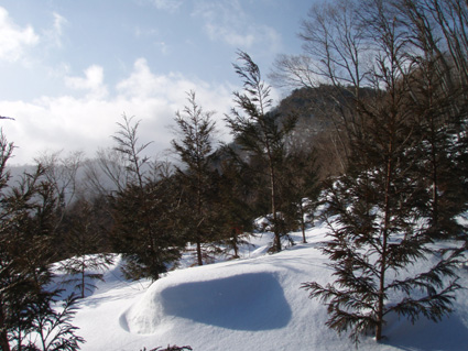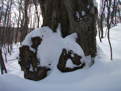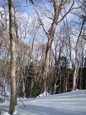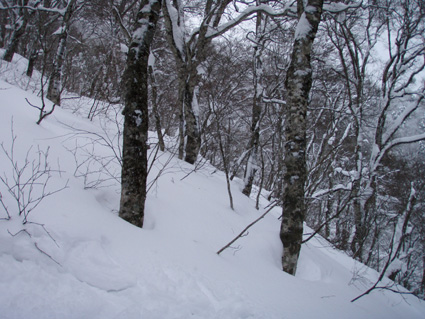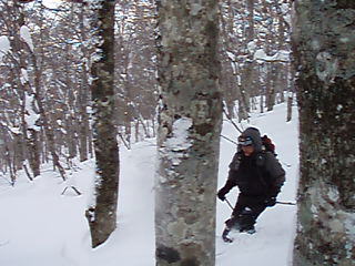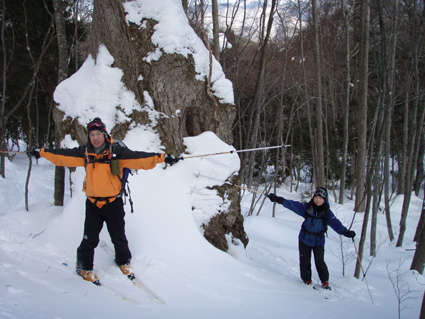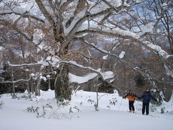![]() 二岐温泉から大戸岳(1416m) 後方の白い尖り 今日の予定は磐梯山でしたが思わしくない天候とスノーハイク参加のSawaさんが不参加になる それでは天候の安定してると思われる二岐山へ滑りを重視しての行く先変更だ ![]() 取り付きに在る民宿 駐車場へ到着 まずは雪の感触を確かめる ホー フカフカのパウではないか・・・・・ 焦る気持ちを抑えて準備に係る ![]() 日差しの強い林を登る ノントレースの雪を軽いラッセルで進む 今シーズン初めて青空の下で山スキーを楽しむことが出来る ん〜〜幸せ (^O^) ![]() しばらくぶりに青空の中で楽しむことが出来た(途中の風景) 見渡す限り青空が広がる 雪は深呼吸をすると吸い込まれるくらい軽いパウダー 木々に日差しが降り注ぎ躍動感在る影絵が揺らめく ![]() メルヘンの世界へ迷い込んだようだ ![]() ミズナラの巨木 途中にある大木に寄り道 幹周りは・・・・数メートル ![]() 巨木の前でHaruさん 気持ちの良い林を登る 裏に回りHaruさんが手を広げ手定規ではかる ブナの二次林が青空に背伸びしてるような風景が広がる斜面で一息入れる 標高1000mくらいからは横浜から来たKeita & Tomomiさんが常にラッセルを先行してくれた 体力気力に劣るSEIは言葉に甘いトレースを辿るのでした (Keita&Tomomiさん有り難うございました) ![]() ブナの大木 雪の緩斜面にブナの巨木が枝を広げて鎮座してた ![]() 木々の間から白い峰を望む ブナの斜面 時々 薄く雲が流れるが大きく天候が変わることは無かった 遠望の大戸岳が目線の高さに確認できる 間もなく折り返し地点に在る「あすなろ」の巨木に着くはずである 折り返し地点に着くと先行してくれたKeita&Tomomiさんがシールを外し休憩してる ← Haruさん![]() ![]() Gonちゃん Tomomiちゃん&Keitaさんは横浜から 腹へったと食事に取りかかる 寒い山では暖かい食べ物が良いと カップ麺にお湯を注ぎ準備万端 出来上がる間はお決まりのビールタイム 酷寒の山で飲むビールは最高と・・・苦笑いでした ![]() Gonちゃん Haruさん SEI 滑降準備を終えたKeita&Tomomiさんは華麗な滑りで先行する 流れるような板さばきのテレターンは芸術的な滑りと見とれる Haruさん Gonさん SEIも負けじと滑降開始 楽しい楽しいパウダースノーと戯れることが出来ました。 Keita&Tomomiさん・・・ 28日は博士山へ滑降場所を変える為に移動 駐車場に着いたときには既に姿は無かった また会える日を楽しみにしてます 博士山のミニレポもよろしくね・・・・・SEI 戻る |