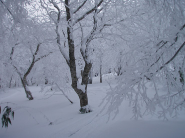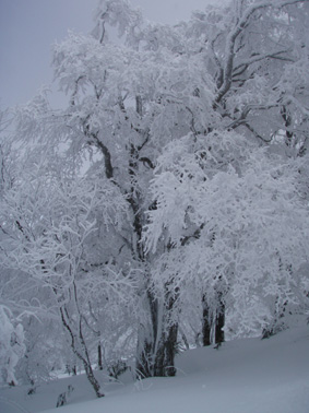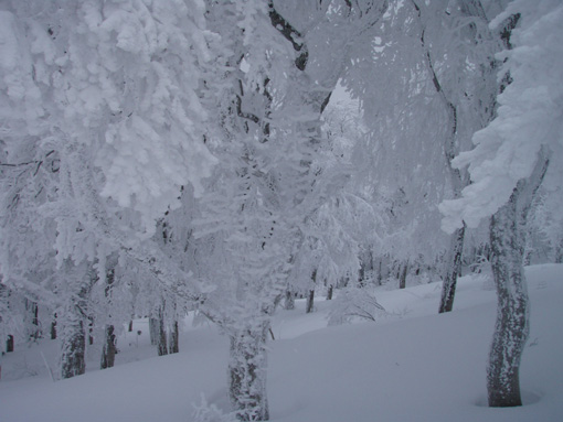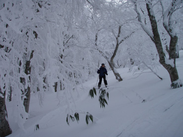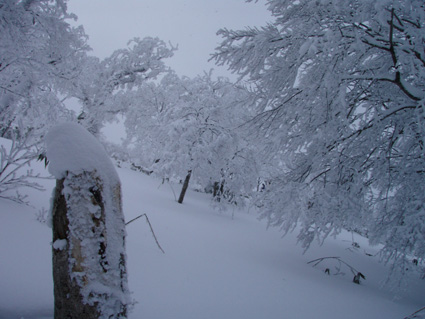 箕輪山ゲレンデ北斜面のブナ林へ行くと 待ちかまえていたのはパウの雪面でした