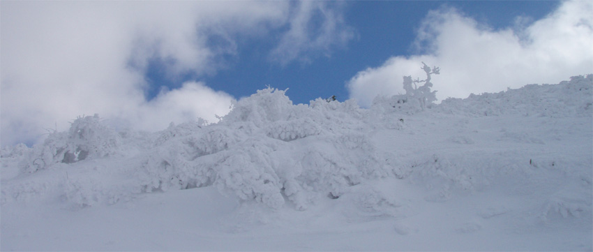 山頂はガスが係り視界は望めない それなら山頂へは行かないでブナ林を滑り返そうとリフト終点から