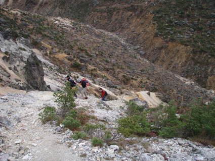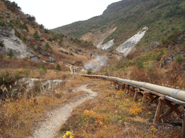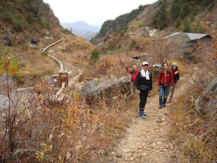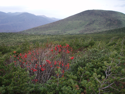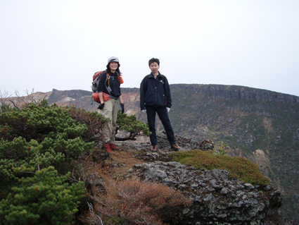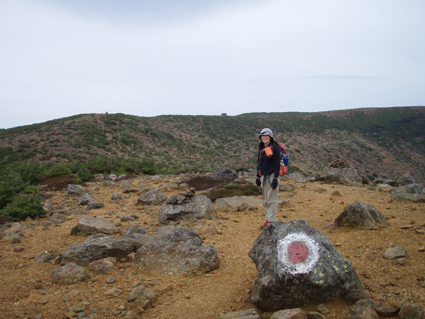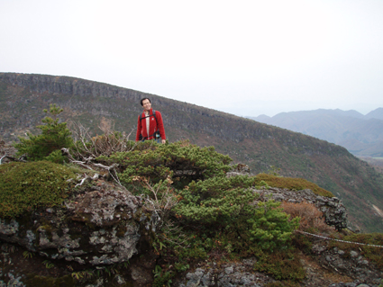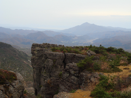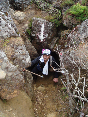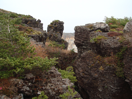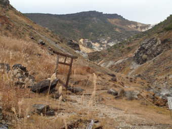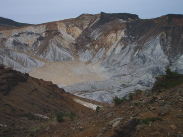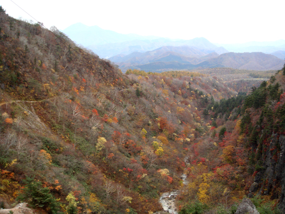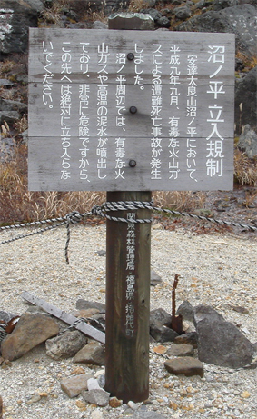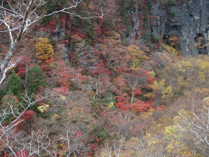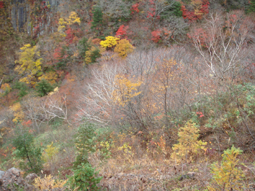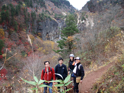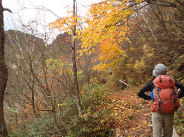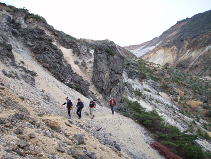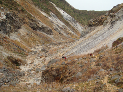 ![]() 硫黄川の紅葉 昨晩は夜中までキノコオフ会の宴会が続きアルコール残量ありの登山になりました 渓谷の彩りは鮮やかの一言で十分表現できる風景が広がる ![]() 登山口の碑 晩秋の彩り 沼尻登山口には30台くらいの車が既に止まってた 登山口に近い場所に車をデポしスタート。 ![]() 落葉が進む登山道 え〜〜〜まだ咲いていた 木々にしがみつくように鮮やかな黄色の葉が落葉を耐えていた ![]() 白糸の滝を背景に! 渓谷を望む 白糸の滝近辺までは紅葉に見とれて歩みが止まる ![]() 1100m付近の紅葉です 崖に張り付く木々の競演が見事だ! ![]() 温泉のガス抜き口 温泉送湯ライン 廃坑跡まで来ると木々の彩りに代わり草紅葉が目に止まる 立ち止まると流れる風に乗り硫黄の臭いが鼻をついた 振り返ると登山道脇にある送湯ラインのバランスが何故かマッチしてるのに気づく ![]() 廃坑跡を行く 祠 此処には以前 茅葺屋根の湯ノ花採取小屋があり風情を高めてたが今は無惨につぶれてる。 ![]() 沼の平(看板) ガレ場 11年前に痛ましい事故で数名が犠牲になった沼の平の看板が心を痛めた ご冥福をお祈りいたします。 ![]() 落石危険の道標あり 急斜面のガレ 硫黄川に沿って急斜面のガレ場が続く ![]() 胎内岩 奇妙な岩場 急斜面が終わると胎内岩が現れる 岩を潜り稜線に出ると奇妙な岩峰が風景を魅力的にアップしてた。 ![]() 障子ヶ岩を背景に(一匹さん) Gonちゃん・Takaさん 船明神山の障子ヶ岩は海外の山を垣間見るような岩峰です ![]() 奥に磐梯山を望む 箕輪山 稜線に出ると山々が姿を現す 磐梯山や吾妻の山々をはじめ 南東には馬の背〜牛の背 矢筈森〜安達太良山のピーク(乳首)が広がる 残念ながら遠望の峯は霞 姿はなかった。 ![]() 沼の平 後方は石楠花の塔〜鉄山避小屋 稜線は風が強い!! ![]() 石楠花の塔(一匹さん・Nabeちゃん・Takaさん・Gonちゃん) 吾妻山 石楠花の塔で記念写真を撮り 鉄山ピークを目の前にして下山する 晩秋の山は冬の装いを始めたのか強風と低温に震え上がる体 早く下山してお風呂にはいるべと早足で下山をしました。 Nebeちゃん Takaさん 一匹さん Gonちゃん 二日酔いの(でもない人も居ます)体でお疲れ様でした ・・・SEI・・・ 戻る |