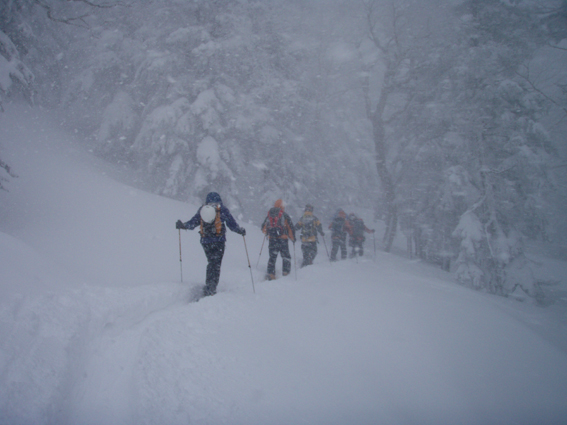 ![]() デコから登るメンバー 昨日は冬型(風雪)の天気の中、西大巓へ行きました HAMAさんのメンバー5名さんと合流して 遅れて動き始めたゴンドラとリフトを乗り継ぎゲレンデTOPへ 視界の悪い林間を登る 終始HAMAさん達のトレースに御世話になり続く 新雪は深く転んだり逸れると膝まで潜る 山頂手前で風雪と視界不良を理由(根性が・・?)に1860mにて撤退した 下山も斜度が緩むとラッセルの下りになる 空けてる林間を選びながらゲレンデまで戻りました。 先行したHAMAさん達には私達の後方を登ってきました 小山山岳会のお二人のメンバーさんに伝言を頼み下山を連絡する 小山山岳会のお二人に感謝いたします 有り難うございました。 ゲレンデハウスでHAMAさん達と合流 ![]() モンスターの成長 ![]() 五本指の枝 風雪の山は写真に収める物が少なく被写体になりました。 ![]() 1860mでシールを外す ![]() 元気なGonちゃん ![]() シールを外すHaruさん ![]() 深雪に足を取られ脱出後の様子 ![]() (写真はHAMAさんからお借りしました) 板を履いていて新雪が膝上位まで沈む、ラッセルし甲斐があります ![]() 2番、3番手でも、これ位・・・ ![]() HAMAさんメンバー やがて、方向を東に変え、デコ平に降り、雪が詰まり始めた沢を渡り、ゲレンデに合流 上記三枚の写真とレポはHAMAさんです 私達は既に撤退してたため南西尾根を下ることは出来ませんでした ![]() 雪が重たそう 私達の撤退位置 新雪・深雪で視界が悪い、おまけに強風と冬型の気象状況の中で楽しめた一日です HAMAさん、つるべさん・さゆさゆさん夫妻、さすけさん、I町さん、HaruさんGonちゃんと 山頂を目指し南西尾根を下るはずでしたが私達は途中撤退となりました こんな天候も山の醍醐味を味わえると話すSEIに GonちゃんとHaruさんは沈黙・・・・ 天候の良い日の方が山歩きは楽しいと反撃でした・・・(笑) 今回降った雪が安定すれば新雪のパウを楽しめるはず 次回は青空の見えるツアーを楽しみましょう ご一緒いただきました皆さん有り難うございました ・・・・SEI・・・・ 戻る |