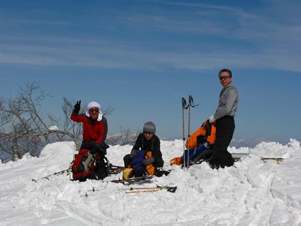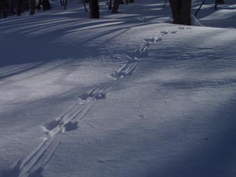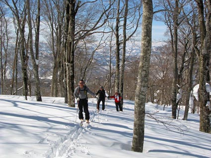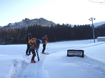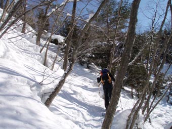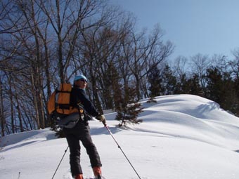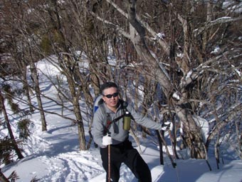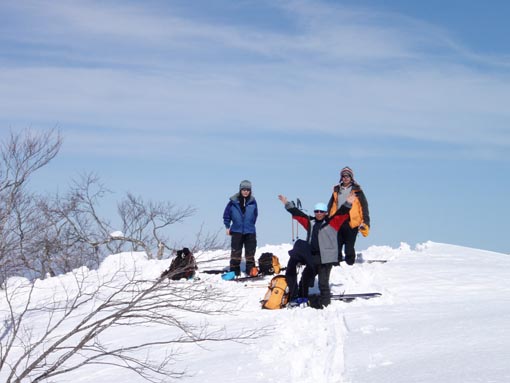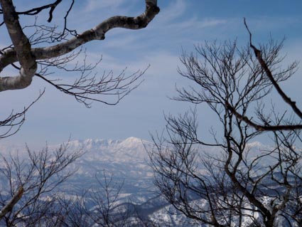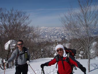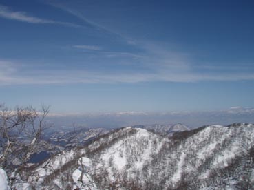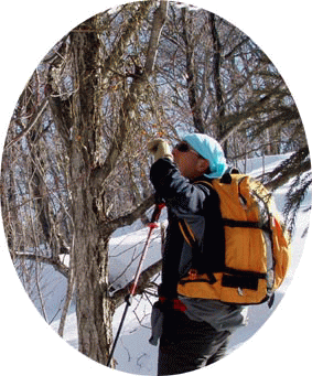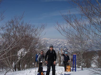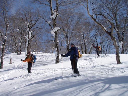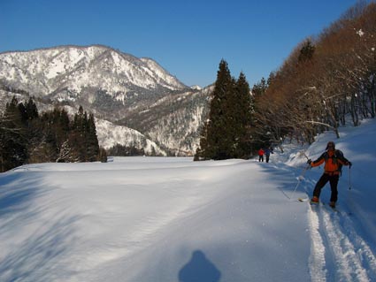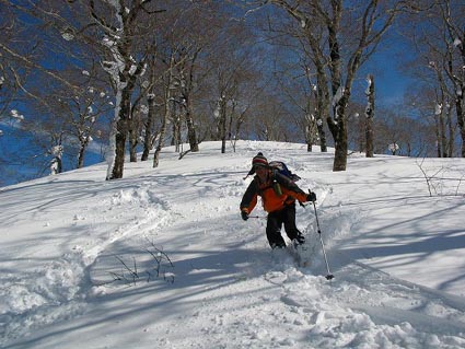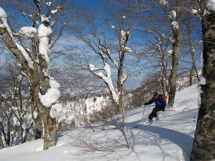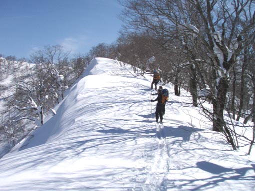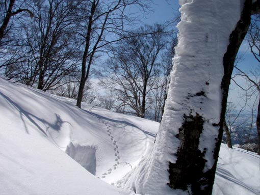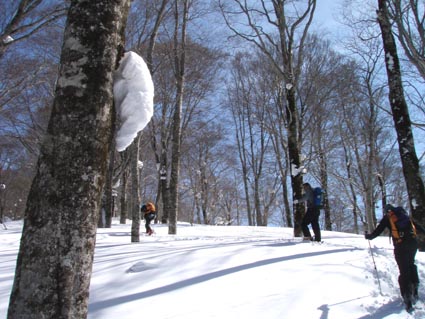 ![]() 1476mピークより(中央に磐梯山 右尾根のピークが博士山山頂) 山スキーで博士山へ 滑りを重視できる山ではないと思われるが藪山が好きな面々の思いを叶えるために来た 朝から爽やかな青空が広がる 道中の車窓からも遠望の博士山が青空にクッキリと浮かんでた。 琵琶首に在る神社(此処から入る) 畑の中を進む 西山の部落を越えて琵琶首に到着した 路肩に車を止めて神社のある畑の中を進んだ 之から登る山の斜面が前方に広がる うえ〜急斜面が待ってるではないかい ![]() 志津倉山前衛の峰を背景に林道をたどる 左斜面を登る 朝日に輝き雪面がキラキラと輝いてる 志津倉山に背を押されて快適に進んだ・・が・・ 直ぐに始まる急斜面に早くも汗を絞られる 斜面には昨日降ったと思われる新雪が15cm位積もり 踏みしめる板の重さでキュッキュッと気持ちの良い音が奏でられた ![]() SONEさん (晴天無風の中で汗を絞られる) Haruさん 最初の斜面をクリアーして一本立てた フカフカの雪を手に取り下りが楽しみだねと話すが 下る頃にはどうなるものかと晴天無風の空を拝むのでした 何の足跡・・? ・・・・白樺に宿り木が・・・・ 続いて現れた斜面も半端ではない 右に左にトラバース キックステップの連続で急斜面を凌いだ 斜面に目をやると 疲れを癒すには最高の贈り物が登場した 新雪のアートに見慣れない足跡を発見して誰からともなく出任せに動物の名前が連打された・・(笑) 此処でようやく林道に出る 林道の目印と思われる・・? 白樺の背高のっぽに宿り木がオブジェの様に絡まっていた ![]() 中腹より上部はブナの疎林が広がる 此処にも見慣れない足跡が 1000mを過ぎたあたりからブナ林に変わる ブナに混ざりミズナラの巨木が目立つ もしかしてマイタケの冷凍が在るかもと提案されるが此処で積雪量は2m弱か誰が雪を掘り起こすのか敢えなく提案は取り消されました ![]() 間もなく尾根が合流する 休憩です(後方に御神楽岳の尖りが見えた) 足下に映し出される木々の影絵を眺めて足を運ぶ 板に張り付く雪 ん〜〜様子がおかしいぞ 太陽の日差しに音を上げたのか雪が溶け出したのだ! 粘る雪をはらい落としながら進むと前方に開けた場所が現れた此処で一本と休憩を取る ![]() 粟ヶ岳〜御神楽岳方面を背景に一本立てる 1476m峰手前のヤセ尾根 休憩を終えて最後の登りだ! 邪魔する尾根が目線に変わり遠望の山々が視界にはいるようになる ![]() 1420m付近の尾根 吾妻連峰が白く青空に浮かぶ 博士山山頂が目の前に現れ雪庇が張り出した尾根を進む 視界には飯豊連峰や霞んで見える朝日連峰そして吾妻連峰の白い峰が横たわる ![]() SEI〜Gonちゃん〜Haruさん (1476mピークにて昼食をとる) Gonちゃん〜SONEさん〜Haruさん 山頂手前のピークで折り返すことにした(山頂までの稜線は小さなコルで滑降は無いと思われる) ピークの足下が張り出した大きな雪庇の上で休憩を取ることにした 展望は360° 北に飯豊山を眺めて左回り守門岳〜越後の山々〜南会津の山々〜日光連山と白銀の世界が広がる 展望を腹一杯に食べてピークを後にする ![]() 守門岳〜浅草岳〜会津朝日岳方面の遠望 ブナ林を滑る(Haruさん・Gonちゃん・SONEさん) いよいよ滑降開始 雪は重くなってるが板は喜んでるようだ 斜度があり面白いように滑る斜面 ブナの林間が適度にありターンには苦労がいらない 下山は尾根を分けて北にコース取りをした 最初は慎重にコースを選ぶが走り出した板は止まらない 三度目の尾根でコースが外れた事に気がついた 時すでに遅し予定の尾根は一つ南にありました・・・(苦笑) ![]() ![]() ![]() 宿り木の実を食べるSONEさん 宿り木の実を食べるSONEさん ん〜〜〜変な味だが食べれると誘われるSEI SEIもパクリ ん〜〜〜 ダメだ 口からは粘りのある糸が繋がり吐き出された(決して食べないで下さい) ブナ斜面を食べる面々SEI ![]() Gonちゃん Haruさん ブナ林の素晴らしい斜面を下れば 次に灌木林の滑降だ此処でも林間は確保されグングン滑り降りた 次に尾根上に松の林が現れる此処は少し手強いぞー 次々と小さな尾根が現れる 谷に入ろうかと覗くが斜度が在りすぎる 雪面をずらすと大きな雪の固まりが勢いを増し転げ落ちる 次の尾根まで巻こうとトラバース 最後に杉林の谷に滑り込んだ 此処は正解で難なく道路まで出ることが出来ました・・・・が・・・・車を止めたところまで戻ることを余儀なくされました 大展望の博士山へ参加の皆さん楽しい一日を有り難うございました 帰りの温泉は西山温泉(せいざん荘)で¥310汗を流し 美味しい蕎麦と冷たいビールで打ち上げと成りました。 ・・・SEI・・・ 戻る |