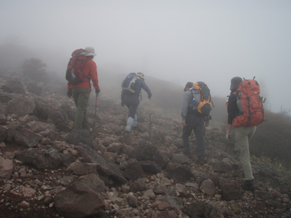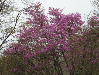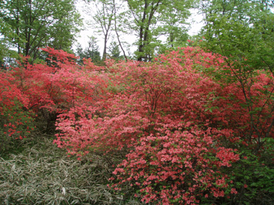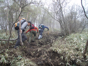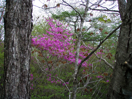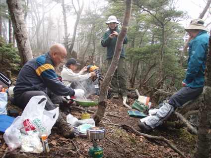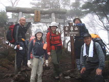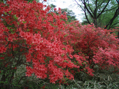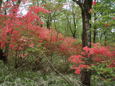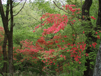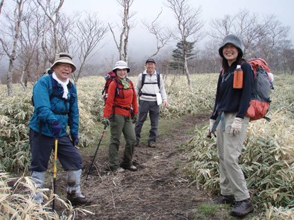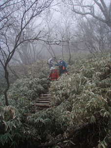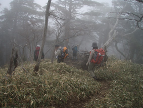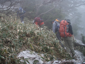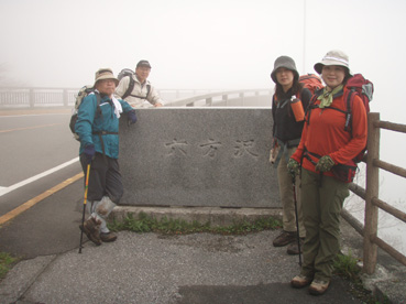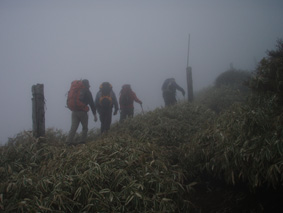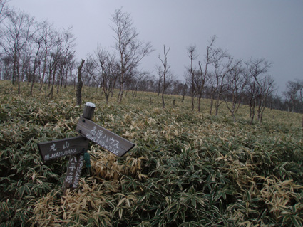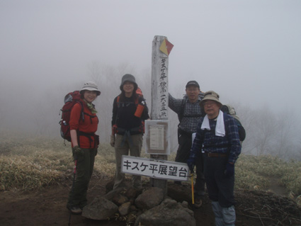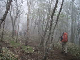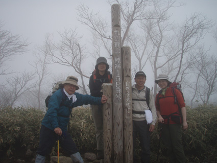 ![]() 霧降高原のツツジ 赤薙山〜丸山と歩いてきたが1700m以上になると 木々の芽吹きもなく残雪も見られた。 霧降高原の山麓はツツジが満開で見事の一言に尽きる ムラサキやアカヤシオは最盛期でシロヤシオは咲き始めと言う所でした 道中の山草はまだ冬眠から目覚めてなく(~o~) 2000m以上の山の芽吹は之からと思われます。 ![]() 登山口にあるヤシオ(Ariさん・su−さん・yu−kariちゃん・gonちゃん) 登山道を進むとムラサキの見事なヤシオが現れた 早速道草タイム 既にシロヤシオへと衣替えをしたと思われた山肌はまだまだピンクや赤に染められてる ![]() 途中に在るゲレンデハウス ガスがうごめく林 以前はスキー場であった霧降高原も今やリフトの運行は4月下旬から11月上旬までとなり 登山者が利用する足と成ってた。(我々は歩きです) 分岐を過ぎると滑る登山道に変わる 笹に覆われた山肌は昨日の大雨で滑りやすく、木々には水滴が宿り触れた手の震動で転げ落ちる 登るほどに木の芽は固く閉じて飾りのない枝は寂しげです! ![]() 展望台はガスに閉ざされてた(yu−kariちゃん・gonちゃん・su−さん・Ariさん) 大展望を約束してたキスケ平は何も見えない、時折霧雨も混じる稜線歩き 太陽が顔を出すことは一度もなかった ![]() ゴーロを行く 残雪の稜線 登山ガイドには展望の良い稜線とあるが ガスには勝てない 此処は心の目で見ることにとSEIが言うと SEIさんには無理でしょうと急ぎ早に返事が返って来ました・・・(笑) ![]() ![]() ![]() ![]() 楽しい昼飯です(そば飯・チャーハン・サイコロステーキ・野菜炒め・等々) 山で食べる物は何でも美味しい 美味しいねと連呼の仲間・・・・でも・・・と・・・・? マークが飛び入り (~o~) 美味しいからと同じ物を下界で食べると大変 あじが180度変わる。。。。そんなことも在るけどね!と楽しい食事の時間でした。 ![]() 山頂にて(SEI・gonちゃん・yu−kariちゃん・Ariさん・su−さん) 下山前に集合写真 男体山から女峰山と大展望を背景にと成るはずでしたが 白く漂う空間から青い空が覗くことは在りませんでした ![]() 笹に覆われた登山道を下る 丸山山頂 至福の休憩を終えて下山 残雪に足を取られ悲鳴も仲間入りだ 何も見えない寒い登山道を、晴天の登山日よりの中を歩くような陽気なメンバー絶えず笑い声が響き渡る 丸山の分岐からは登り返しの胸突き八丁が現れた そんな登りもほんの一走り(でんでん虫歩き)で山頂に着く 山頂は広く晴天には賑わいを見せてるのだろう休憩用のベンチも用意されていました。 ![]() 丸山からの下り 八平ヶ原(Yappeigahara) 回り込む下山道は階段や整備されてる所もあるが殆どが笹で覆われた道無き道が続く 足探りで進む場所も多い 八平ヶ原まで来ると笹が刈り払いされてる 霧降高原道からハイキングで訪れる人達が此処までは来るのではないかと勝手に想像した 分岐の笹平 八平ヶ原の笹平は広い平原です 絨毯を敷いた様な光景の中に熊の親子がじゃれてる姿が幻想の中に現れた 急いで逃げる ホ〜〜〜レ 逃げろ そんなことを連想するのはSEIだけで皆さんは少しガスが薄れたところに山が現れたと大喜びでした。 ![]() 六方沢橋の景観は真っ白 記念写真です 帰りのお目当ての一つは六方橋の景色でした しかし此処でもガスが邪魔をする 橋桁が確認できるだけで景色はおろか数十メートルの視界しかなくなる ![]() シロヤシオ ![]() 此処からは花・花・花・・・・ gon & yu−kariちゃん ![]() ![]() ![]() ![]() 晴天が予想された今回の登山でしたが一日中ガスの中で・・・(>_<)・・・しかし 下山後に麓の温泉に入り まったりとしたソフトクリームをAriさんからご馳走になり心は晴れ晴れ気分は爽快 Ariさん美味しいソフトクリームでした、またヨロピクで〜す Ariさん・su−さんyu−kariちゃん・gonちゃんありがとう ・・・・SEI・・・・ ![]() 東小屋でくつろぐsu−さん |
