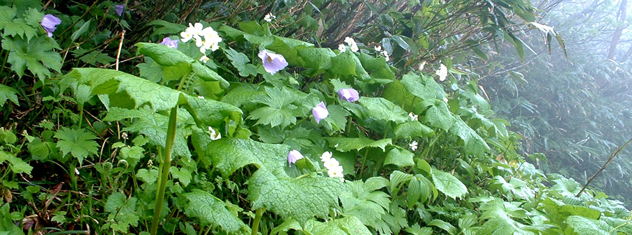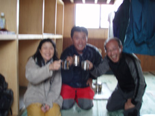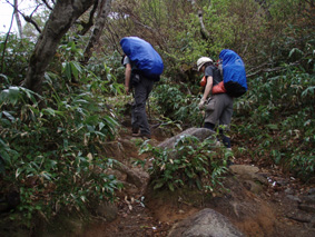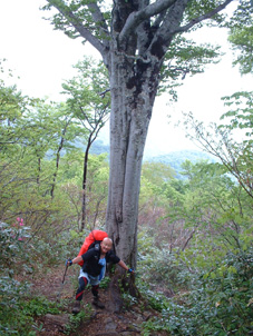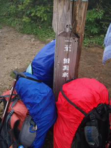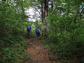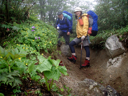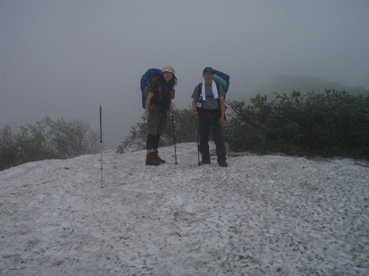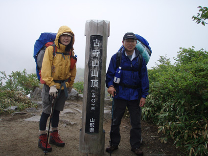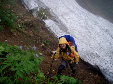 ![]() 雨に濡れた登山道に咲く花 東北道を北に走る車窓からは朝焼けで雲が赤く染まる空が在る こんな日は天候が崩れるんだよな・・・ などと話しながら目的地へ。。。 登山口の古寺鉱泉にはAM6:30到着 登山開始予定がAM7:30・・・ まだ時間があるとコーヒータイムへと洒落込む! ![]() ![]() 道中の花ー1登山準備も整えAM7:10に駐車場を後にした 古寺鉱泉(朝陽館)の前を通り古寺川の渓流に送られて登山道へ進む 標高を稼ぐ登山道は斜度が増し息が上がりカタツムリ歩きに! 視界に入る山ツツジの赤は、新緑に映え疲れを緩和してくれる妙薬だ。 登りには所々に平地が現れて一息つく絶好の場所です。 ![]() ![]() 道中の花ー2平地でザックを下ろし行動食を取り出してると体がグラッと揺れた あれ〜地震かなと仲間に話すと いや〜何も感じないよと返事が返る しかし正に此の時が岩手・宮城内陸地震が発生した時間でありました。 (小屋に着くと先着の登山者が携帯で情報を集めてました) 古寺山の手前からは雨が落ちてきて雨具を着込む ガスで視界は閉ざされ、風も強くなってきた そんな登山道にはシラネアオイを始め高山植物が列を成して現れ綺麗だ。 前方には残雪も現れ登山道を隠し雪渓歩きに変わる。 小朝日岳のトラバースは斜度の在る残雪歩きだ 滑ったら谷底にまっしぐら・・・ う〜〜〜怖いはgonちゃん ![]() ![]() ![]() 道中の花ー3そんな登山道もクリアして銀玉水に到着 美味しい清水で喉を潤し(寒くて余り飲めませんでした)小屋に向かう 此処からの登りは急坂の雪渓歩き、一歩一歩足場を確認して登る ガスで地形を確認することは出来ないが 前も後ろも右も左も白の風景に惑わされた。 そして小屋に到着、地震の話に耳を傾けた 山間部で大規模な地滑りが発生し住宅など建造物の全半壊があり死傷者も出てる事が判りました ![]() ![]() 道中の花ー4小屋に入ると風がだんだん強くなりヒュー ひゅーと風の切る音が聞こえる 風と雨で外に出ることも出来ず山談義を楽しもうと宴会に突入した 隣に単独行のNさんが食事の準備をしてる、一緒に飲みましょうと。。。 強引に・・仲間に引きづり込むSEI (*^_^*) ![]() ![]() 道中の花&カエルー5Nさんは途中で私達を追い抜いて来た韋駄天登山者だ 凄い早さで登る姿は只者ではないと記憶してたので、直ぐに話が合い楽しく過ごすことが出来ました 新潟のNさん お付き合いいただき有り難うございました ![]() 登山口で(su−さん・gonちゃん) 朝日鉱泉 空模様が悪い中、登山口を出発する 渓流の音を耳にして5分も歩くと朝陽館に着く、まだ準備中の看板が下がってる宿の前を通り登山道に取り付いた。 ![]() ブナと松が合体してた 雨が降り出した 山ツツジの赤が見事な登山道を進む、途中に立派な二本の松や合体の樹が現れる 登るにつれてガスが懸かり山並みは隠れん坊、ひたすら花と話をしながら登りました ![]() 見事なブナの木の下のSEI ![]() 後方は古寺山 ハナヌキ分岐にて 古寺山が見えてくると雨がポツポツと降りてきた 雨具を着るには蒸し暑い、もう少し我慢をしようと水も滴る良い○○、私達は例え様もないくらい汗が滲み出る ![]() 三沢清水(未だホースが繋がってません) 間もなくガスに突入 三沢清水に着く、出てない水のホースを辿る 目にしたのはグルグル巻きになった清水の出口に繋がってないホースでした。 (笑) ![]() 雪渓が現れる 古寺山 山頂にて(gonちゃん・su−さん) 古寺山の2〜300m手前に雪渓が現れた。 ここは下りで迷う人が多いと下山してから朝陽館のご主人に聞く・・・ 実際に私達が下ってきたときに迷って行く先を見失ってた登山者が居ました ![]() 花が多く彩りを魅せる登山道 古寺山を過ぎると花のオンパレードで賑やかな登山道に模様換え 雨に濡れた花は清々しい色と肌を惜しみもなく披露してくれる、遠望の利かない風景に変わり 途轍もない身代わりが現れました。。。。 ![]() 小朝日岳の分岐 小朝日をトラバース熊越えの分岐に着く、此処からは一旦下りになる (行く先の見えない登山道を眺めて、せっかく登ったのに下りだ・・・・と一言) ![]() 銀玉水で一休み 横殴りに吹く強風、ガスが波打ち通り過ぎる 天候が良ければ絶景の稜線歩きのはずだが今日の景色は足下の花だけです 銀玉水に着いて清水に下りた、パイプからコンコンと湧く名水をカップ一杯に注ぎ流し込んだ先は喉ちんこでした。 ![]() 勾配が増す雪渓 小屋に到着 銀玉水から先は勾配の在る雪渓が待ちかまえてた 周りの状況が解らないので歩きが鈍る モクモクと登る見えない風景を気にしないで登る・・モクモクと! 登り切ると平坦な稜線に出た、強風が雨と共に体にぶつかる 体が冷え寒く感じる、体感温度はかなり下がってるのだろう話す言葉も舌が回らない、 しかし程なくして靄の中に小屋が現れた 到着です。 ← 酒が回り焦点が合わない宴会が始まる(gonちゃん・Nさん・su−さん) 小屋に入るなり防寒着を着込み、ガスコンロで湧かしたお湯で味噌汁を作る 体を中から外から温めて本格的