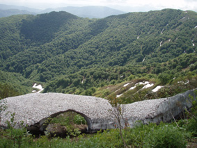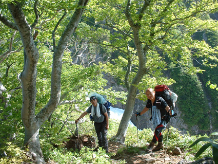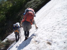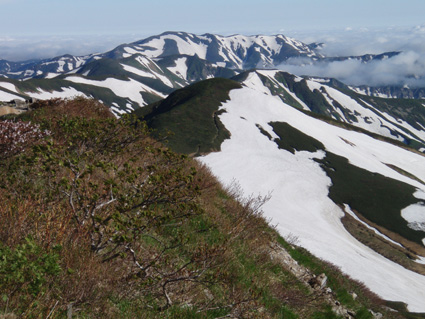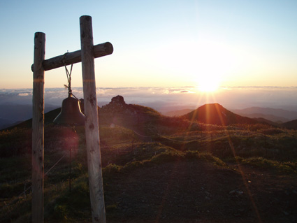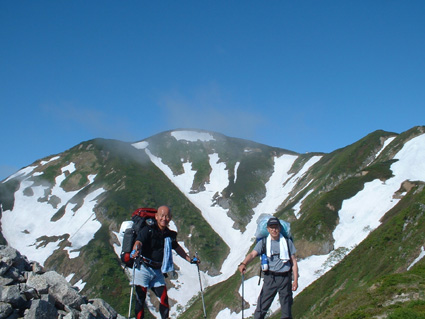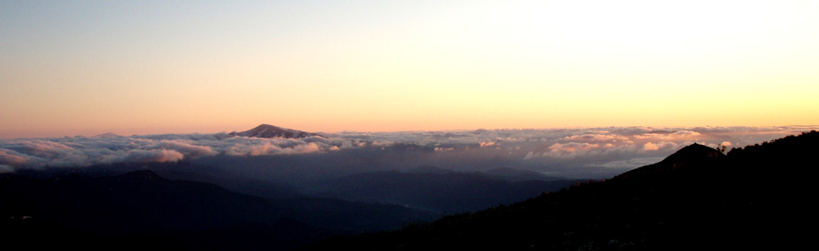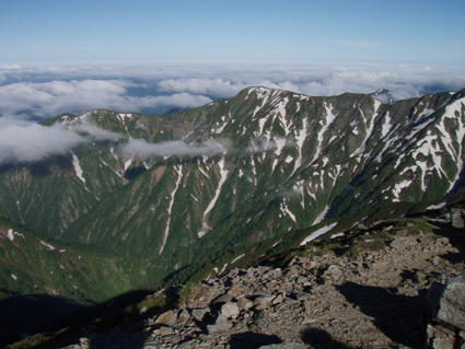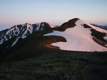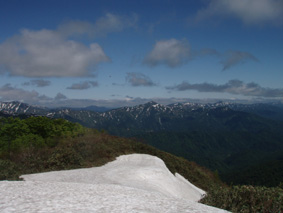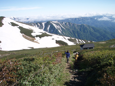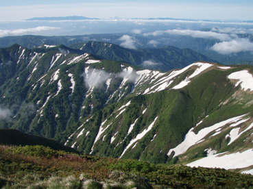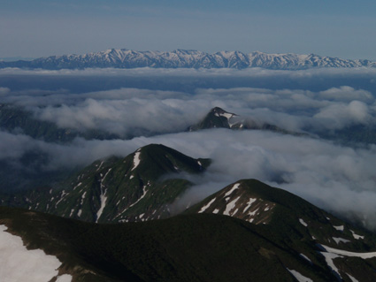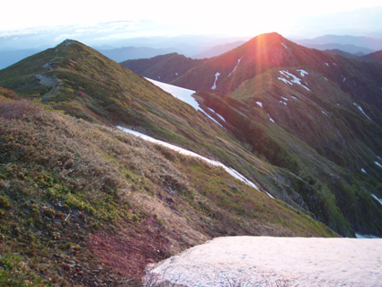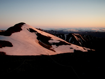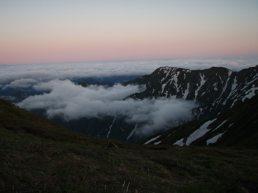 ![]() 日の出 (月山が雲海から顔を出した) ![]() 日の出 小屋を染める朝日 夜中の風雨も止み静かな朝を迎えることが出来た 起床はAM3:50分 日の出を拝むために外で夜明けを待つ、空が変わり色が濃くなり、赤く染まる雲海・・・ 日の出だ! 少しずつ輪郭が大きくなり一筋の光線が広がりを魅せる まさに此処は朝日の楽園なのだ、山が目を覚まし、植物が呼吸をする、耳をすますと天使の声・・・ 昨日はごめんね・・少し荒れ気味の性格を出してしまった朝日岳を、許して・・・ 今日は穏やかな一日を約束するからと囁く声が聞こえた。 ![]() 中岳の朝焼け 鐘に日が差すとき 白い雪が赤く輝き、小朝日岳の頭には三筋の光線が降りた 何も語らなくて良い、天上の風景を心ゆくまで見ることが出来れば、それで満足なんです 太陽の様に優しい温もりに触れる事が出来れば、それで満足なんです ![]() 西朝日岳方面を望む 小朝日岳に日が昇る時 刻々と日が昇り、軟らかい日差しは山を包み闇から解放してくれた 騒ぐ心が走り出す、落ち着かない目線、見ても見ても欲張りな心、同じ風景を何枚も写真に収める カシャ カシャとシャッターの音が響く大朝日岳のピーク、 そう・・・今はお前の物だよ好きなようにして良いよと優しい面を見せてくれた山。 ![]() 雲海が漂う袖朝日岳方面 遠望の雲間に浮かぶ蔵王連峰! 山頂からなかなか下りられない、山並みが俺を離さない虜になったSEI 遠くから磐梯山の尖りが慰める 又来れば良いと! ![]() 左端は新潟から来た韋駄天登山者 Nさん・su−さん・gonちゃん・SEI 下山前にNさんと記念写真を撮る Nさんは、何度も何度も手を振り小屋を離れた、有り難うございましたと振り返り手を振り姿が遠のき消えた ![]() 遠望の白い峰は飯豊山(手前の尖りは祝瓶山) 雲海の月山 Nさんを見送り山頂へ行く、360度のパノラマは気が遠く成るほど雄大な風景が広がる 鳥海山は微かに見え、周りの山々は雲海に裾野を飾ってもらい鎮座してる ![]() 朝日連峰の白い峰 山頂で(su−さん〜gonちゃん) 思いのままに展望を楽しんだsu−さんgonちゃん SEI ![]() 山頂のSEI ![]() 下山前にまったりと眺めた山が印象に残る ![]() 山頂を後にするsu−さん・gonちゃん 雪渓を下るSEI ![]() V字雪渓を背景に! 熊越えのコルにて ![]() 熊越えのコルにて 振り返り大朝日岳を心に留めた ![]() 危険な斜度の雪渓 不思議な空洞 障子ヶ岳方面を望む ![]() 青空に泳ぐタムシバ 宝石を鏤めたような鮮やかな山ツツジ ![]() ![]() ![]() ![]() 間もなく古寺鉱泉です 道中の仲間 古寺鉱泉で入浴 ご主人と暫しの山談義を交わす、その中で山を愛する美談を聞くことが出来ました ![]() 帰り道で食べた蕎麦屋さん 美味しい〜美味しい〜とsu−さん 帰路では茂右衛門と言う蕎麦屋さんに立ち寄る 車の止めるスペースが無いくらいの混み様だ 店内に入り相席で座ることが出来たが、席では多くの人が蕎麦が出るのを待ってる様子 之では何時食べれるかと思ってると、何と一番先に注文の品が出てきた え〜〜不思議 (?_?) 謎を解くには時間は要らない、天ぷらを添える品は時間が係ると言う話でした (私達は盛り蕎麦のため早く出てきた) 蕎麦の味は特級品、店の混み様は味の良さと、話を小耳にすると殆どの人がリピーターの様でした 大朝日岳登山ではNさんと楽しい時間を共有出来ました 朝陽館の主人に良い話を聞かせていただきました 出会った仲間にありがとう su−さん・gonちゃんありがとう・・・SEI・・・ 戻る |