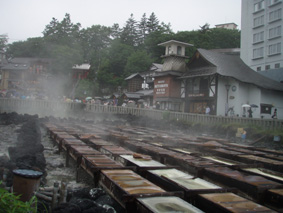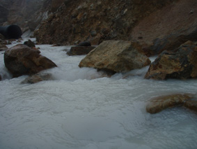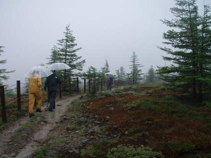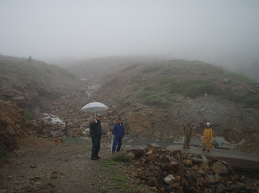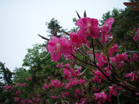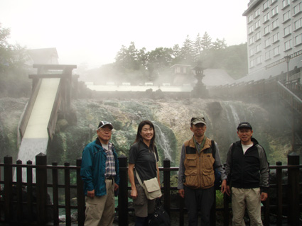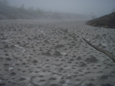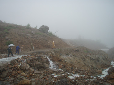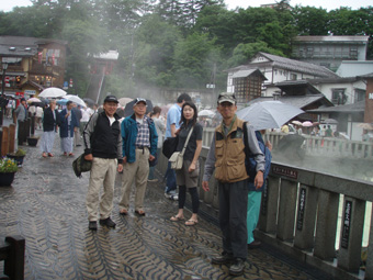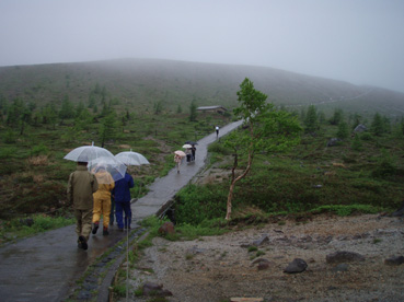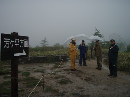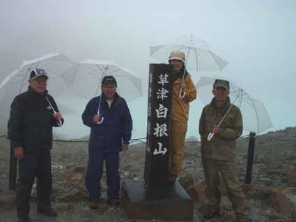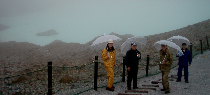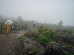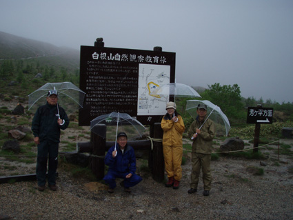 ![]() 湯釜展望台(gonちゃん・ariさん・anさん・su−さん) 夜中・・屋根を叩く雨音が止まない、コテージの朝はドアを開けるところから始まった。 庭先の草花が雨に濡れ生き生きと蘇る 日本の四季は優しい環境を生み出し自然を守る、梅雨の時期も大切なのだ! ![]() 道標にて(ariさん・su−さん・gonちゃん・anさん) SEI コテージにて美味しい朝食(手作りジャムや焼きたてのパンなど)を頂き宿をあとにする 車は一路、よそ見もせずに草津白根山へ走った。 白根レストハウスのある駐車場に着いた私達は、雨具を着込みコンビニで買った傘をさして 湯釜の在るピークへと登る。お釜はガスで全体の姿を見ることが出来ないが (エメラルドグリーンと紹介されてるが・・? 雨の時は違う色に見えるのか・・?)乳白色の水が湖面を満たしてた。 ![]() 道中のお花さん ![]() 白根レストハウス 案内板の前で! 一旦、レストハウスのある所まで下り芳ヶ平へと向かった。 この時点での雨は強さを増し、数年使い込んだSEIの雨具は見る見るうちに浸透して地肌まで雨水が辿り着く 止むことの知らない雨・・・・ますます強くなる・・・ ![]() 展望台を下り芳ヶ平へ 往復の道のりは二時間半と読みザックを持たず身軽な格好で出かけた。 ![]() 柵のある登山道を歩く 残雪の谷 登山道の脇にはミネズオウの可愛い花が群生してるのが目に入り 他にも赤や黄色や白の花が姿を現した。 ![]() 雪解け水が流れる道を渡る ガス危険地帯 雪渓の残る谷は雪解け水が勢いよく流れる、流れを渡るgonちゃん・・・ 水遁の術とばかりトントントンと早足で。。。結果はご想像の通りでした (笑) ![]() 乳白色の水 ガス危険地帯は植物もまばらだ、枯れた木々が黒くなり倒れてる 巨木も倒れ無惨な姿が見られた。 川は乳白色の水で、地表からはガスが上がり硫黄の臭いが風に乗り押し寄せる。 ![]() どこもかしこもガス注意 芳ヶ平までの中央地点 ゴーロの山肌に大きな岩が寝ころぶ、此処が湿原までの中間地点であり 此のあたりから植物が多く見られた、道脇には可愛い花が並んでる。 ![]() 雨が止まない 可愛い小さな花が登山道を飾る 雨雲が垂れ込め、白根山の山並みが現れることはなかった。。。 ![]() 分岐 湿原のワタスゲ ![]() 湿原の案内板 赤が際だつ ![]() 湿 原 木 道 湿原にはワタスゲの白い綿のほかに植物の花はなく、木道の濡れた様子だけが印象に残る。 ![]() 芳ヶ平ヒュッテ 駐車場へと急ぐ 芳ヶ平山荘は準備中の看板が下げられ、雨の日曜日が恨めしそうだ! 途中で会った登山者は団体さんの他に人影を見ることは無く、閑散とした草津白根山の旅となる。 ![]() 草津温泉 湯畑 白根山を後に草津温泉へ足を延ばした 観光客で賑わう湯畑に行くと、閑散とした白根山の湿原を辿った時とは変わり人・人・人の波である ![]() 湯畑にて(ariさん・gonちゃん・anさん・su−さん) ![]() 山本館にて温泉に浸かる(入浴料¥1000) 初めて見た湯畑を思い出に頂き温泉へ 山本館の古風な造りと、贅沢な湯船に入り二日間の旅をしめた。 軽井沢の宿(星の子)での楽しい夕べ 浅間山登山〜白根山ハイキングと歩いた足跡にありがとう su−さん色々とお世話になりました ariさん・anさん・gonちゃん楽しがったない(*^_^*) ・・・・また宜しくSEI・・・・ 戻る |