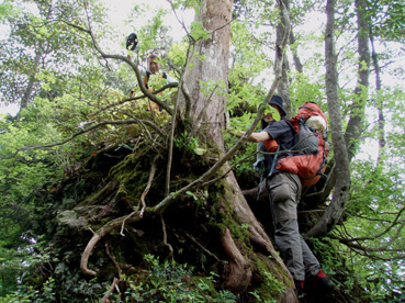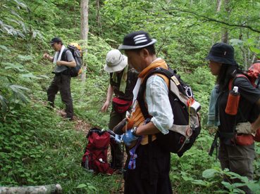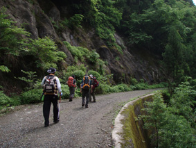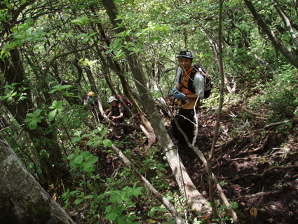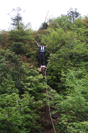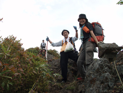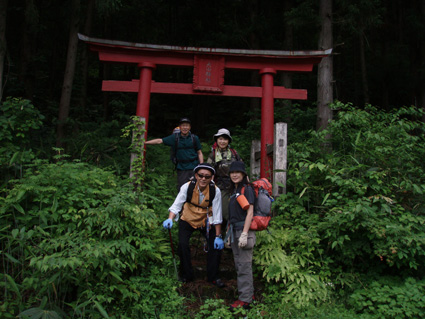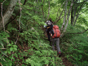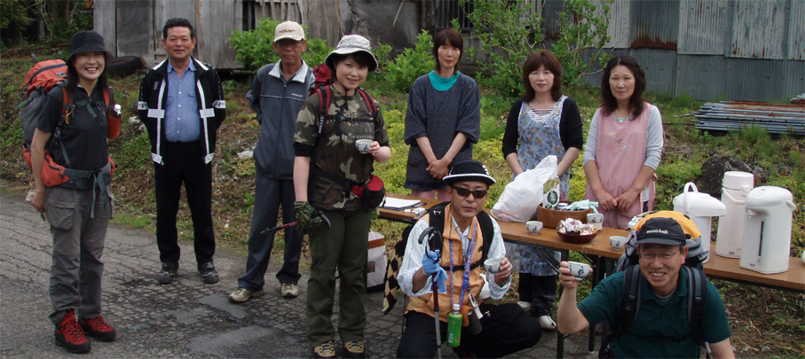 ![]() 闇川登山口にて(部落の皆さんと共に) 大戸岳登山は素晴らしい一日でした 8日の早朝、郡山を出発した この日が大戸岳の山開きで在ることを知ったのは前日です 山開きのイベントが開催されるのは桑原登山口で在るため 静かに登ろうと闇川登山口へ向かう。 闇川の集落に在る登山口に着いたのはAM8:30 そこには闇川区の皆さんが、お茶やお菓子を用意をして 登山者を迎えてくれたのであります。 (*^_^*) (記念バッチ & タオル)もプレゼントあり。。。。 ”記念バッチ”お茶やお菓子を頂きながら山頂をバックに記念写真を撮ったり 区長さんや区の皆さんとお話をしました・・・ 集落のことや町興しのことなど短い時間ながら談笑の一時です。 その中で下山口が桑原であることを話し 私達は車の回収に此処まで来なくてはならない、 手段はタクシーしかないですよね!と区長さんに話すと! な な なんと区長さんが桑原下山口まで車を回してくれると言うのです せめてタクシー代位は払わせてくださいとお願いいたしましたが お金を払うと言うなら車を回してくれないと断られ m(_ _)m 町興しですので気にしないでくださいと桑原へ車を回していただきました。 本当に区の皆さんのお持てなしに感謝いたします お茶やお菓子ごちそうさまでした 美味しいかったです、皆さん有り難うございました。 そんな登山口の始まりから途中の山菜採りや昼飯の一時など また下山口ではイベントの係員の方にドリンクをご馳走になるなどして 下郷町の人情を一杯いただきました。 ![]() 登山口にて(su−さん・SEI・yu−kariちゃん・sawaさん・gonちゃん) 和気藹々の一時を過ごし登山口を出発した 林道には熊注意の看板(熊が多いらしい)が取り付けられてる林道を進む ![]() ゼンマイ畑 大山神社 林道脇にはゼンマイ畑があり収穫時期が過ぎたお化けゼンマイが行儀良く並ぶ姿があった 右手に小荒俣沢の流れを見ながら進むと大山神社です。 ![]() 林道を行く 登山口(yu−kariちゃん・sawaさん・su−さん・gonちゃん) 以前は登山口まで車で入れたようだが不法投棄が多く 部落より先には車止めが在り入れない 約800mの林道を20分くらいかけて登山口に着いた。 ![]() 山姥地蔵さん 緑に覆われた登山道 地蔵さんの姿を確認すると少しずつ勾配が急になる しかし新緑の森は疲れは感じない 足下にはチゴユリ等が咲き気持ちが良く鼻歌まで飛び出し 春日八郎の歌に静まり返るメンバーでした・・・(笑) ![]() 中ツ手清水 急登の道 途中から山頂方面を望む 清水で喉の渇きを癒し 頭から冷水を浴びた 尾根筋の木々の背は高く殆ど風が入らない為に汗が噴水のように飛び出てくるSEI ツルツルの頭から滝状態に流れ落ちる汗・・・ メタボの体がだんだんとしょぼんで来ました ![]() 何かを見つけて鑑賞を楽しむメンバー 中央の尾根を登って来ました 登山道で可愛いお花さんが出迎えるために歩みが止まる 笹藪を覗けばジダケがこんにちはと挨拶を交わす、美味しそうと根本からポキッと摘み採るgonちゃん 続けとsawaさんも夢中になりジダケを追い駆ける なかなか進まない登山道の登り道で 今度はコシアブラを見つけた 旬の時期は過ぎたがコシアブラの混ぜご飯には最適な大きさだ、 隣にはタラノメも仲間に混ぜてくださいと顔を出した ![]() 風の三郎の登り 先頭を行くsu−さんとyu−kariちゃん 山菜に夢中になってる私達を手を振り待っててくれました。 ![]() 風の三郎の岩場 岩に張り付く花(シガザクラ) 岩場まで来ると展望が一変した 霞んでは居るが遠望の山並みが視界に入ってきて、二岐山や那須方面の山々が聳え迫力の風景が広がる。 ![]() 山頂です(gonちゃん・sawaさん・su−さん・yu−kariちゃん) 稜線を振り返る 山頂は足の落としどころも無い程の混み様だ! こんにちは、すみません写真を撮らせてくださいと足場を借りて記念写真を撮る 会津の展望台と呼ばれてる山頂にいたのは一分ほどでした。 ![]() 昼食のブナ林 下山途中に若郷湖を眼下に見る 混み合う山頂を後にして下山路にあるピークで昼飯と成る 広場が無いためsawaさんが倒木を退かし、5人で座れる程度の空間を作り休憩だ! 笹の広場には冷たいビールに続いて冷や奴・冷やしキュウリ・チーズ・グミ・などなど勢揃いです カップ麺も山で食べれば料亭の味と過ぎゆく時間と共に山頂の食事を味わう。 ![]() 下山は急な尾根下り(変化を楽しめる登山道) 桑原への下りは滑る登山道に急勾配ときたもんだ・・・(>_<) 足場を一歩一歩確認しながら下る 滑落したら間違いなく止まらないだろう、そんな急坂である 長々と、この坂道が、ながながと続く、少し緩斜面になるが又現れる急坂だ。。。。 〜ドンドン下りてゆくと〜 沢に下りる手前で単独行のご婦人が滑落、右足の裂傷と打撲のため動けない、足を固定するなど 地元の関係者が応急手当をして緊急連絡をした。 まもなく救助ヘリが到着、上空を旋回するが怪我人の場所が特定できず難儀してる しかし適切な情報を関係者がヘリに送り救助に成功、ヘリは飛