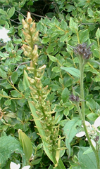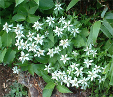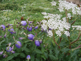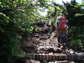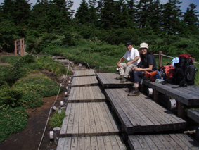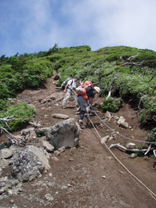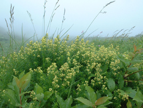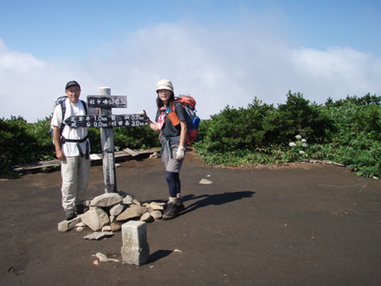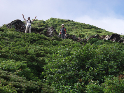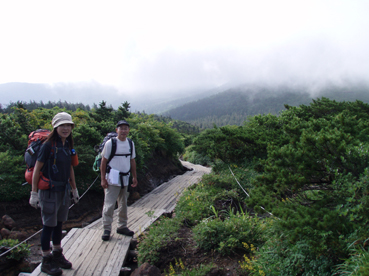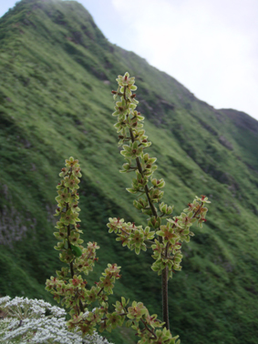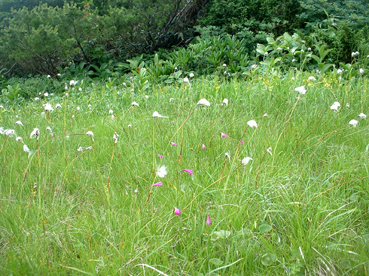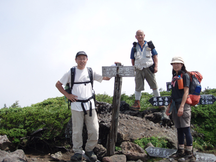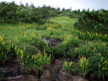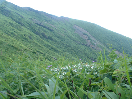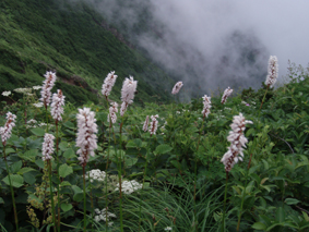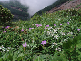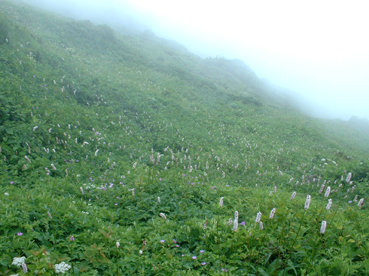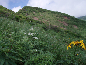 ![]() クルマユリと仲間達 ![]() 刈田峠登山口 木道を進む 週末は雨の予報 登山口へ向かう車窓は雨に濡れ忙しくワイパーが動く 水引入道から登り〜不忘山を一周するコースで出かけて来たが雨の沢コースは避けようと刈田峠に変更した ![]() 刈田岳とハイライン 開けた場所にて 街中の移動は雨が降り続く 遠刈田温泉を過ぎて蔵王エコーラインを進む しかし雨が止む気配はなし 時折雨粒が大きくなる。。。 エコーラインの駒草平付近まで来ると急に日差しが・・・・・あれ〜〜〜 見る見るうちに青空が広がり道路も乾いてるではないか と 言う 事は 標高1400m位より高地は雨が降ってなかった・・? 雨具を着ての山歩きを覚悟してた南蔵王の花旅 一転して晴れ間も覗く中の山歩きとなる。 ![]() イブキジャコウソウと仲間達 ![]() 前 山 稜線を振り返る 可愛いお花が足下を飾り ミネザクラの実が紫に熟し チゴユリの実が赤から紫に変わる季節の変わり目 私達は沸き上がるガスを楽しむかのように稜線を歩く。 ![]() 杉ヶ峰(su−さん・Gonちゃん) 芝草平 前山を過ぎて間もなく杉ヶ峰のピークへ着いた 此処はチョットの休憩で先へ進む。 ![]() イチヤクソウと仲間達 ![]() 芝草平のお花さん 湿原の花はサワランやワタスゲ・チングルマが目立つが之からは夏の花が競って咲くのだろうと移りゆく花々を思う! ![]() 休憩だす そろそろ行くべがない 屏風岳に着く ここで最初の休憩をとりました 早々と赤い缶が飛び出す 実に冷えてる泡の缶 三人で回し飲みは山仲間の礼儀と美味しく頂きました。 ![]() 馬ノ神岳〜水引入道 南屏風岳(su−さん・SEI・Gonちゃん) 屏風岳を過ぎて馬ノ神岳や水引入道のピークが近づくと間もなく南屏風岳だ! 途中の分岐に立ち寄り登山道を逸れ 水引入道の方へ進み眼下に見える池塘を眺めて登るはずの登山道を確認した。 ![]() 屏風岳の斜面に咲く花 ![]() アサギマダラ ![]() 岩場に咲く黄色い花 南屏風岳から不忘山の間は高山植物の楽園です 色とりどりの花が斜面を染め岩を着飾りイブキトラノオが風に揺れる姿を見ることが出来る。 ![]() 切り立つ斜面の屏風岳 お花畑が広がる 屏風の奥には不忘のピーク 人を寄せ付けない斜度の山肌は勇ましくもあり魅力に引きつけられる。 ![]() 最後のピーク 不忘山へ ![]() ヒメシャジン・・? と仲間達 ![]() イブキトラノオ 山頂の祠 不忘山山頂(Gonちゃん・suさん) 山頂からの展望はガスに遮断されてた 「麓を隠す雲はモクモクと動く」 下界は雨なのだろう 天上の楽園は心地よい風がなびく中、揺れる花々を眺め腰を下ろすと 腹の虫が騒ぎ出し丁度時間は飯時だった。 Gonちゃんの手作り漬け物やパンが並ぶ 冷たいトマトやスモモはご馳走です カップ麺を主食に腹はドンドン膨らむ デザートはsuーさんのマンゴーを平らげても未だ余裕とコーヒーを仕上げに頂きました。 ![]() 湿原に咲くキンコウカ 五色岳方面 下山時にキンコウカの群生地を発見 帰路の途中で五色岳を写真に収める 雨に遭うこともなく楽しく過ごした南蔵王の花旅に 満足度200%の山になりました su−さん Gonちゃん 8月の山旅も宜しく ・・・SEI・・・ 戻る |