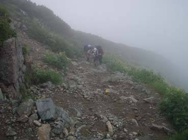 時折パラパラと来るが、すぐに止む雨に雨具を着ることもなく進むが標高を上げることにより重い雲の中に入った。