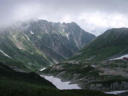 上空を覆う雲の下には剣の八峰が現れ、沢筋には剣沢小屋やテン場も視界に入る