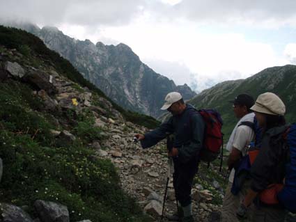 時折ガスが薄くなり山並みが私たちの目線を奪い登山道の花々も際だつ