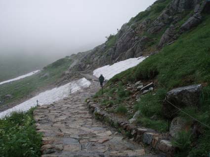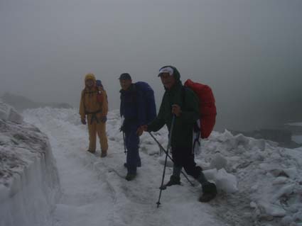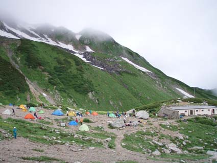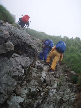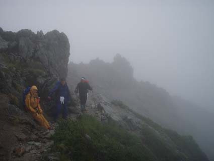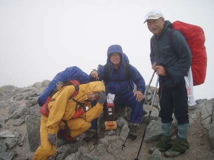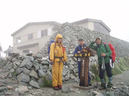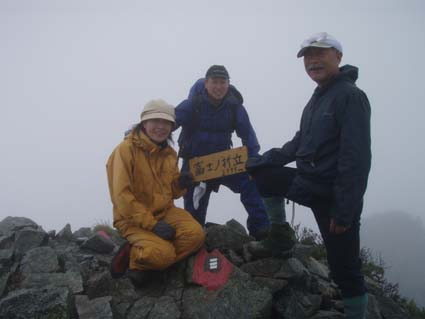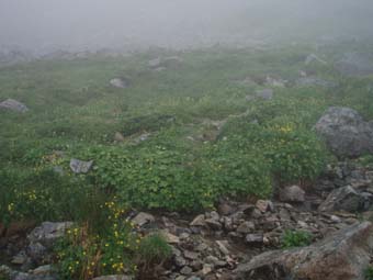 ![]() 別山(右端に剣沢小屋) 剣沢小屋泊まり 夜中は雨と雷の音に寝心地が良いのかイビキの合唱が絶え間なく聞こえ寝不足のSEI まぶたが腫れて視界不良それでも体長が良く朝食を豪快に頂きました。 心配した雨も心配したとおり降り続く、最後のコースは展望台の縦走だ! 小屋を後にして別山へは登り返しの登山道で斜度がお見事です 稜線に出るが期待の展望は皆無 ガスと雨の攻撃の手は緩むことはない。 ピークとコルを繰り返し進む何処までも白い風景が押し寄せる大展望・・笑 それでもトラバースを避けてピーク越えを続けた 富士ノ折立の急斜面は三日目の体には応える(風雨が追い打ち) ここでもトラバースを避けてピークへ登り完全縦走を続ける(大げさかな) 大汝山まで来ると軽装の登山者が目立つ雄山からの登山者らしい 雄山はまるで町中の様相だ ごった返す観光客と交差をしながら一ノ越へ 山荘でカップ麺を食べて室堂へ そして予定の立山登山を完結いたしました ![]() 剱沢小屋を後にする(Nabeちゃん Gonちゃん su−さん) テン場 前日に続き夜中は雷と雨です 屋根を叩く大粒の雨に眠りは浅く今日も寝不足のSEI まぶたは腫れて下がり見通しが悪いが食欲は旺盛だ! 「剱沢小屋は今年で取り壊されると聞く 少し下った所には新しい剱沢小屋が出来てました。」 小屋を出る頃は雨は上がってたが、なんと歩き出して直ぐに大粒の雨が降り出した あとは止むことを知らないのか最終日のコースは、しっとりと濡れて歩く。 ![]() ・・・・道中のお花さん・・・・ ![]() 別山の登り 別山(Gonちゃん Nabeちゃん su−さん) 三田平の緩斜面を進むと直ぐに別山の急斜面が待ってる 分岐に出て左に行くと間もなく山頂に着いた。 大展望の稜線歩きを期待してのコースはまるで闇の中を歩いてるようだ。 ![]() 雨が降り続く稜線 真砂岳 かすかに登山道に現れる奇妙な岩が見えるくらいで白い空間は何処までも続く ・・・降り続く雨に何を思うか・・・ 「雨が降るときは濡れて歩こう」と壊れたエンドレスの歌はNabeちゃんです ![]() 道中のお花さんー2 富士ノ折立の登り 三日目の山歩きに富士ノ折立の急斜面はしんどいです ガスから現れるピークが次々と続く ん〜 山頂はまだかいなと見上げる視線の先がかすむ! ![]() 山頂です(SEI〜Gonちゃん〜su−さん〜Nabeちゃん) トラバースをする登山道にザックを置き山頂まで足を伸ばした 標高は2999mと剱岳と同じ事に気づく・・・ ![]() 道中のお花さんー3 小屋の前で記念の写真 最初の予定では此処でビールを頂き休憩する・・が・・・寒くて誰からもビールを飲む話が出ない このメンバーでは珍現象と言わざるえないか (笑) ![]() 大汝山(山頂です) 3015mの山頂にて なぜか笑顔はない。。。 ![]() 雄山山頂です 最後のピーク 雄山 ここは軽装の登山者が多く凄い人混みです 長居は無用と下山する。 ![]() 道中のお花さんー4 ![]() 一ノ越を後に! 小屋まで下りて腹ごしらえ カップ麺の温もりが臓物に伝わり我に返るメンバー 雨と白く覆われた稜線歩きに休憩も取らず歩き続けた私たちは疲れもピークでした。 ![]() 道中のお花さんー5 ![]() 室堂の登山道には残雪が在りました。 室堂の道には雪が残り暑い時には自然のクーラーの役目を果たすだろう しかし今日の天候には無用の置物ですが雰囲気を醸し出すには良い役柄でした。 ![]() 山の仲間です。 室堂のお花畑! 二泊三日の山旅も終了 危ぶまれた剱登頂も果たし立山のピークも踏むことが出来て大満足です 北アルプスの雄大な地に触れた時間は私達の記憶に残る体験で宝物でもあります 振り返れば全てに満足を頂き感激の瞬間が蘇る旅でした。 リーダーNebeちゃん su−さん Gonちゃんありがとう ・・・SEI・・・ 戻る |