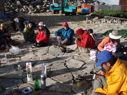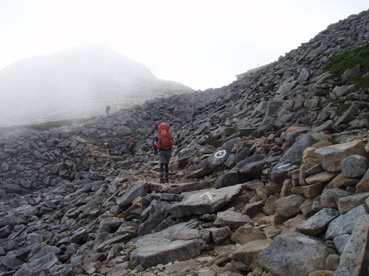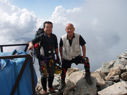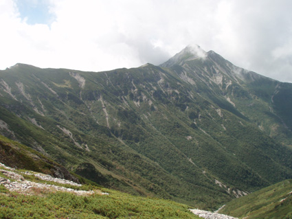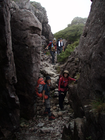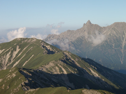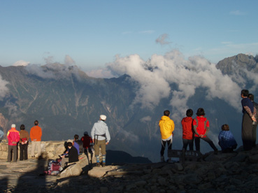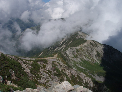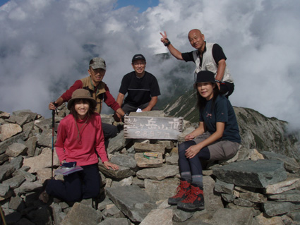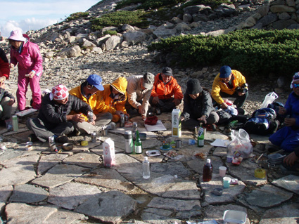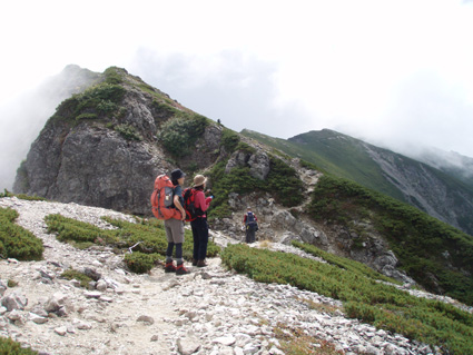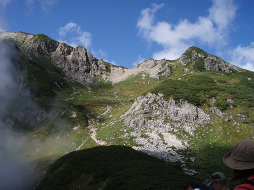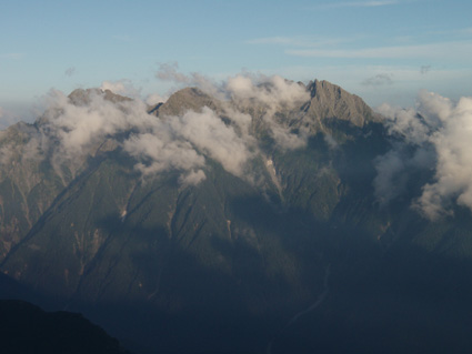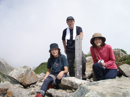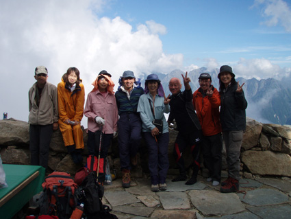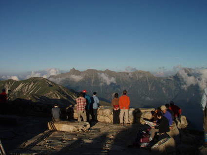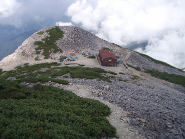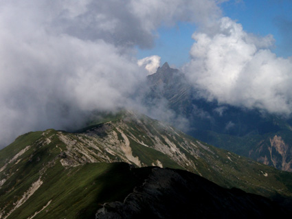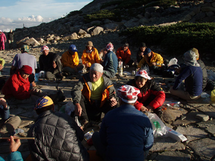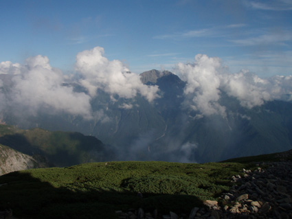 14日の後編 (@_@) 14日前編へ戻る ![]() 眼下に秩父平(カールを登りコルに出ると稜線へ) 秩父平から見る鞍部は青空とのコントラストが素晴らしく 山肌のゴツゴツした岩がアルプスの地を行く私達を引き止め夢想の旅へご案内・・・無意識の時間だけが過ぎ去った。 ![]() 稜線へ出ると笠ヶ岳が現れる 前方に抜戸岳 近づく笠のピークを眺めては振り返る 「今きた道を」 咲き残りの花が秋空の下に一輪見れば 斑な空間の青空までも花模様に見えてしまう。 ![]() 抜戸岳にて(Gonちゃん・Suーさん・sakuraちゃん) 登山日和の快適な歩きに抜戸岳を横切るトラバースは要らないと山頂まで足を延ばす 記念写真の一コマに味のある道標が花を添えてくれた。 ![]() 抜戸岩 笠ヶ岳山荘手前のガレ場 登山道に現れた切り立つ岩 赤褐色の岩は抜戸岩と言うらしい 何とも不思議な空間にチョット触れることが出来た。 目の前のガスが飛び去り笠ヶ岳と山荘が目に留まる テン場を過ぎると大きな岩が並んだ登山道に変わり 目印の白いペンキを道筋に辿ると小屋の前に出た。 ![]() 眼下に笠ヶ岳山荘 稜線を振り返る 小屋で受付だけを済ませて山頂へ 「山頂は凄い人です。」 眼下に山荘と小笠を見て、目を移動すると動きの速いガスが山並みの姿を変える・・・手品師の様だ! 山頂にて(sakuraちゃん・Sadaさん・su−さん・SEI・Gonちゃん) 山頂の滞在時間は20分程度 360度の展望を足早に眺めて山荘まで下りた。 ![]() 合流した飛騨の山男さん&SEI 道中の仲間 (@_@) (Sadaさん・sakuraちゃん・とんちゃん・Sinさん・柴さん・SEI・su−さん・Gonちゃん) 下山途中に山男さんを発見した 手を振るも気がつかないようだ ザイルを身につけたお仲間に挨拶をして山男さんを確保・・・(笑) 遡行してきた沢を案内していただき写真を記念に撮りました。 外の縁台で飲んでると道中を共にした和歌山の柴さんとSinさん&とんちゃんが到着です 何かの縁と穂高岳を後方に写真をカシャー 思い出のページができあがりました。 ![]() 槍の穂先 穂高岳 刻々と変わる山並み 沸き上がる雲が監督の居ないドラマを演出をする 見え隠れする穂先やキレットが登山者の心を引き付けて放さない 此が2897mのスクーリンに映し出された傑作である。 ![]() 飛騨山岳会のメンバーと合流しました 飛騨のお酒は美味しい ビールが冷たい 山頂で手料理が食べれた 私達のメンバーは遠慮と言う文字を忘れて飲んでました・・・(苦笑) ![]() 美味しいお酒とツマミが豊富です これほどのお酒を持ち上げた飛騨山岳会のメンバーは豪傑揃い 優しい言葉と気さくなお話に心引かれて仲間入り ほんとうにご馳走になりました。 ![]() 賑わう大宴会は北の大展望の地で! 時間を忘れて飲み明かす ****芋煮会の会場ではありません**** この風景が笠ヶ岳のピークとは語らねば判るまい・・・そんな不思議な写真に見とれて記録を書くSEIです・・・ ![]() 登山者の視線は何処に 景色は旅人を虜にした ただ佇み動かない人模様 自然の偉大さが目の当たりに出来る空間が此処にはある。 ![]() 天をつく穂先が青空に飛び出し雲間に穂高のキレットが浮かぶアルプス聖地! 何度も何時までも飽きることがない画面が流れて 目に焼き付け心に留まる風景が一枚一枚と入れ替わる 同じ峰なのに何で違う画面になるのか 素晴らしい監督の下で。 ![]() 日が落ちて小屋に入れば地獄のすし詰め 足を踏まれ身動きも出来ない部屋で ただただ耐えて朝を待ちました。 ・・・・・15日に続く・・・・ 戻る |