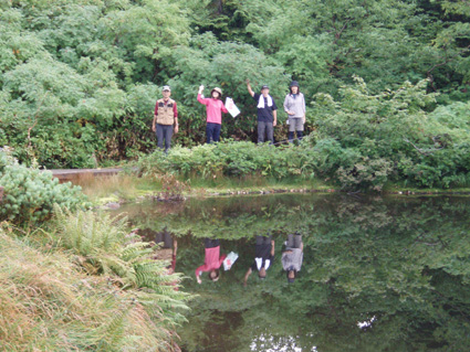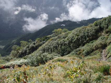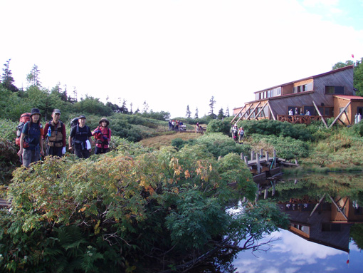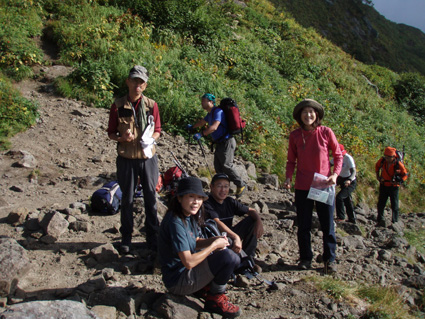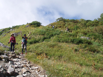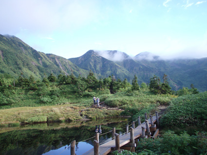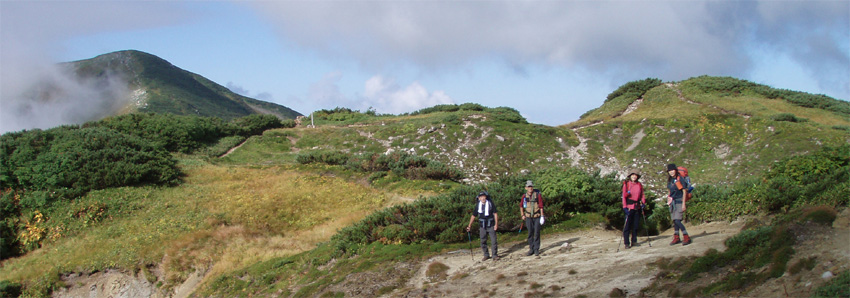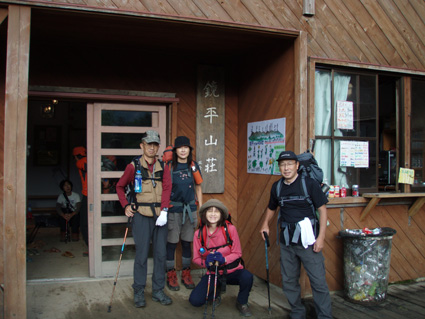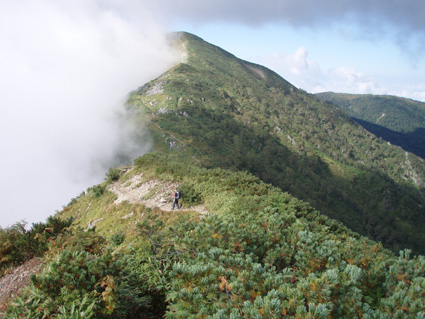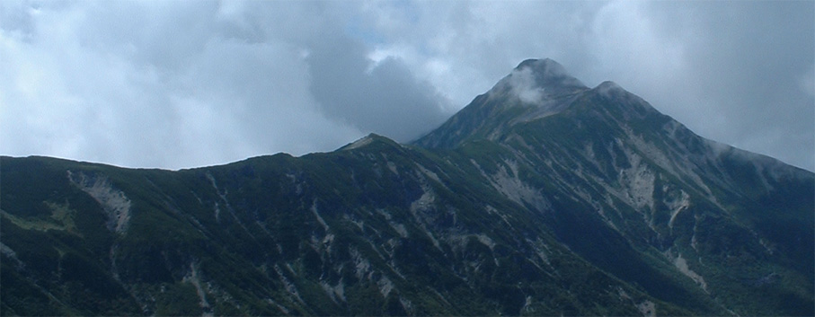![]() 抜戸岳より(笠ヶ岳) 二日目は朝から全開の展望歩きになる 山荘から一時間で稜線に出た。鏡平山荘を眼下に「槍〜穂高〜黒部五郎〜双六岳」などを視界に 歩く稜線は、正に北アルプスの大展望を思いのままに描くことの出来る空間である 沸き上がるガスが穂高の稜線を隠すと北に位置する黒部の峰々を醸し出す優しいアルプスの顔があり道中を楽しむことが出来た。 弓折岳〜大ノマ岳〜抜戸岳と進むと目の前に笠ヶ岳の勇姿が迫る。稜線歩きももう一息で山頂だ! テン場を横切り岩の積み重ねられたガレ場を登ると笠ヶ岳山荘へ到着、受付を済ませて山頂へ行く 山頂は登山者で埋められて休む場所も無い、大展望もそこそこに記念写真を撮り下山する 下山途中で山荘裏手からザイルを身につけた数名がオーイと呼ぶ声が聞こえた あれ〜 もしかして山男さん達ではと手を振るも無視される・・が・・・やはり山男さんのグループでした そこからは合流して大宴会の始まりです。 飛騨の銘酒に鍋料理&山頂にも係わらずギンギンに冷えたビール(謎でした)が登場し 飛騨山岳会の方々の優しさと豪快な飲みっぷりには感激と驚きでスケールの違いを味わうことが出来ました。 ![]() 鏡平池を早朝散策に出かける 小屋の朝は早い 早出の登山者は4時には出発です 私達も5時に起床 近くを探索する 鏡の様な池の水面にアルプスの姿が映し出されてた。 ![]() 山荘前で(Sadaさん・Gonちゃん・sakuraちゃん・Su−さん) 青空が広がるアルプス 朝食を済ませ鏡平山荘を後にしたのは7時 見上げれば済んだ青空には鱗雲が漂い 向かう先の稜線には先行した登山者が列をなして登る姿が見られた ![]() 山荘とお別れです 素晴らしい山荘の夕べを思い出し 水面に映し出された真新しい建物に別れを告げ 二日目の旅立ちです。 ![]() 眼下に鏡平 弓折分岐にて休憩 灌木林の中をくぐり 弓折岳の山腹を登ると双六岳との分岐に出る 登山者の殆どが抜戸岳方面へ進む 双六経由で槍へ向かう登山者は少ないようだ。 ![]() 左に大ノマ乗越 稜線へ出ると槍方面の峰はガスが慌ただしく動き隠れん坊〜 代わりにと顔を出すのは黒部五郎岳や水晶岳〜燕岳の圧巻に視線が飛び跳ねる ![]() 大ノマ岳 双六岳方面 稜線を境に ガスの漂う空間と青空が眩しいパノラマが稜線漫歩の醍醐味を強調する 視線の先に尖りを見れば、地図を広げてにわかガイドの出現だ! ![]() 稜線歩きを楽しむメンバー 秩父岩 大ノマ岳を越えて急斜面を下ると秩父岩が切り立つ秩父平に付く 此処で本日二度目の休憩をとる。 14日後編へリンク |