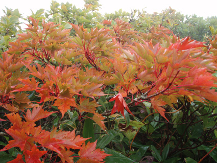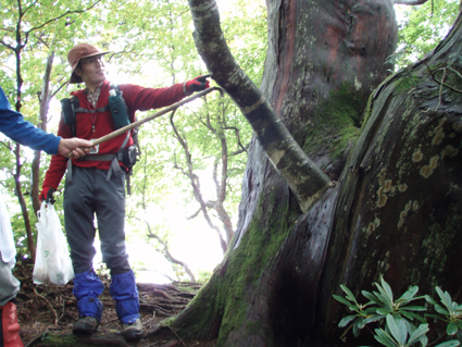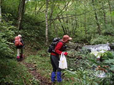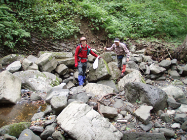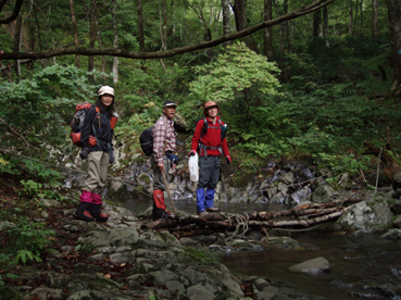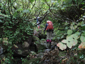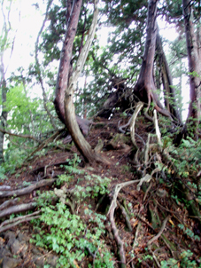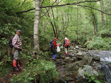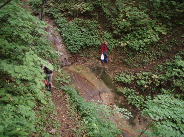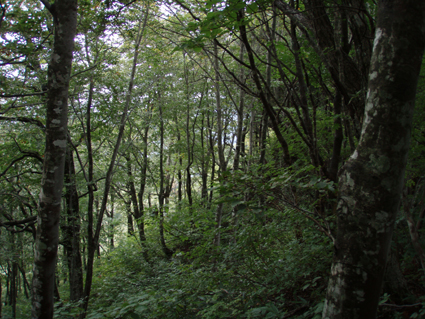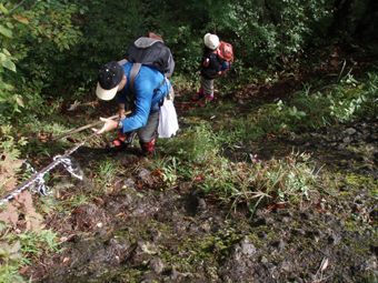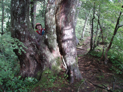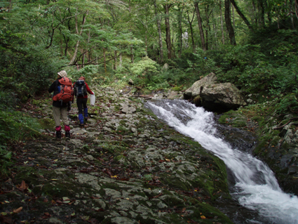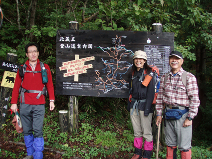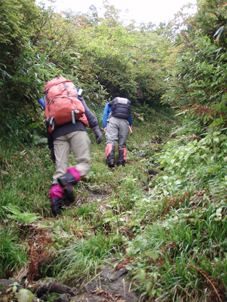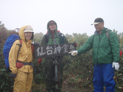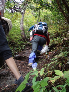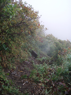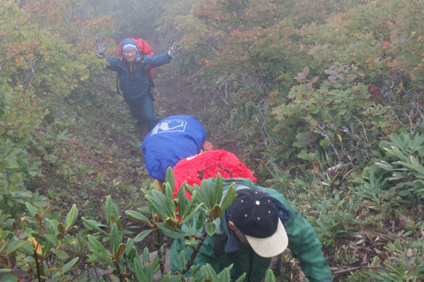 ![]() 仙台神室岳(左のピーク) 紅葉が始まる 土曜日の早朝自宅を出て笹谷峠に着いたのが午前7時過ぎです 峠で準備をして強風の中、仙人大滝登山口へ移動した 登山口まで来ると強風は谷までは付いて来ることが出来ないのか木々が揺れてない このぶんだと風も当たらず快適に登れそうだとブナの綺麗な林を眺めて出かける。 登山道は沢に面してるところが崩れ渡る箇所でチョイ冒険だ! このコースは変化があり面白い道で登りが低速に成りました 時々キノコがお出ましして山に入るなど山頂がどんどん遠くなる道草登山だ! 道中には小滝や稜線上に出てからの急斜面の岩場や 不思議な木(檜の中からブナらしい木が出てる)が在るなど飽きがこない 一旦 沢まで下り沢筋を登り返すとダンゴ平に出た。 其処からの稜線歩きは強風と雨の攻撃です 飛ばされそうになりながら急登の道を山頂目指して進む ガスの中から現れたピークが仙台神室岳で山頂は360度の展望のはずが真っ白で何も見えない 吹き荒れる風雨に山頂滞在は数分だ! 東に少しくだったところで休憩してるとミゾレ混じりの雨が降り出した 寒くてビールも飲む気になれないと言いながらビールを飲むメンバーの姿あり・・・(笑) 休憩もそこそこに下山 急坂の登山道は滑り危険がいっぱい 最初に転けたのはSEI 下山までに全員が転けまくりました。 山形神室を過ぎるとガスの隙間から色付き始めた木々が目に留まる トンガリ山までの緩斜面をのんびり歩いてると登山道に熊の足跡を発見した 新鮮な足跡で泥濘にクッキリと残る形が物々しく感じられ 風にざわつく木々の音にも反応して回りを見渡した。 ハマグリ山の手前の崖にはイワインチンの黄色い群生が現れ綺麗だ そこから滑る岩場を登り笹谷峠へ下山した 登山道にシモグミが密生してる場所があり口にするが未だ渋みが在りました。 下山後は仙人沢の道沿いにてキャンプを楽しみ 翌日の朝 Nabeちゃんが渓流釣りをするも中りなしの釣果で釣りは中止 福島まで戻り会津の深山でキノコ採りを楽しみました。 ![]() 仙人大滝登山口(一匹さん・Gonちゃん・Nabeちゃん) 滑 沢(仙人沢) 登山口の様子は変わり強風は何処に行ったのか そのくらい静かな仙人沢に着いた 登山道に沿って渓流が平行してる。 ![]() 沢沿いを登る登山道 小さな滝が次から次と現れ変化があり面白い 岩には苔が付き滑りやすく靴底で滑りを確かめながら進む! ![]() 丸太橋 大滝ではないようだ! 沢を何度も渡り上流へ。 ![]() 岩越に渡る 滝が多い 時には大きな岩にお手伝いを頂き右に左にと進んだ。 ![]() キノコを手に探索が続く ブナの木にワラジが巻き付いてる 斜面にキノコが在れば登り 沢に下りてはキノコの探索と忙しい歩きに成りました。 ![]() 滑の沢が登山道を横切る 木の根の階段 この滑を落ちれば痛いだろうな〜 なんてのんきなことを言ってるのは誰だ・・・ 崖ありやせ尾根在りと歩みを楽しむメンバーです ![]() 急登の尾根 本日一番の難所を通過(特別な通過地点ではありません)する ![]() 登り終えると登山道に不思議な木が現れた(裏に回ると あ〜ら不思議) 二股に分かれた古木の檜が現れ記念写真を撮る 後ろに回って大発見 ☆ ☆ ☆ ![]() 檜のど真ん中からブナ・?・の木が出てる 尾根から仙台神室岳 木の胴腹からニョキッと得体のしれない木が出てる 合体したのではなく 本当に穴を開けて突き刺した様な奇妙な形なのだ この木に名前が付いてないのが不思議である 此処で銘々した「宿借りの木」としましょう・・・(笑) ![]() ブナ林の二次林が爽やかな雰囲気を醸し出してた! 山肌はブナ一色の場所に出た まだ夏色の木々は急ぎ足で衣を変えるのか その時期が近くまで来てることが葉先の変化に感じ取られる。 ![]() 沢筋を下りて 登り返すとダンゴ平に出る いよいよ稜線の強風に突入です 沢の頭を見ると木々が激しく揺れてるのが見える と 同時に雨も降り出した ![]() 最後の急坂です ダンゴ平から山頂までは滑る急坂で気が抜けない 木々に助けられ這い蹲るように登る。 ![]() 稜線は強風が暴れてた 山頂に到着(Gonちゃん・一匹さん・Nabeちゃん) 急坂を上り終えると山頂の小さな空間に出ました。 「山頂には温もりを感じる文字の道標が在る」 味のある文字は同行したNabeちゃんの知り合いが作った道標であることが解りました 後編へリンク 戻る |