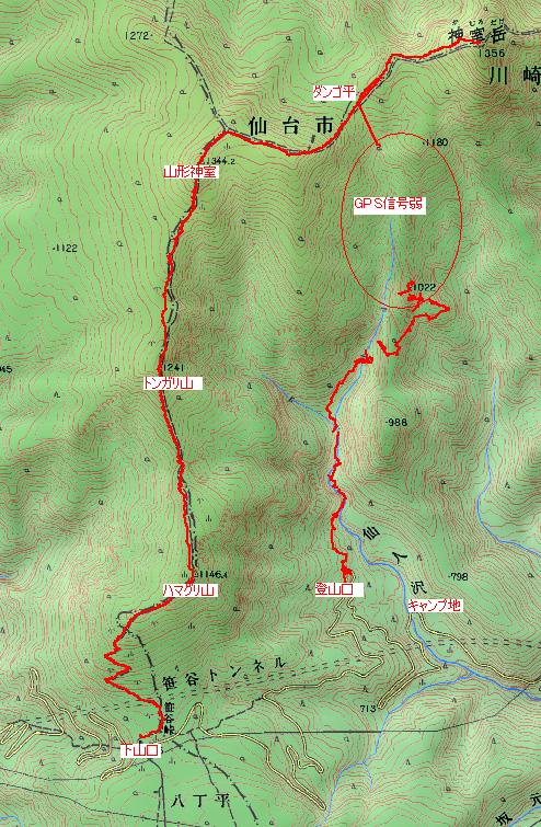 仙人大滝登山口 AM7:30 〜 ダンゴ平 AM10:16 〜 仙台神室岳 AM11:00〜 休憩(30分) 〜 下山 〜 山形神室 PM12:44 〜 トンガリ山 PM1:14 〜 ハマグリ山 PM1:49 〜 笹谷峠下山口 PM2:23 〜 仙人沢 キャンプ地へ