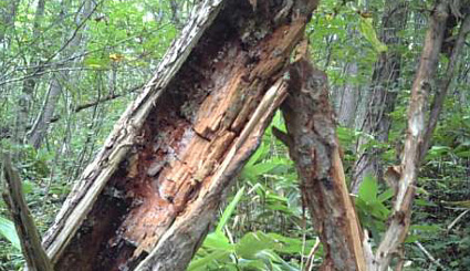 熊さんが木をへし折り蜂の巣を食べた跡がありました。