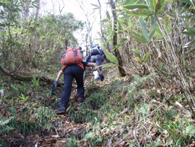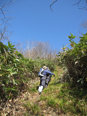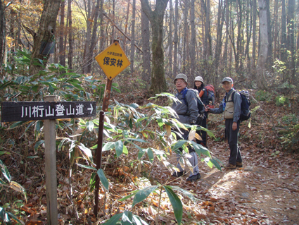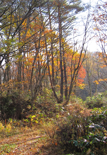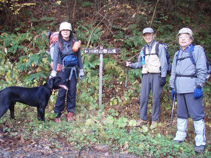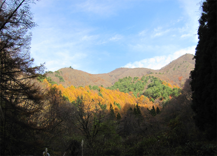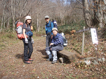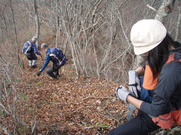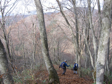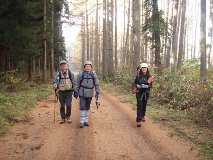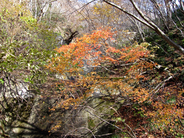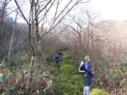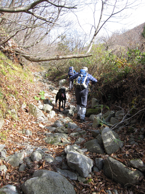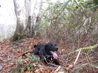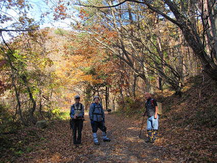 ![]() 秋晴れの川桁山稜線 今日は秋晴れの中 シーズン最後・・・? ・・かな・・の山へ行ってきた。 場所は猪苗代町にある川桁山です 山仲間4名とLOVEがお供で賑やかな登山でした 先頭になるLOVEは元気いっぱいだ! 沢が在れば沢に入り 急斜面もお構いなしに上り下り 小鳥や獣道に興味があるらしく素早い動きで山頂へ 私達はのんびりキノコを採りながらの歩きでした 山頂は展望も良く眼下に猪苗代湖を見て北に安達太良山〜吾妻の峰が横たわる 西に磐梯山が鎮座する姿は雄々しく青空に両手を広げてるようでした 山頂休憩後はブナ林の峰を西に下り川桁山名物の三十八転び坂です 一番多く転んだメンバーは8回 他のメンバーもそれなりに転ぶ姿在り・・・(笑) 観音寺登山口より登り内野部落へ下山する 途中でナメコやシメジそして季節外れのクリタケなどが採れました ![]() 林道を進むメンバー(Sadaさん Ariさん Gonちゃん) 篭を背負うSEI 観音寺の脇を通り林道を進みます 車も楽に通れる様な広い林道は歩きやすく整備されてた SEIはいつものようにキノコ狩りを兼ねた登山で長靴スタイルは定番かな・・・(笑) ![]() 今日はLOVEもお供です 秋色のカラマツ林 観音寺川に沿うように林道が在り・・・ 雑木林と交互に現れる唐松林に太陽の日が降り注ぎ黄金色の光が放されてた。 ![]() 林道が続きます コントラストが目映い山 道標に沿って確実に山頂方面へと進むと空間から見事な絵が現れる 周りを縁取りされた空間はお見事と絶賛出来る光景でした ![]() モミジが元気だ! 林道も此処まで! 周りの木々が葉を落とした中で 私達を待ってくれたかの様にモミジの木が鮮やかだった 林道も終わる所に丸太のベンチが在り Ariさんが腰を下ろして休憩です ![]() 木々の葉が次第に消える* 渓の流れも此処まで* 登山道らしくなってきた道は沢からも離れ稜線へ向かいます ![]() 登山道から〜沢道へ 道が無くなり沢を利用したコースを進む! ![]() 背丈ほど在る笹の急坂を登ると稜線へ! 沢から急坂の道を30分位登りますと稜線へ出る 稜線で一呼吸入れて またまた急坂の道が続く・・・・ 木々の葉が落ちないと見えない小田峠の道を眼下に見て最後の踏ん張りだ! ![]() 稜線からの展望(吾妻の峰) 天狗角力取山(SEI & LOVE) コルから見る展望は限られる一コマです ![]() 最後の登りです。。。 里山と思って甘く見ると手強い川桁山 急坂の連続にアルバイトを強いられました・・・(笑) ![]() 稜線へ出ると磐梯山の姿! 山頂(Ariさん〜Gonちゃん〜Sadaさん) 稜線から磐梯山の姿を確認できる所まで来ると山頂はすぐ其処だ! 10分程で山頂到着です 到着と同時にコンビで買った弁当をツマミに冷えたビールでカンパ〜イ (^-^) 今時期に冷たいビールがこれほど美味しく頂けるのも穏やかな秋晴れのお陰様です 30分の休憩では展望とAriさんの高級ウイスキーを美味しく頂きました ![]() 眼下の猪苗代湖 寛ぐLOVE 眼下の猪苗代湖を眺めて下山開始! やや雲が多くなってきた午後の一時 遠望は霞み視界に入るのは麓の風景と足下に広がる落ち葉の絨毯でした。 ![]() 新しい登山道が出来た(ふるさと林道へ) いよいよ38転び坂です 38転び坂にかかる場所に見慣れない道標が在るではないか・・? なんだ此はと覗くと何と新しいコースが出来たようです 「ふるさと林道」リステル〜川桁コースと書かれてた 前回来たときには無かった道標だ 次回は此処を歩いてみようと新しいコースを眺めて下りました。 ![]() 写真では解りませんが名物滑り坂ですよ〜 38転び坂は名前の通り滑り転びます 雨の時などは危険な道と思う 濡れてなくても木々の根が落ち葉に隠れて足下が不安定だ 夏道なら張り巡る木の根も見えるだろうが落ち葉に隠れた根は気持ちよく滑りキケンでした・・・苦笑 ![]() 麓の紅葉は最後の色合いを出してた LOVEの食事 季節外れのクリタケ・・? 無事に林道に出た私達はキノコ狩りを楽しみながら車のデポ地まで進む 途中にはナメコやシメジ・ムキタケ・・季節外れのクリタケなども収穫できました 参加のAriさんSadaさんGonちゃん秋晴れの楽しい山歩きでしたね! またご一緒いたしましょう ・・・SEI・・・ 戻る |