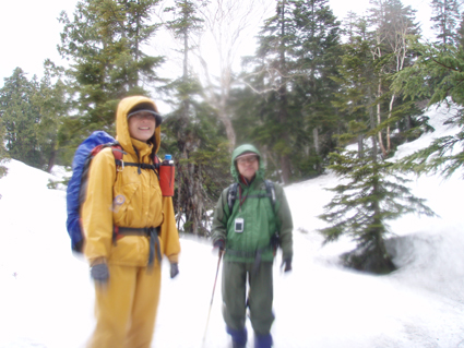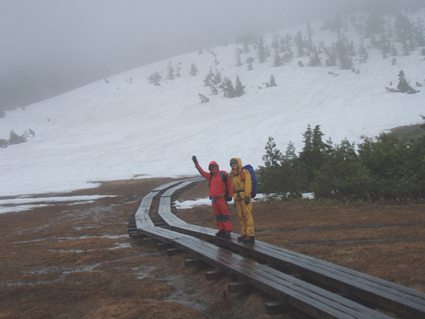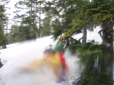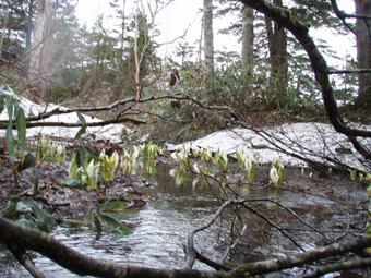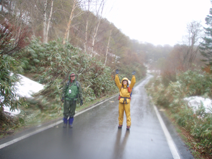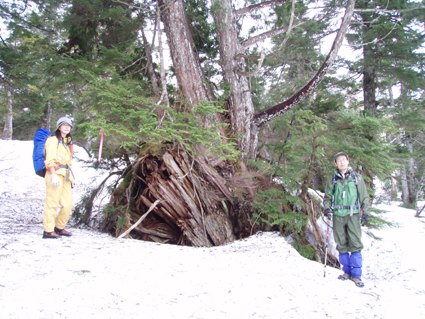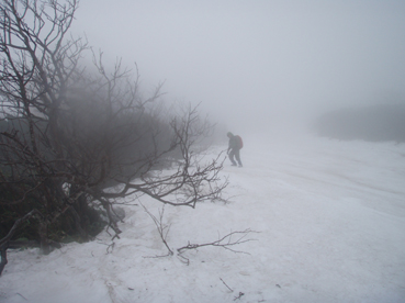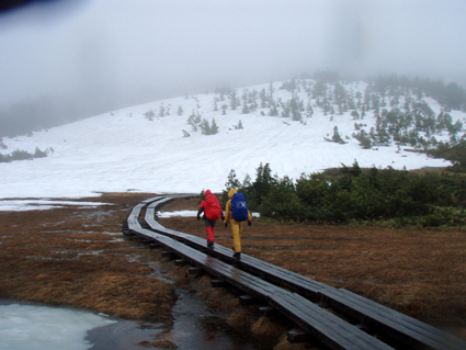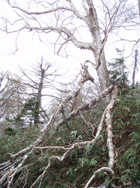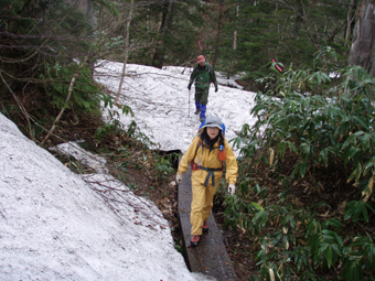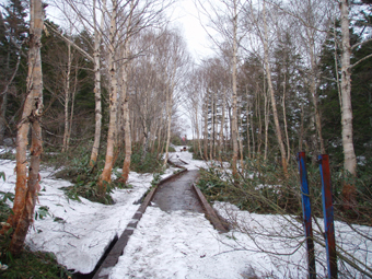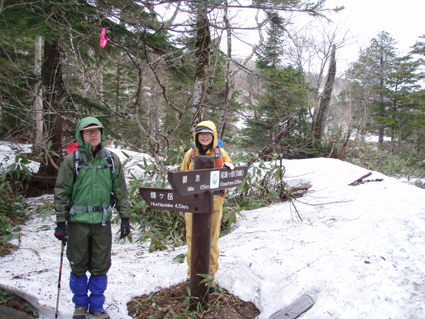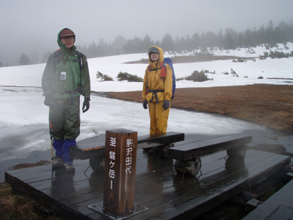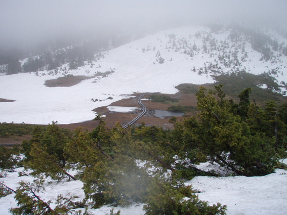 ![]() 御池登山口(一匹さん・Gonちゃん) 分岐の様子 16日の午後に郡山を出る まだ雨が落ちてこないが怪しい空模様です 田島を通過する頃は車の窓にポツリポツリと・・・ 御池駐車場には午後四時到着 待ち合わせの一匹さんは既に駐車場にいました 早々に宴会の準備に入りタープ&テントを張る と同時くらいに雨が落ちてきました 翌朝は雨の中 テント&タープを撤収 御池駐車場登山口から登りました 広沢田代までは夏道と残雪歩きの繰り返しです ここから先は雪がほぼ繋がっており雪原を歩くがツボ足では滑り アイゼンが必要でした 熊沢田代からは風も強くガスで視界も悪い 山頂直下で展望のないピークを踏まなくても良いと折り返す 下山は熊沢田代から東田代のコースを降りた 何故かと言うと 何時も御世話に成ってるHAMAさん紹介の燧の主に会いたいからです 多分これかなと言う主を写真に収め谷筋を降り沼山峠の林道に出ました。 ![]() 咲き始めのミズバショウ 夏道が出てます 雪解けの湿原にはミズバショウが咲き始める 残雪と夏道が交互に現れる登山コース 沢には雪解水が勢いよく流れてます ![]() ダケカンバが無惨に折れてた 幹が太い登りの主・・? 登山道の脇にダケカンバの巨木が 雪の重みに耐えることが出来なかったのか無惨に折れてた 残雪の隙間には待ちかねたように笹や植物の姿が見られる ![]() 広沢田代の道標 熊沢田代への登り 急斜面に足を取られ滑りながらも広沢田代に到着 湿原の木道も現れ雪解けの早さを感じた 見上げればガスに揺れる景色・・・ここからは雪渓が繋がってる様に見える ![]() 熊沢田代にて 木道が出てる湿原 間もなく高山植物の花々が顔を出してくれるでしょう ![]() 熊沢田代到着(一匹さん・Gonちゃん) ガスが出てきました 熊沢田代に到着した頃からガスと風が強まり 燧の姿を見ることは出来ない 気温も標高を上げるに従ってドンドン下がり体温が奪われた ![]() 熊沢田代を振り返る 登る途中でガスが消えるのを待ち熊沢田代を写真に収めた ![]() 風も出てきました 雨も大粒に!(標高2254m地点) 標高2000mを超し オープンバーンの雪渓を登るがコースアウト ピークを目指し藪超えだ! 藪超えは10m位だが体力が奪われる 二度目の藪超え後 強風とガスで展望のない山頂は踏まなくても良いと 標高2250mで折り返すことにした ![]() 折り返し休憩地点(2050m)で昼食 大杉岳がぼんやりと見えてきた 折り返し地点から標高を下げ樹林帯で飯の時間にする いつもなら一番に出てくるビールの姿 今日の休憩には寒さの為か缶の姿を見ることが出来ませんでした・・・笑 下山時は雨も強くなりカメラのレンズに水滴が溜まり 拭いても拭いても写真を上手く取れません! ![]() 眼下にメラッパシ田代 雨の中を下山 下山コースは東田代からメラッパシ田代へと降りた 残雪期にしか見ることの出来ない燧の主(古木)に会うためです・・が・・・主と思って写真に収めたのは・・・? ![]() 岩に鎮座する巨木 林道に出ました 大岩に鎮座する古木 しかしHAMAさんのHPの写真を見ると違うのが解る どうやらコース取りがずれたようです 今年も見ることが出来なかったが次シーズンは会いたいと思います 雨・ガス・強風の中 ご一緒しました 一匹さん・Gonちゃん前夜祭から大変楽しく過ごす事が出来ました 山頂には又の機会に行きましょう・・・SEI・・・ 前夜祭へリンク 戻る |