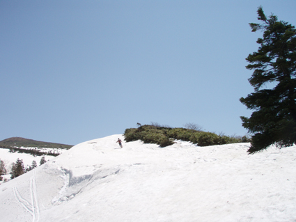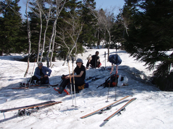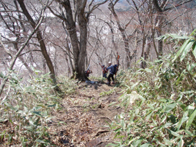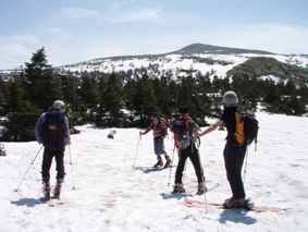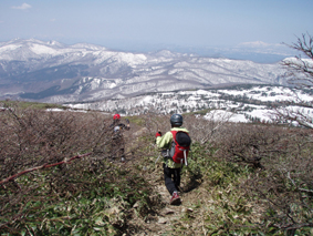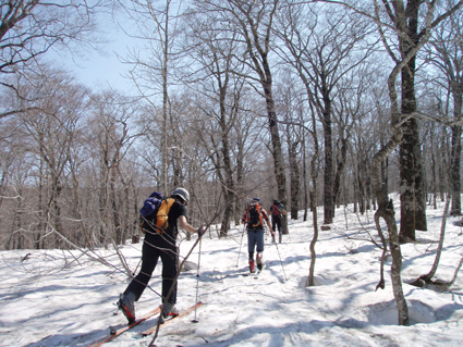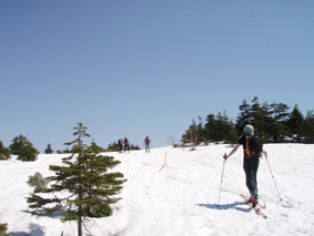 ![]() 田代平より乳頭山 GW最後の滑りは乳頭山です 昨日の宴会疲れもなく元気に起床 乳頭山登山口へ来た 乳頭温泉駐車場は満杯で仕方なく一台を別の駐車場へデポし出発。 ![]() 乳頭温泉登山口(山男さん・Mさん・Gonちゃん・Swさん) ブナ二次林を登る 三日目で初めて朝から太陽の日差しが出てる 登山口には残雪もなくしばらく歩きかなと登り始めた 直ぐに雪床が現れたがそれも束の間で板を担ぐ 最初のピーク938mを下ると雪原歩きだ! ![]() 木陰で休憩です 田代平 何処までも続くブナ林に強い日差しが降り注ぎ 汗が容赦なく流れ目に入り痛い 拭いても拭いても流れる汗に頭にかぶったタオルは絞れるほどです 雪原はザラメの雪が締まってて歩きやすく 木陰が在ると立ち止まり日差しを避ける。 ![]() 山荘の屋根が見える 目指すピークはすぐ其処 真っ青な空 輪郭の綺麗な山々 白銀の山肌と GW最後の滑りに花を添えてくれてるような素晴らしい日になりました ![]() 森吉山方面の展望 白銀の駒 1400m分岐から振り返ると眼下には田代平の雪原が広がり遠望には森吉山・・?が浮かんで見えた! ![]() 乳頭山(切れ落ちた南斜面) 岩手山 登山道からピークの南斜面を覗くと今にも崩れ落ちそうな断崖絶壁が見え 山頂では360度の展望を楽しむことが出来ました ![]() 眼下に見える沼 駒ヶ岳が雄々しく! 山頂からは滝ノ上温泉への縦走路や駒ヶ岳のルートを有視界で確認できる 東には岩手山 流れるように北に延びる稜線の中に初日に行った八幡平のなだらかな山容が太陽に映し出されてた。 ![]() 剱をかざし戯ける山男さん 山頂(Gonちゃん・Swさん・山男さん・Mさん) 山頂の休憩は雪で冷やされたビールがお供です 缶を抜く乾いた音が山頂にながれるプシューの5連発でカンパイ〜 おつまみのゆで卵や定番の魚肉ソーセージが味を増し口に飛び込む 此が山頂の味や!と岐阜なまりの響き良い声が聞こえた。 食べ終わると山男さんが剱を両手にGonちゃんの背後に回り振り上げた”絶体絶命のGonちゃん” キャーと悲鳴を上げる 振り向けば山男さんの戯けた顔が在りました・・・(笑) ![]() (SEI・Swさん・山男さん・Mさん) 山頂直下 大展望の山頂休憩も終わり下山です 山頂直下の夏道を下り板をデポした場所に着いた そこでSEIが捜し物 無い ない ない 何探してるの 手袋がないのだ 「山頂で外した手袋が」 思い出しました山頂に忘れてきたのです 悲しいかな言うまでもなく二度目の山頂行きと成りました ![]() 稜線を滑降する山男さん 最後は夏道を歩く 下りは早く気持ちの良い滑りだ! オープンバーンから降り小屋の前を通過し林を縫うように滑降すれば 残雪の無い場所に着く そこは登山口の真上です 素晴らしいGW北東北遠征山スキーも終結の時を迎えた 雨も降らずに三日間 山の神様有り難うございました感謝感謝です。 ![]() ショウジョウバカマ ミズバショウ 咲いてた花です ![]() 孫六温泉へ下山 ミズバショウの群生 元気に登山口に着きました ![]() 秘湯(鶴の湯) 登山口より鶴ノ湯へ移動し入浴です 鶴ノ湯は脱衣所も湯槽もごちゃごちゃ 人 人 人 で秘湯巡りの観光客か・・? 凄い人混みでした 三泊四日の山旅にご一緒いただきました皆さん 山男さん・Mさん・Swさん・Gonちゃん有り難うございます お陰様で思い出多い旅になりました ・・・SEI・・・ 戻る |