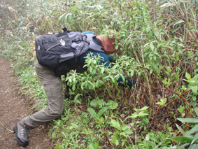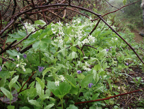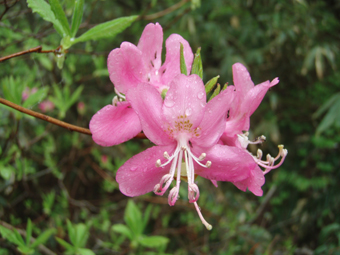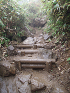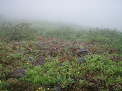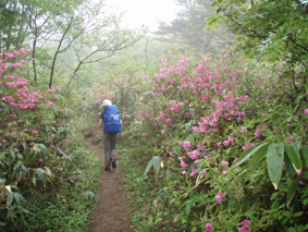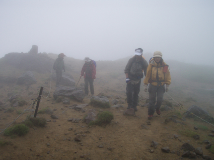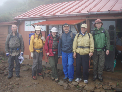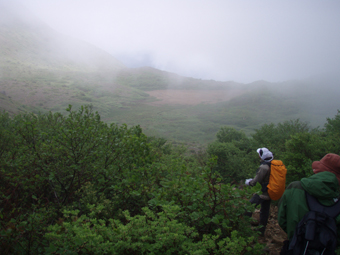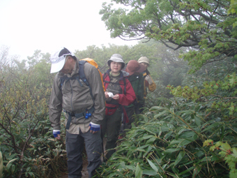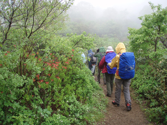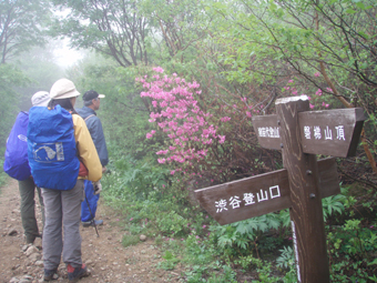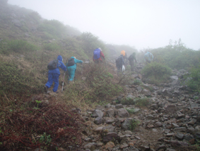 ![]() 赤埴林道登山口にて 綺麗ですね! (Nakaさん・Nabeちゃん・Zenちゃん・Yukariちゃん・一匹さん・Gonちゃん) 霧雨の降る赤埴登山口を出発した 沼ノ平を通過する頃には雨も強めになるが気にしないと元気だ 地元の方が山菜を篭いっぱいに詰めて下山してくる姿を見て 食べれる山菜を教えていただき早速 山肌を物色する 登山道にはヤマツツジやヤシオが鮮やかにガスの中に浮かび綺麗だ 足下には可愛い白い恋人(小さな花)が並んで登山者を楽しませてくれた ![]() 登山道のツツジ 林道分岐 ジダケを探す 登山口から山肌を飾るツツジ 雨に濡れた花は艶があり生き生きとしてます 私達は花に引かれて立ち止まる回数が多くなる ![]() ジダケ探し 道標 ジダケを見つけては藪に入り あるあると喜びの声が聞こえて来ます 地元の人に教えていただいたドウホも少し頂く 雨が降り出した 道に咲く花 沼ノ平の近くになると少し強くなる雨 此処でNabeちゃんの壊れたエンドレステープが流れる 「雨がふったら〜 ぬれれば いいさ〜」と何回も繰り返される・・・(笑) ![]() 沼ノ平(少し奥に在る) 渋谷登山口の分岐 此処の沼ノ平道標は今まで何度も通った道ですが初めて知りました 案内板 櫛が峰の分岐へ ガスがなければ沼や櫛ヶ峰などが見られる位置ですが白一色の景色に終始しました ![]() 3合目(天狗岩の在る場所) 噴火壁の稜線 稜線に出ると風が強く気温も下がり寒く感じた 噴火口を覗くYukariちゃんとZenちゃん 怖〜〜〜〜い と足をすくめて戻る ![]() お花畑 標高1600mに在るお花畑はイワカガミを始め数種類の花が咲いてます ![]() 弘法清水小屋に到着です 弘法清水 (Zenちゃん・Gonちゃん・Yukariちゃん・Nabeちゃん・Nakaさん・一匹さん) 弘法清水に着くと登山者でごった返す 雨にもかかわらず多くの登山者の姿があり 磐梯山の人気を垣間見る事が出来ました ![]() 弘法清水から最後の登りだ! ミネザクラが満開でした 小屋に入れる様子もないので休まず山頂を目指します 登山道は濡れて滑りやすく注意が必要だ 先頭を行くリーダー Zenちゃん少しお疲れ気味・・? それとも昨日のオフ会で飲み過ぎたのか元気がないのが気に掛かる ![]() 山頂到着(一匹さん・Gonちゃん・Yukariちゃん・Zenちゃん・Nakaさん) 山頂に着いた眼鏡メンバーはレンズが曇り目が白く映る 風もあり寒く長居は無用と そそくさと下山しました ![]() 赤い実を付けた木 山頂(岡部小屋) ツバメオモトが咲いてました 山頂小屋の前は晴れてる日であれば多くの登山者で賑わう場所だ 今日は数人の姿を見るにすぎなかった 下山時に見つけた赤い実は何か・・? また一株のツバメオモトが目を楽しませてくれました 弘法清水まで下り小屋を覗くと何とか座れそうです 弘法清水小屋の管理人(吉田さん)に挨拶をして 人気のナメコ汁を出していただき昼食と成りました ジダケも入り最高のあじです 吉田さんご馳走様でした ![]() 一瞬ガスがとれた 分岐(下山時) 下山時にほんの一瞬ガスが飛んだ (眼下に見える沼が神秘的に浮かび上がる) ![]() 鏡沼 眼下に猪苗代の町が! 登りでは姿を現さなかった鏡沼が鮮やかなツツジ越に見える 此処でも晴れてれば磐梯山の影絵が見れるが今日の鏡には映ることは無かった 雨の中の登山でしたが楽しい一日でした 参加された皆さん 一部の人は二日酔いみたいでしたが山頂まで行かれて良かったですね! 次回の山も楽しみましょう ・・・SEI・・・ 戻る |