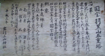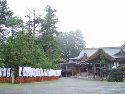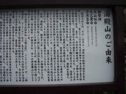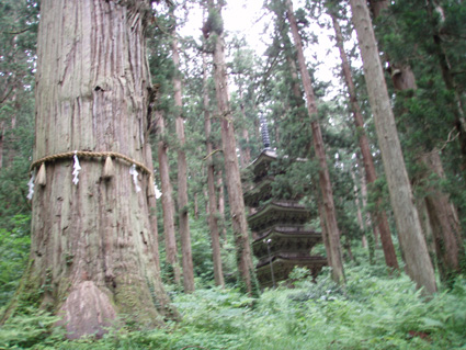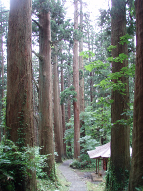 ![]() 羽黒山神社 出羽三山とは、羽黒山・月山・湯殿山の総称で、崇峻天皇の御子である蜂子皇子の開山である。 皇子は、蘇我氏の難を避け、海路を経て出羽の国に入られた。 そして三本足の霊烏の導くままに羽黒山に入り難行苦行の末、羽黒権現の御示現を拝し、 羽黒山頂に羽黒山寂光寺を建立して権現に奉仕したという。 次いで皇子は、月山、湯殿山を開き、両神を羽黒山に勧進して羽黒三所大権現と称した。 その後、皇子の御徳を慕い、加賀白山を開いた泰澄大師や修験道の祖と云われる役の行者、 また真言宗の開祖弘法大師、天台宗の開祖伝教大師とその弟子慈覚大師なども来山して修行したとも伝えられている。 こうして皇子修行の道は次第に発展して羽黒派古修験道となり全国に名を知られ、 時代を重ねるにつれ人々の厚い信仰を集めることとなった。 三山は神仏習合時代は真言宗を中心に八宗兼学の山として奉仕、江戸時代に入って 天台宗に改め奉仕してきたが、明治維新に際して神仏分離し、古への神奈備山にかえった。 延喜式によれば、月山神社は名神大社、出羽神社は小社に列せられた古社であったが、 明治維新の神仏分離を経て、月山神社は官幣大社に、出羽・湯殿山の両神社は国幣小社に列せられた。 さまざまな制度上の変革を経ても、人々の三山に寄せる信仰そのものは昔のままに持続され今日に及んでいる。 ![]() 本殿 杉並木 1400年余りの歴史を有し羽黒修験道の総本山として、