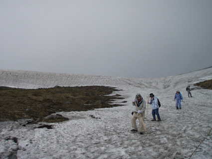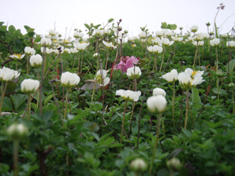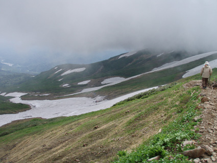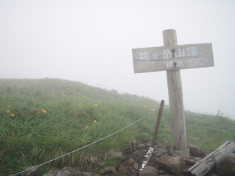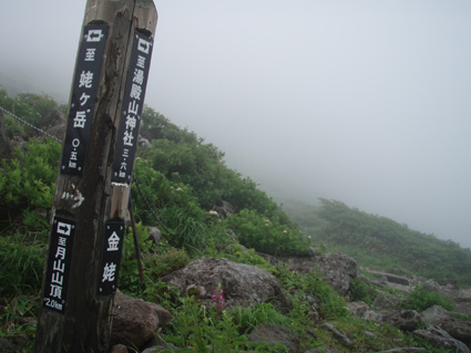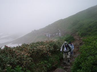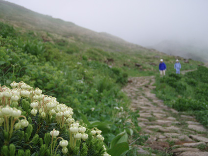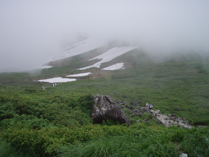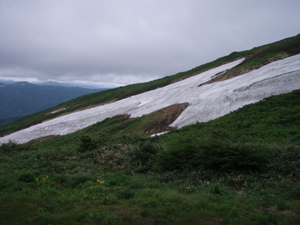 ![]() 姥沢駐車場より湯殿山 駐車場(後方は姥ヶ岳) 朝の内は晴れ間も見えたが駐車場に着くと怪しい雲が広がり始める 姥ヶ岳の後方に見えるはずの月山の姿を見ることが出来ない ![]() リフト乗り場 わんちゃんが居ました リフト乗り場に来ると登山者の姿で賑わいを見せ! 売店では軽アイゼンを求め装着の為のにわか講習会が繰り広げられてました ![]() ニッコウキスゲが盛りだ! リフトの下に咲くニッコウキスゲは正に盛りです ![]() 姥ヶ岳の残雪 残雪を登る リフト終点から見る稜線は分厚い雲の中に隠れ展望がない 姥ヶ岳の雪渓を登り山頂のお花畑に寄り道してから月山に行くことにした ![]() 山頂に咲くウサギギク 山頂(姥ヶ岳) 山頂の花は去年と比べると少なく感じるが気のせいか・・・・ 湿原には黄色い花のウサギギクが一面に咲いてました ![]() 雪渓を登る登山者 稜線から眼下を覗くと雪渓を登る登山者がアリの行列の様に見える ![]() 山に咲く花ー1 稜線には色とりどりの高山植物の花が咲き正に競演です ![]() 分岐の道標 ![]() 柴灯森から牛首へ 鍛冶小屋跡の地蔵さん ![]() 山に咲く花ー2 ![]() 山に咲く花ー3 ガスの中に山頂神社 山頂小屋 山頂小屋周辺にはクロユリの花が咲き 多くの登山者がカメラをかまえてた。 小屋は満員御礼の札こそ出てないが中に入ることが出来ない ・・・・凄い人です・・・・ 私達は山頂神社でお参りを済ませて小屋に戻ると先ほどの登山者の姿がまばらになってました 強風で体が冷えてた為 小屋では熱燗を頼み胃袋から暖めた うひゃ〜〜〜 たまんねい うめいのなんのって言葉になんねいや・・・・笑 (調子ついたSEIは何と一時間二十五分の大休憩です) ![]() 厚い雲が垂れ込める 下山時になっても厚い雲は去ることがなく標高1700m位から下が視界が利くようになる 雪解けの下からは新しい命がニョキニョキと出てます ![]() ![]() アオノツガザクラが登山道を彩る 下山時に可愛い白い花に見とれて暫く立ち止まりました ![]() 合宿スキー 雪渓を下る登山者 沢に残る雪渓の上で少年達の元気な合宿スキーの様子が展開されてた 姥ヶ岳の残雪は何時まで見ることが出来るのか初夏の陽気の中で根性の雪渓を後にしました。 戻る |