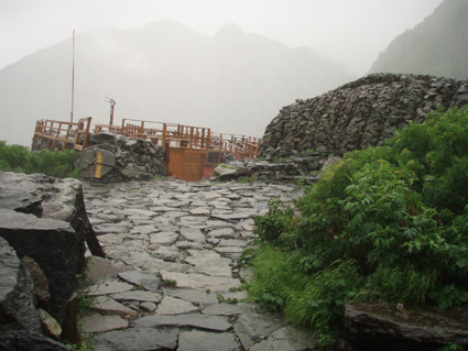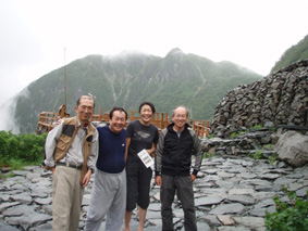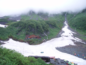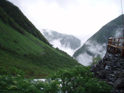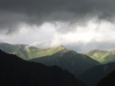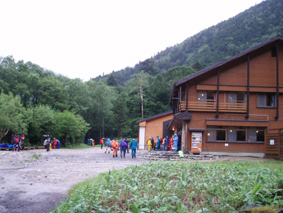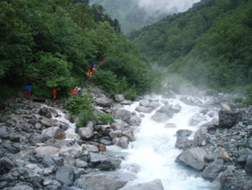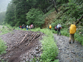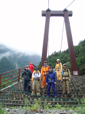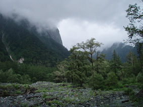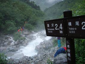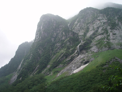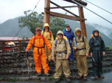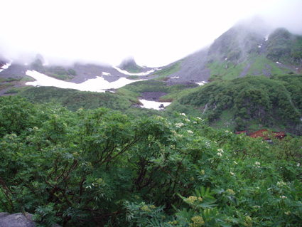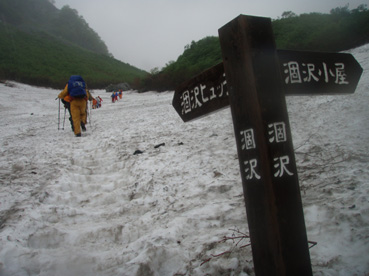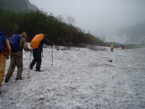 ![]() 沢渡(高桑荘) 上高地(カッパ橋にて) 「上高地から涸沢〜奥穂高へ」 19日AM5:30沢渡からタクシーで上高地へ着くと雨風が強くなる 予報では午後から天候が改善されるだろうとスタートしました 徳沢〜横尾へ着く頃になると風が強まり雲行きが悪く 本谷橋からさきは大粒の雨になる 雨具を通した水で体温が下がり寒さも感じるくらいです 涸沢雪渓に着く頃にはメンバーの足取りも重い 涸沢ヒュッテに着き昼飯にしようと外のテーブルに座るが横殴りの風で 飯を食べる環境にはない 小屋の中に入るが宿泊客でいっぱいです 小屋の主人に此からの天気予報を聞くと悪くなるでしょうと・・・ ここで参加メンバーと緊急打ち合わせ 厚く垂れ込めた雲と風雨が増す様子を眺め奥穂高岳山荘まで行くのを中止して 涸沢ヒュッテに泊まることにしました(山は逃げないと心に言い聞かせる) 個室に入り冷えきった体をストーブで温め身繕いを済ませた そうなれば 当然の様に宴会に入ります 小屋でゲットしたワイン&日本酒・焼酎でお疲れ様でした また来ましょうねと笑顔で時を過ごす (その時の外は叩きつける雨 横殴りの風です) 全員が中止したことに安堵の表情で暖かい部屋で美味しいお酒を頂く・・・・(*^_^*) 次の日は朝から青空が広がり素晴らしい穂高岳の展望を堪能いたしました 「山頂を踏まず初めての撤退」。。。 ![]() 道中の花ー1 ![]() 猿がお出迎え 明神池にて 雨が降る梓川沿いを明神池へと足を運ぶ 雨は強弱を付けて降り続く カメラが悪いのか腕が鈍ったのか其れとも雨の悪さかブレの画面が多くカッパ橋の写真は目まいがしそうだ! ![]() 道中の花ー2 ![]() 横尾大橋(Ariさん・Hodakaさん・Haruさん・Su−さん・Gonちゃん・Sadaさん) 横尾に着きガソリン(泡)を補給 生は無いが贅沢は禁物・・・ 展望はと言うと屏風の頭は完全に雲の中に隠れてました ![]() 道中の花ー3 ![]() 横尾大橋 横尾谷に覆い被さる雲 道標 大橋を渡り横尾谷沿いに進み 岩小屋跡の分岐を過ぎると道端の花が賑やかになって来ました ![]() 道中の花ー4 ![]() 登山道を行くメンバー 屏風岩 屏風岩から流れる細い滝が一筋の曲線を作り出す 雨の副産物が思わぬ光景を魅せてくれた。 ![]() 道中の花ー5 ![]() 本谷橋 横尾本谷の様子 涸沢雪渓 本谷橋にさしかかると横尾本谷の水量が増し泡状の流れが勢い良く下ってゆく 此処からは徐々に斜度が増してくるが緩斜面で歩きにブレーキが係るほどではない しかし湿度が高く雨に濡れた体は体力の消耗が激しく 心なしか足取りが悪く・・・? 涸沢雪渓に着く頃には動きが鈍い姿がありました ![]() 道中の花ー6 ![]() 涸沢分岐 中央に涸沢小屋 雪渓に顔を出してる道標を左に取り涸沢ヒュッテに到着した 涸沢ヒュッテには多くの登山者が雨宿りをしてた 外のテーブルには人影が無く悪天候のため小屋の中は満員です ![]() 道中の花ー7 ![]() 涸沢ヒュッテにて 涸沢ヒュッテより北の風景 私達も小屋の中に入り奥穂高岳山荘まで行くか・・・? それとも・・・? と緊急会議! 結果 風雨が強いザイテングラードの登りは危険がいっぱいと此処で中止としました 中止の合図と共に個室に入り 暖房のスイッチを入れた 暖かい炎は心も体も生き返る ずぶ濡れの衣類を脱ぎ捨て着替えたメンバーは小屋の外へと飛び出した ![]() 道中の花ー8 ![]() 涸沢雪渓 束の間の稜線(大天井岳方面) ![]() 誰も居ない涸沢ヒュッテ展望台 お泊まりの小屋 涸沢ヒュッテの外は雨が止んだり降ったりと目まぐるしく変わる天候だ! 食事を済ませて小屋に戻り二次会が始まる 疲れた体が眠りを要求するのか一人又一人と眠りにつく 元気な数名がトタン屋根を叩く雨の音と横殴りの風の音をBGMに盛り上がりをみせた 外を見ると静まりかえったテーブルの場所で登山者が笑い声を上げて歓談する姿がありました 「此は幻想であります」 ・・・明日へ続く・・・ 20日へリンク |